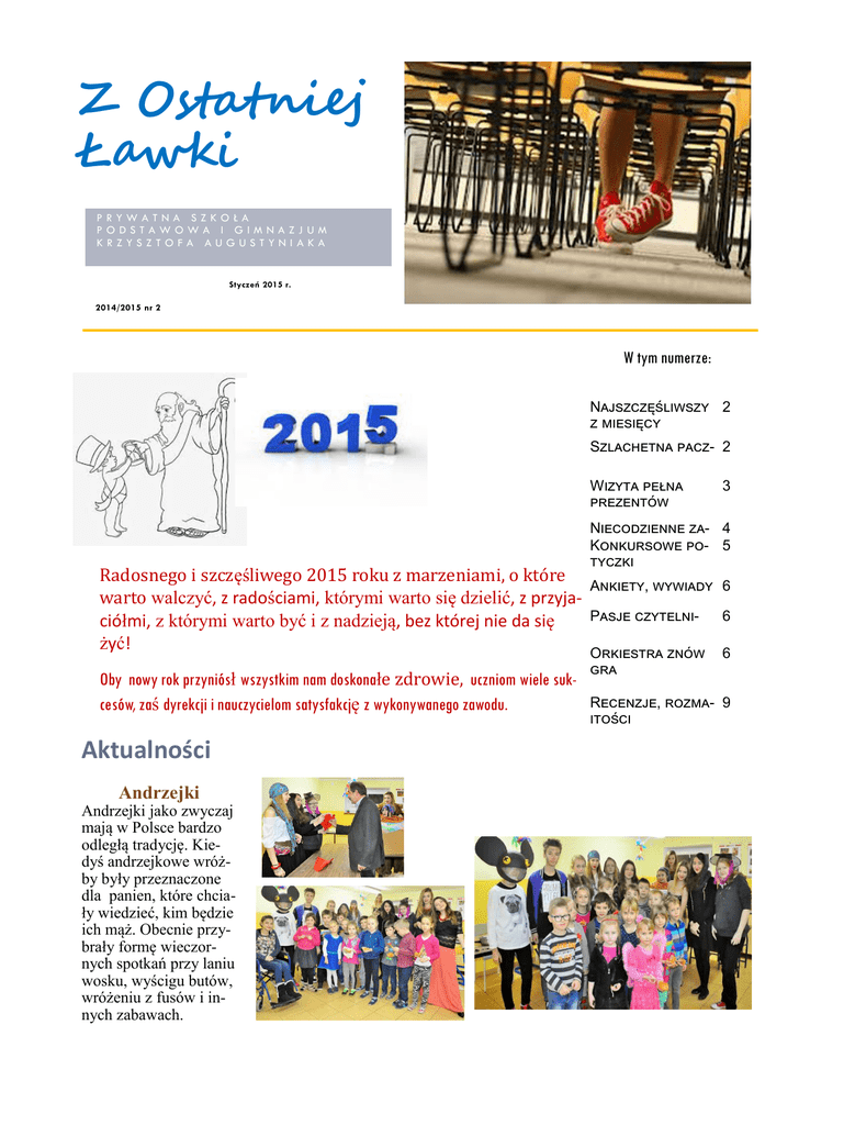 Z Ostatniej Ławki PRYWATNA SZKOŁA PODSTAWOWA I GIMNAZJUM KRZYSZTOFA AUGUSTYNIAKA Styczeń 2015 r. 2014/2015 nr 2 W tym numerze: Najszczęśliwszy 2 z miesięcy Szlachetna pacz- 2 Wizyta pełna prezentów Radosnego i szczęśliwego 2015 roku z marzeniami, o ktore warto walczyć, z radościami, którymi warto się dzielić, z przyjaciółmi, z którymi warto być i z nadzieją, bez której nie da się żyć! Oby nowy rok przyniósł wszystkim nam doskonałe zdrowie, uczniom wiele sukcesów, zaś dyrekcji i nauczycielom satysfakcję z wykonywanego zawodu. Aktualności Andrzejki Andrzejki jako zwyczaj mają w Polsce bardzo odległą tradycję. Kiedyś andrzejkowe wróżby były przeznaczone dla panien, które chciały wiedzieć, kim będzie ich mąż. Obecnie przybrały formę wieczornych spotkań przy laniu wosku, wyścigu butów, wróżeniu z fusów i innych zabawach. 3 Niecodzienne za- 4 Konkursowe po- 5 tyczki Ankiety, wywiady 6 Pasje czytelni- 6 Orkiestra znów gra 6 Recenzje, rozma- 9 itości Zorro W tym roku w naszej szkole spotkanie andrzejkowe przygotowali uczniowie klasy III gimnazjum i wywiązali się ze swego zadania znakomicie. Sprawili sobie odpowiednie kostiumy wróżów, cyganek i czarodziejów. Każdy z nas mógł poznać przepowiednie o swojej przyszłości, które wyniknęły z odpowiedniego układu kart, sentencji ukrytych w cukierkach. Los wskazywał, jakie zawody będziemy wykonywać; fusy i popiół to, czy będziemy bogaci i sławni, a „gadająca głowa” wskazywała, jakich wyborów mamy dokonać. Wśród tych ciekawych atrakcji nie mogło zabraknąć tradycyjnego lania wosku. Był klucz, były emocje i były bardzo ciekawe interpretacje woskowych rzeźb. Jednym słowembawiliśmy się doskonale. Kacper 4b W środę (10.12.2014) uczniowie klasy IVa, IVb, V i VI wybrali się do Teatru Muzycznego na spektakl ,,Zorro”. Zorro, podobnie jak Robin Hood, jest postacią znaną wielu pokoleniom. Młody Diego de la Vaga wraca po latach nauki do rodzinnego domu i dowiaduje się o okrutnych rządach komendanta miasta, kapitana Monastario. Nie może jednak otwarcie wystąpić przeciw zachłannemu komendantowi, więc -zgodnie z powiedzeniem: ,,Gdy nie możesz walczyć jak lew, bądź przebiegły jak lis” - nakłada maskę i pod pseudonimem Zorro (hiszp. lis) ze szpadą w ręku staje w obronie uciskanych. Przedstawienie bardzo się podobało. Zosia i Kacper 4b Najszczęśliwszy z miesięcy Dnia 12.12.2014. kółko teatralne naszej szkoły podstawowej przedstawiło widowisko „Najszczęśliwszy z miesięcy”. Była to historia braci miesięcy i ich ojca króla. Jeden z braci- Grudzień- znika w niewiadomych okolicznościach, wszyscy go szukają. Okazuje się, że uciekł, ponieważ w jego miesiącu nic się nie dzieje. Ucieszony z odnalezienia syna król postanawia umieścić w jego miesiącu Boże Narodzenie. Przedstawienie kończy się śpiewaniem przez dzieci kolęd. Uczestnicy koła teatralnego stanęli na wysokości zadania, swoje role odegrali bardzo dobrze. Wszyscy wystąpili w pięknych strojach- na scenie pojawili się nie tylko bracia miesiące i król, ale także postacie z szopki bożonarodzeniowej, aniołki i zwierzęta. Spektakl wprowadził widzów w nastrój świąt i był doskonałą okazją do poznania talentów artystycznych naszych młodszych koleżanek i kolegów, którzy pracowali pod czujnym okiem pani Małgorzaty Sas. Szlachetna Paczka W tym roku klasy 4-6 i uczniowie gimnazjum sprzedawały smakołyki w ramach akcji „Szlachetna Paczka”. Udało im się uzbierać 1516 zł. Zebrane pieniądze zostały przeznaczone na zakup zabawek, gier, ubrań, pościeli, sprzętu gospodarstwa domowego potrzebnych rodzinie, którą wspieramy. Dzięki zaangażowaniu pani Milenki i wszystkich darczyńców obdarowane osoby miały radosne święta Bożego Narodzenia. Jaś i Hubert IVb Drodzy darczyńcy i wolontariusze ! Dziękuję za całe dobro, które uczyniono w ramach akcji „Szlachetna Paczka”. Zbiórka pieniędzy na ten cel trwała od 03.11.2014 – 05.12.2014. Wszystkie klasy brały udział w sprzedaży smakołyków przygotowanych przez siebie oraz loterii fantowej, w której każdy los wygrywał. W rezultacie udało nam się zebrać 1516zł. Kupiliśmy za zebraną kwotę środki czystości, artykuły szkolne, żywność długoterminową, ubrania, buty, poduszki, koc, pościel, blender, czajnik elektryczny. Zostały ofiarowane przez uczniów zabawki oraz gry planszowe i komputerowe. Obdarowana rodzina nie kryła wzruszenia i łez. W ramach wdzięczności została wręczona kartka świąteczna i przekazane życzenia na Nowy Rok. Ale to nie koniec szkolnych akcji charytatywnych. Zebrane zabawki, czekolady, rower, komputer, gry planszowe oraz książki przekazane zostały Z.O.W. ‘’Ochronce Bałuckiej’’ prowadzonej przez Siostry Salezjanki ul. Brauna 5, dzieci również podziękowały nam samodzielnie wykonaną kartką świąteczną. Część darów, tj. ubranka, pieluchy, smoczki oraz zabawki, zawieźliśmy do Domu Samotnej Matki. Przytulanek, misiów było tak dużo, iż postanowiliśmy również obdarować potrzebujące dzieci z parafii św. Maksymiliana. Zostały także przekazane bony, które ofiarowaliśmy trzem bardzo potrzebującym wsparcia rodzinom. Oczywiście, nadal zbieramy makulaturę, aby wspierać akcję budowy studni w Burkina Faso, bardzo dziękuję za każdy skrawek papieru. Ostatnią wiadomością z działań charytatywnych jest to, że tylko przez trzy miesiące udało się nam zebrać 51 kg nakrętek plastikowych, za które uzyskaliśmy 41 zł i przeznaczyliśmy tę sumę na rehabilitację Kacperka Strzyżewskiego. Za całą pracę, zaangażowanie moim wolontariuszom, rodzicom z serca dziękuję i oczywiście proszę o więcej. Opiekun koła charytatywnego - Milena Tomasiak Str. 3 Wizyta pełna prezentów Nastrój świąteczny w naszej szkole trwa zawsze od pierwszych dni grudnia. W hallu pojawia się wtedy duża i piękna choinka, da