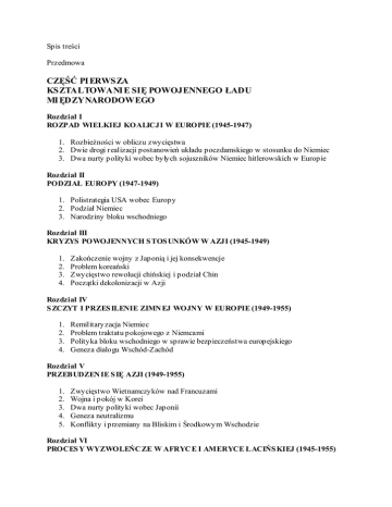 Spis treści Przedmowa CZĘŚĆ PI ERWSZA KSZTALTOWANI E SIĘ POWOJENNEGO ŁADU MI ĘDZYNARODOWEGO Rozdział I ROZPAD WIELKIEJ KOALICJI W EUROPIE (1945-1947) 1. RozbieŜności w obliczu zwycięstwa 2. Dwie drogi realizacji postanowień układu poczdamskiego w stosunku do Niemiec 3. Dwa nurty polityki wobec byłych sojuszników Niemiec hitlerowskich w Europie Rozdział II PODZIAŁ EUROPY (1947-1949) 1. Polistrategia USA wobec Europy 2. Podział Niemiec 3. Narodziny bloku wschodniego Rozdział III KRYZYS POWOJENNYCH S TOS UNKÓW W AZJI (1945-1949) 1. 2. 3. 4. Zakończenie wojny z Japonią i jej konsekwencje Problem koreański Zwycięstwo rewolucji chińskiej i podział Chin Początki dekolonizacji w Azji Rozdział IV S ZCZYT I PRZES ILENIE ZIMN EJ WOJNY W EUROPIE (1949-1955) 1. 2. 3. 4. Remilitaryzacja Niemiec Problem traktatu pokojowego z Niemcami Polityka bloku wschodniego w sprawie bezpieczeństwa europejskiego Geneza dialogu Wschód-Zachód Rozdział V PRZEBUDZEN IE S IĘ AZJI (1949-1955) 1. 2. 3. 4. 5. Zwycięstwo Wietnamczyków nad Francuzami Wojna i pokój w Korei Dwa nurty polityki wobec Japonii Geneza neutralizmu Konflikty i przemiany na Bliskim i Środkowym Wschodzie Rozdział VI PROCES Y WYZWOLEŃC ZE W AFRYC E I AMERYCE ŁACIŃS KIEJ (1945-1955) 1. 2. 3. 4. M iejsce arabskiej Afryki w planach mocarstwowych ZagroŜenie imperiów kolonialnych w Czarnej Afryce Neokolonialna geneza systemu międzyamerykańskiego Dominacja USA w systemie międzyamerykańskim CZĘŚĆ DRUGA POD ZNAKIEM KONFRONTACJI MI ĘDZYBLOKOWEJ (1955-1969) Rozdział VII KS ZTALTOWANIE PODS TAW RÓ WNOWAGI S IŁ MIĘDZY WS CHODEM A ZACHODEM (1955-1962) 1. 2. 3. 4. Napiecia wokół problemów niemieckich Dylematy wyścigu zbrojeń Utrwalanie struktur subkontynentalnych Trudności dialogu Wschód-Zachód Rozdział VIII PRZEBUDZEN IE S IĘ AFRYKI (1955-1963) 1. 2. 3. 4. Wojna o niepodległość Algierii Przełom w procesie dekolonizacji Czarnej Afryki Kryzys kongijski Współpraca międzynarodowa państw afrykańskich Rozdział IX POCZĄTEK ODPRĘśEN IA W S TOS UNKACH WS CHÓD-ZACHÓD (1962-1969) 1. 2. 3. 4. Uzgodnienia hamujące wyścig zbrojeń Rozwój rzeczowej współpracy między państwami Wschodu i Zachodu Przesilenie w bloku atlantyckim Problemy bloku wschodniego Rozdział X PRZEWARTOŚ CIOWANIA W S TOS UNKACH MIĘDZYAMERYKAŃS KICH (19551969) 1. 2. 3. 4. Przełom w systemie międzyamerykańskim Kontrowersje wokół rewolucji kubańskiej Interwencja USA w Republice Dominikańskiej Walk o dekolonizacją Strefy Kanału Panamskiego Rozdział XI NOWA RO LA AFRYKI (1963-1969) 1. Walka OJA o pełną dekolonizację kontynentu 2. Grupa państwa afrykańskich na forum ONZ 3. Rozwiązywanie konfliktów i kryzysów afrykańskich Rozdział XII WS TRZĄS Y I NAPIĘC IA W AZJI (1955-1969) 1. 2. 3. 4. Przeszkody w normalizacji stosunków na Dalekim Wschodzie Konflikty na subkontynencie indyjskim Wojna wietnamska Konflikty w Azji Południowo-Zachodniej CZĘŚĆ TRZECIA INSTYTUCJONALI ZACJA NEGOCJACJI I ODPRĘśENIA (1969-1979) Rozdział XIII DIALOG RAD ZIECKO-AMERYKAŃS KI (1969-1979) 1. 2. 3. 4. Przesłanki dialogu SALT I SALT II Dialog i rywalizacja Rozdział XIV NORMALIZACJA S TOS UNKÓW W EUROPIE (1969-1975) 1. 2. 3. 4. 5. Ewolucja dwóch bloków Normalizacja stosunków RFN z państwami Układu Warszawskiego Uregulowanie problemu Berlina Zachodniego Powodzenie KBWE Początek rokowań wiedeńskich Rozdział XV PRZES ŁANKI S YS TEMU BEZPIEC ZEŃS TWA I WS PÓŁPRAC Y W EUROPIE (1975-1979) 1. 2. 3. 4. Torowanie dróg ogólnoeuropejskiej współpracy gospodarczej Pozaekonomiczna współpraca ogólnoeuropejska Weryfikacja KBWE Próby rozciągnięcia odpręŜenia miedzy blokami na sferę wojskową Rozdział XVI TRUDN E OS IĄGANIE POKOJU W AZJI (1969-1979) 1. 2. 3. 4. 5. Wojny i przemiany indochińskie Konsekwencje wojny bengalskiej Rywalizacja wielkich mocarstw na Dalekim Wschodzie Nowe etapy kryzysu bliskowschodniego Konflikty na Środkowym Wschodzie Rozdział XVII DĄśEN IA DO NORMALIZACJI S TOS UNKÓW NA KONTYNENCIE AMERYKAŃS KIM (1969-1979) 1. Walka Ameryki Łacińskiej o uniezaleŜnienie się od USA 2. Umacnianie się orientacji prosocjalistycznej w Ameryce Łacińskiej 3. Wzrost pozycji amerykańskich mocarstw regionalnych 4. Próby zrównowaŜenia systemu międzyamerykańskiego Rozdział XVIII WYS IŁKI NA RZEC Z UNOWOCZEŚ NIEN IA S TOS UNKÓW W AFRYC E (19691979) 1. Walka przeciwko resztkom systemu kolonialnego 2. Rozwiązywanie konfliktów afrykańskich 3. WzmoŜona aktywność międzynarodowa państwa afrykańskich Rozdział XIX WZROS T NAPIĘĆ W S TOS UNKACH GLOBALNYCH (1979-1985) 1. M iędzyblokowy wyścig zbrojeń 2. Dyplomacja i propaganda antyzbrojeniowa ZSRR 3. Ideologizacja stosunków gospodarczych Rozdział XX UTRWALANIE PODZIAŁU EUROPY (1979-1985) 1. 2. 3. 4. Wysiłki na rzecz konsolidacji NATO Rozszerzenie EWG Propozycje Układu Warszawskiego w sprawie odpręŜenia w Europie Próby integrowania gospodarek planowych Rozdział XXI NOWE NAPIĘC IA W S TOS UNKACH OGÓLNOEUROPEJS KICH (1980-1985) 1. 2. 3. 4. 5. Utrwalenie procesu KBWE Dwie tendencje w rokowaniach wiedeńskich OŜywienie idei stref bez broni masowego raŜenia Nowy etap kontaktów między EWG a RWPG Ponowne stawianie „otwartej kwestii niemieckiej” Rozdział XXII TRUDN E PROBLEMY W S TREFIE AZJI I PAC YFIKU (1979-1985) 1. 2. 3. 4. 5. 6. 7. Utrwalenie wrogości między państwami koreańskimi M iędzynarodowe konsekwencje chińskiej polityki modernizacji i otwarcia Nowe problemy strefy Pacyfiku Zabiegi o stabilizację sytuacji na Półwyspie Indochińskim Problemy współpracy państw Azji Południowej Ścieranie się dąŜeń wojennych i pokojowych w Azji Środkowej Nowy etap walk o rozwiązanie kryzysu bliskowschodniego Rozdział XXIII NOWE NAPIĘC IA W S TOS UNKACH MIĘD ZYAMERYKAŃS KICH (1979-1985) 1. 2. 3. 4. 5. Napięcia w stosunkach gospodarczych Spory wokół rewolucji nikaraguańskiej Węzeł konfliktów w Ameryce Środkowej Ko