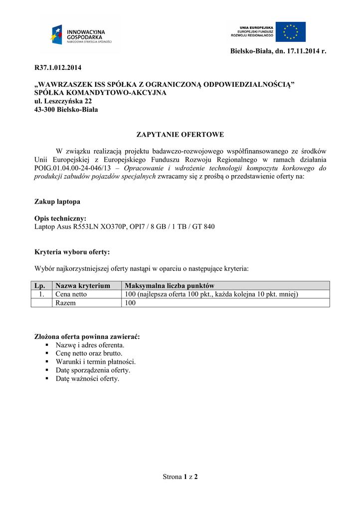 Bielsko-Biała, dn. 17.11.2014 r. R37.1.012.2014 „WAWRZASZEK ISS SPÓŁKA Z OGRANICZONĄ ODPOWIEDZIALNOŚCIĄ” SPÓŁKA KOMANDYTOWO-AKCYJNA ul. Leszczyńska 22 43-300 Bielsko-Biała ZAPYTANIE OFERTOWE W związku realizacją projektu badawczo-rozwojowego współfinansowanego ze środków Unii Europejskiej z Europejskiego Funduszu Rozwoju Regionalnego w ramach działania POIG.01.04.00-24-046/13 – Opracowanie i wdrożenie technologii kompozytu korkowego do produkcji zabudów pojazdów specjalnych zwracamy się z prośbą o przedstawienie oferty na: Zakup laptopa Opis techniczny: Laptop Asus R553LN XO370P, OPI7 / 8 GB / 1 TB / GT 840 Kryteria wyboru oferty: Wybór najkorzystniejszej oferty nastąpi w oparciu o następujące kryteria: Lp. 1. Nazwa kryterium Cena netto Razem Maksymalna liczba punktów 100 (najlepsza oferta 100 pkt., każda kolejna 10 pkt. mniej) 100 Złożona oferta powinna zawierać: Nazwę i adres oferenta. Cenę netto oraz brutto. Warunki i termin płatności. Datę sporządzenia oferty. Datę ważności oferty. Strona 1 z 2 Oferta może zostać dostarczona: • osobiście do siedziby firmy: „WAWRZASZEK ISS SPÓŁKA Z OGRANICZONĄ ODPOWIEDZIALNOŚCIĄ” SPÓŁKA KOMANDYTOWO-AKCYJNA, ul. Leszczyńska 22, 43-300 Bielsko-Biała, • pocztą na ww. adres siedziby firmy, • pocztą elektroniczną na adres: [email protected], • faxem na nr 33 81 62 270. Oferta powinna być ważna co najmniej do: 31.01.2015 r. Termin składania ofert upływa w dniu: 27.11.2014 r. Szczegółowe wymagania i dokumentacja projektowa znajdują się w siedzibie Spółki. Zapraszamy w tej sprawie do kontaktu z panem Marcinem Starczak, który udzieli informacji, tel.: 33 82 70 830, e-mail: [email protected]. Zamawiający zastrzega sobie prawo do nie rozstrzygnięcia postępowania ofertowego bez podawania przyczyny. Oferty niespełniające wymagań opisanych w zapytaniu nie będą podlegały ocenie. Zaleca się przygotowanie oferty na druku firmowym. Oferta koniecznie powinna zawierać specyfikację techniczną oferowanego urządzenia/materiału/usługi. Ponadto oferta powinna zawierać następujące sformułowania: 1. Oświadczamy, że zapoznaliśmy się z treścią zapytania ofertowego i nie wnosimy do niego zastrzeżeń oraz przyjmujemy warunki w nim zawarte. 2. Oświadczamy, że zapoznaliśmy się z dokumentacją projektową, a tym samym zdobyliśmy konieczne informacje do przygotowania oferty. 3. Oświadczamy, że posiadamy zdolność techniczno-organizacyjną do wykonania przedmiotu zamówienia. 3. Oświadczamy, że uważamy się za związanych niniejszą ofertą do dnia 31.01.2015 r. Strona 2 z 2