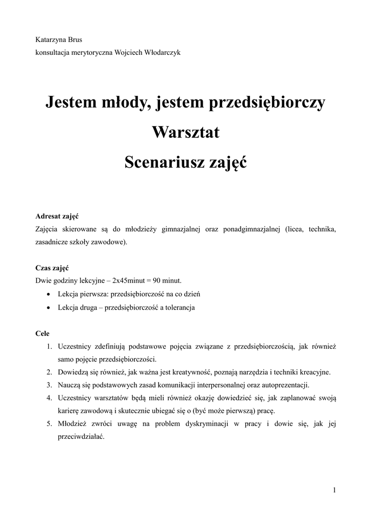 Katarzyna Brus konsultacja merytoryczna Wojciech Włodarczyk Jestem młody, jestem przedsiębiorczy Warsztat Scenariusz zajęć Adresat zajęć Zajęcia skierowane są do młodzieży gimnazjalnej oraz ponadgimnazjalnej (licea, technika, zasadnicze szkoły zawodowe). Czas zajęć Dwie godziny lekcyjne – 2x45minut = 90 minut. Lekcja pierwsza: przedsiębiorczość na co dzień Lekcja druga – przedsiębiorczość a tolerancja Cele 1. Uczestnicy zdefiniują podstawowe pojęcia związane z przedsiębiorczością, jak również samo pojęcie przedsiębiorczości. 2. Dowiedzą się również, jak ważna jest kreatywność, poznają narzędzia i techniki kreacyjne. 3. Nauczą się podstawowych zasad komunikacji interpersonalnej oraz autoprezentacji. 4. Uczestnicy warsztatów będą mieli również okazję dowiedzieć się, jak zaplanować swoją karierę zawodową i skutecznie ubiegać się o (być może pierwszą) pracę. 5. Młodzież zwróci uwagę na problem dyskryminacji w pracy i dowie się, jak jej przeciwdziałać. 1 Metoda prowadzenia warsztatów Zasadnicza część zajęć będzie prowadzona poprzez swobodną dyskusję i wymianę zdań między prowadzącymi a uczestnikami warsztatu, jak również pomiędzy uczestnikami. Sporadycznie warsztat będzie przeprowadzany w formie wykładu. Przewiduje się również wyświetlanie krótkich filmów i używanie prezentacji multimedialnej. Materiały pomocnicze Dla prowadzących: projektor multimedialny, komputer oraz głośniki Dla uczestników: kartki oraz długopisy lub ołówki Część pierwsza – przedsiębiorczość na co dzień Ta część zajęć służyć ma poznaniu, czym jest przedsiębiorczość, jak również poznaniu wielu akceptów przedsiębiorczości spotykanych w życiu codziennym. Zaczyna się ona od przedstawienia uczestnikom warsztatu krótkiego filmu (ok. 2 minut), przedstawiającego poglądy Polaków na temat przedsiębiorczości zaraz po transformacji systemowej. Sondaż przeprowadzony w styczniu 1989 roku ma być punktem wyjścia do zbudowania przez uczniów ich własnej definicji przedsiębiorczości w drodze swobodnej dyskusji z prowadzącymi. Przywołanie kilku najpopularniejszych definicji przedsiębiorczości (definicja klasyczna, czyli przedsiębiorczość jako opracowywanie nowych produktów lub nowych kombinacji istniejących produktów w celu zaspokojenia potrzeb klientów – tworzenie innowacji, umiejętne organizowanie zasobów – tworzenie organizacji oraz podnoszenie dobrobytu przez dostarczanie dodatkowej wartości-tworzenie miejsc pracy). Przywołanie etymologii słowa „przedsiębiorca” (z fr. entrepreneur – osoba pracująca na własny rachunek i gotowa do podejmowania ryzyka, 1730). Przedsiębiorczość zdefiniowana jako działalność wzmacniająca potencjał w zakresie wynalazczości, innowacji, komercjalizacji, pozyskiwania technologii, uruchamiania nowych przedsięwzięć. Charakterystyka osoby przedsiębiorczej. Ponieważ przedsiębiorczość w szerokim rozumieniu to również postawa życiowa, „człowiek przedsiębiorczy” a „przedsiębiorca” to niezupełnie to samo, należy wskazać na cechy charakteryzujące osoby przedsiębiorcze. Uczniowie będą mieli okazję skonfrontować przywołaną charakterystykę z posiadanymi przez siebie cechami, umiejętnościami i sposobem działania. 2 CZŁOWIEK O POSTAWIE PRZEDSIĘBIORCZEJ CECHY UMIEJĘTNOŚCI SPOSÓB DZIAŁANIA - poczucie własnej wartości -dokonanie samooceny -rozwijanie mocnych stron i -wiara w siebie i optymizm -wyznaczanie sobie celów eliminowanie słabszych -wewnętrzna motywacja do krótko, średnio i -działanie w kręgu własnego uczenia się i działania długoterminowych wpływu (zmiana tego, co -potrzeba osiągnięć -ustalanie priorytetów w można zmienić) -aktywność realizacji celów -stwarzanie sobie alternatyw w -samodzielność - umiejętność modyfikacji realizacji celów -otwartość na innych ludzi i planów/celów – -skuteczność działania w zachodzące zmiany dostosowywania się do zmieniających się warunkach -niezależność zmieniających się warunków -wykorzystanie pojawiających -wytrwałość -dostrzeganie szans dla się możliwości -odpowiedzialność osiągnięcia celów -podejmowanie działań -tolerancja -rozwiązywanie problemów, innowacyjnych i ponoszenie -twórczość i kreatywność podejmowanie decyzji ryzyka -świadomość mocnych i indywidualnie i grupowo -dbałość o własny rozwój słabszych stron -współdziałanie w zespole -skuteczne komunikowanie się i negocjowanie -korzystanie z nowoczesnych źródeł informacji i selekcja informacji Uczestnicy warsztatu będą mieli okazję samooceny punktowej swojej przedsiębiorczości za pomocą narysowanego przez nich wykresu. Na osi pionowej znajduje się skala punktowa 0-10, na poziomej – umiejętności i cechy przedsiębiorcze przypisane poszczególnym cyfrom (1-wiara w siebie i optymizm, 2-stawianie sobie celów, 3-planowanie działań, 4-konsekwencja w realizacji celów, 5-podejmowanie odpowiedzialnych decyzji, 6-inicjatywa i nawiązywanie kontaktów, 7współpraca zespołowa, 8-umiejętność prezentacji własnego zdania, 9-wewnętrzne motywy do uczenia się i działania, 10-korzystanie z różnych źródeł informacji). Jest to o tyle ważne, iż ludzie o charakterze przedsiębiorczym nawet w okresach wzrostu bezrobocia nie odczuwają kryzysu i nie mają trudności ze znalezieniem pracy, a w oczekiwaniu na nią są skłonne podjąć aktywność i rozpocząć własną działalność gospodarczą. Zmianę postrzegają oni nie jak kryzys, a potencjalną 3 szansę na rozwój. Należy jednak wskazać, iż niesatysfakcjonujący wynik testu nie jest powodem do postrzegania siebie jako osoby pozbawionej zdolności przedsiębiorczych, ponieważ potencjał ten można rozwijać. Sprzyjają temu nauka w szkole czy też studia, ponieważ stwarzają możliwości uczestnictwa w rozmaitych kołach zainteresowań, działalności samorz