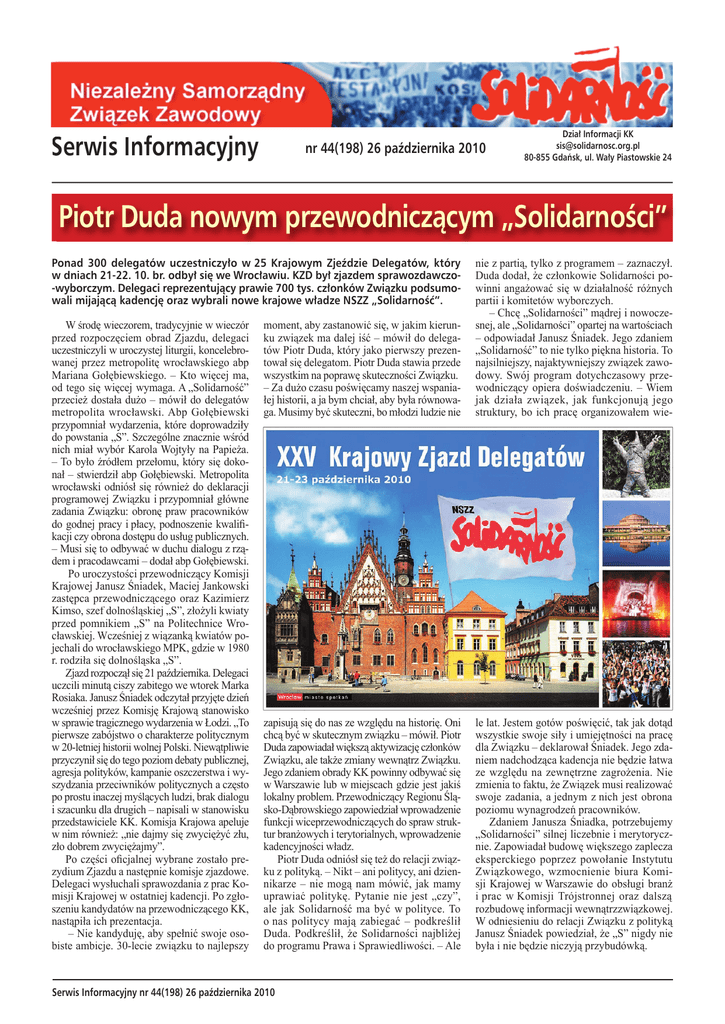 Serwis Informacyjny nr 44(198) 26 października 2010 Dział Informacji KK [email protected] 80-855 Gdańsk, ul. Wały Piastowskie 24 Piotr Duda nowym przewodniczącym „Solidarności” moment, aby zastanowić się, w jakim kierunku związek ma dalej iść – mówił do delegatów Piotr Duda, który jako pierwszy prezentował się delegatom. Piotr Duda stawia przede wszystkim na poprawę skuteczności Związku. – Za dużo czasu poświęcamy naszej wspaniałej historii, a ja bym chciał, aby była równowaga. Musimy być skuteczni, bo młodzi ludzie nie nie z partią, tylko z programem – zaznaczył. Duda dodał, że członkowie Solidarności powinni angażować się w działalność różnych partii i komitetów wyborczych. – Chcę „Solidarności” mądrej i nowoczesnej, ale „Solidarności” opartej na wartościach – odpowiadał Janusz Śniadek. Jego zdaniem „Solidarność” to nie tylko piękna historia. To najsilniejszy, najaktywniejszy związek zawodowy. Swój program dotychczasowy przewodniczący opiera doświadczeniu. – Wiem jak działa związek, jak funkcjonują jego struktury, bo ich pracę organizowałem wie- zapisują się do nas ze względu na historię. Oni chcą być w skutecznym związku – mówił. Piotr Duda zapowiadał większą aktywizację członków Związku, ale także zmiany wewnątrz Związku. Jego zdaniem obrady KK powinny odbywać się w Warszawie lub w miejscach gdzie jest jakiś lokalny problem. Przewodniczący Regionu Śląsko-Dąbrowskiego zapowiedział wprowadzenie funkcji wiceprzewodniczących do spraw struktur branżowych i terytorialnych, wprowadzenie kadencyjności władz. Piotr Duda odniósł się też do relacji związku z polityką. – Nikt – ani politycy, ani dziennikarze – nie mogą nam mówić, jak mamy uprawiać politykę. Pytanie nie jest „czy”, ale jak Solidarność ma być w polityce. To o nas politycy mają zabiegać – podkreślił Duda. Podkreślił, że Solidarności najbliżej do programu Prawa i Sprawiedliwości. – Ale le lat. Jestem gotów poświęcić, tak jak dotąd wszystkie swoje siły i umiejętności na pracę dla Związku – deklarował Śniadek. Jego zdaniem nadchodząca kadencja nie będzie łatwa ze względu na zewnętrzne zagrożenia. Nie zmienia to faktu, że Związek musi realizować swoje zadania, a jednym z nich jest obrona poziomu wynagrodzeń pracowników. Zdaniem Janusza Śniadka, potrzebujemy „Solidarności” silnej liczebnie i merytorycznie. Zapowiadał budowę większego zaplecza eksperckiego poprzez powołanie Instytutu Związkowego, wzmocnienie biura Komisji Krajowej w Warszawie do obsługi branż i prac w Komisji Trójstronnej oraz dalszą rozbudowę informacji wewnątrzzwiązkowej. W odniesieniu do relacji Związku z polityką Janusz Śniadek powiedział, że „S” nigdy nie była i nie będzie niczyją przybudówką. Ponad 300 delegatów uczestniczyło w 25 Krajowym Zjeździe Delegatów, który w dniach 21-22. 10. br. odbył się we Wrocławiu. KZD był zjazdem sprawozdawczo-wyborczym. Delegaci reprezentujący prawie 700 tys. członków Związku podsumowali mijającą kadencję oraz wybrali nowe krajowe władze NSZZ „Solidarność”. W środę wieczorem, tradycyjnie w wieczór przed rozpoczęciem obrad Zjazdu, delegaci uczestniczyli w uroczystej liturgii, koncelebrowanej przez metropolitę wrocławskiego abp Mariana Gołębiewskiego. – Kto więcej ma, od tego się więcej wymaga. A „Solidarność” przecież dostała dużo – mówił do delegatów metropolita wrocławski. Abp Gołębiewski przypomniał wydarzenia, które doprowadziły do powstania „S”. Szczególne znacznie wśród nich miał wybór Karola Wojtyły na Papieża. – To było źródłem przełomu, który się dokonał – stwierdził abp Gołębiewski. Metropolita wrocławski odniósł się również do deklaracji programowej Związku i przypomniał główne zadania Związku: obronę praw pracowników do godnej pracy i płacy, podnoszenie kwalifikacji czy obrona dostępu do usług publicznych. – Musi się to odbywać w duchu dialogu z rządem i pracodawcami – dodał abp Gołębiewski. Po uroczystości przewodniczący Komisji Krajowej Janusz Śniadek, Maciej Jankowski zastępca przewodniczącego oraz Kazimierz Kimso, szef dolnośląskiej „S”, złożyli kwiaty przed pomnikiem „S” na Politechnice Wrocławskiej. Wcześniej z wiązanką kwiatów pojechali do wrocławskiego MPK, gdzie w 1980 r. rodziła się dolnośląska „S”. Zjazd rozpoczął się 21 października. Delegaci uczcili minutą ciszy zabitego we wtorek Marka Rosiaka. Janusz Śniadek odczytał przyjęte dzień wcześniej przez Komisję Krajową stanowisko w sprawie tragicznego wydarzenia w Łodzi. „To pierwsze zabójstwo o charakterze politycznym w 20-letniej historii wolnej Polski. Niewątpliwie przyczynił się do tego poziom debaty publicznej, agresja polityków, kampanie oszczerstwa i wyszydzania przeciwników politycznych a często po prostu inaczej myślących ludzi, brak dialogu i szacunku dla drugich – napisali w stanowisku przedstawiciele KK. Komisja Krajowa apeluje w nim również: „nie dajmy się zwyciężyć złu, zło dobrem zwyciężajmy”. Po części oficjalnej wybrane zostało prezydium Zjazdu a następnie komisje zjazdowe. Delegaci wysłuchali sprawozdania z prac Komisji Krajowej w ostatniej kadencji. Po zgłoszeniu kandydatów na przewodniczącego KK, nastąpiła ich prezentacja. – Nie kandyduję, aby spełnić swoje osobiste ambicje. 30-lecie związku to najlepszy Serwis Informacyjny nr 44(198) 26 października 2010 Prezentacją obu kandydatów zakończyła się pierwsza część Zjazdu. Po przerwie delegaci wybrali Piotra Dudę na nowego przewodniczącego Komisji Krajowej. Duda otrzymał 166 głosów a dotychczasowy przewodniczący Janusz Śniadek 139. Piotr Duda podziękował za poparcie i zaufanie, którym obdarzyli go delegaci. Zapewnił również, że słowa dotrzymuje i to co mówił będzie
