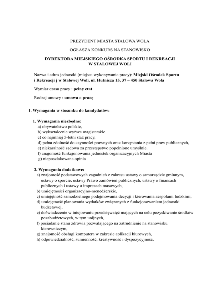 PREZYDENT MIASTA STALOWA WOLA OGŁASZA KONKURS NA STANOWISKO DYREKTORA MIEJSKIEGO OŚRODKA SPORTU I REKREACJI W STALOWEJ WOLI Nazwa i adres jednostki (miejsca wykonywania pracy): Miejski Ośrodek Sportu i Rekreacji j w Stalowej Woli, ul. Hutnicza 15, 37 – 450 Stalowa Wola Wymiar czasu pracy : pełny etat Rodzaj umowy : umowa o pracę I. Wymagania w stosunku do kandydatów: 1. Wymagania niezbędne: a) obywatelstwo polskie, b) wykształcenie wyższe magisterskie c) co najmniej 5-letni staż pracy, d) pełna zdolność do czynności prawnych oraz korzystania z pełni praw publicznych, e) niekaralność sądowa za przestępstwo popełnione umyślnie. f) znajomość funkcjonowania jednostek organizacyjnych Miasta g) nieposzlakowana opinia 2. Wymagania dodatkowe: a) znajomość podstawowych zagadnień z zakresu ustawy o samorządzie gminnym, ustawy o sporcie, ustawy Prawo zamówień publicznych, ustawy o finansach publicznych i ustawy o imprezach masowych, b) umiejętności organizacyjno-menedżerskie, c) umiejętność samodzielnego podejmowania decyzji i kierowania zespołami ludzkimi, d) umiejętność planowania wydatków związanych z funkcjonowaniem jednostki budżetowej, e) doświadczenie w inicjowaniu przedsięwzięć mających na celu pozyskiwanie środków pozabudżetowych, w tym unijnych, f) posiadanie stanu zdrowia pozwalającego na zatrudnienie na stanowisku kierowniczym, g) znajomość obsługi komputera w zakresie aplikacji biurowych, h) odpowiedzialność, sumienność, kreatywność i dyspozycyjność. II. Zakres wykonywania zadań na stanowisku: 1. Kierowanie całokształtem działalności MOSiR w Stalowej Woli i reprezentowanie go na zewnątrz. 2. Wykonywanie czynności pracodawcy w stosunku do osób zatrudnionych w jednostce organizacyjnej 3. Organizowanie pracy w Ośrodku i sprawowanie nadzoru nad realizacją zadań. 4. Dysponowanie środkami określonymi w planie finansowym placówki, ponoszenie odpowiedzialności za ich prawidłowe wykorzystanie. 5. Zarządzanie posiadanymi obiektami i urządzeniami oraz ich efektywna eksploatacja dla potrzeb sportu w ramach posiadanych upoważnień, 6. Propagowanie i realizacja wszelkich usług z zakresu sportu i masowej kultury fizycznej i turystyki przy ścisłym współdziałaniu z organizacjami kultury fizycznej i sportu. 7. Pozyskiwanie środków pozabudżetowych na działalność statutową Ośrodka, w tym środków unijnych. III. Wymagane dokumenty: 1. CV i list motywacyjny. 2. Opracowana w formie pisemnej koncepcja funkcjonowania i rozwoju MOSiR w Stalowej Woli (nie więcej niż cztery strony). 3. Kserokopie dyplomów i świadectw potwierdzających wykształcenie kandydata. 4. Kserokopie świadectw pracy lub innych dokumentów potwierdzających doświadczenie zawodowe. 5. Referencje. 6. Oświadczenie o niekaralności (w przypadku wygrania naboru zaświadczenie z Krajowego Rejestru Karnego). 7. Oświadczenie stwierdzające brak przeciwwskazań zdrowotnych do wykonywania pracy na stanowisku kierowniczym. 8. Kwestionariusz osobowy, 9. kserokopia dowodu osobistego. Uwaga: kwestionariusz osobowy, list motywacyjny oraz oświadczenia powinny być opatrzone własnoręcznym podpisem, natomiast kserokopie dokumentów poświadczone przez kandydata za zgodność z oryginałem. Dokumenty aplikacyjne: list motywacyjny, CV powinny być opatrzone klauzulą: Wyrażam zgodę na przetwarzanie moich danych osobowych zawartych w mojej ofercie pracy dla potrzeb niezbędnych do realizacji procesu rekrutacji, zgodnie z ustawą z dnia 29 sierpnia 1997r. o ochronie danych osobowych (t.j. z 2002r. Dz. U. Nr 101, poz. 926 z późn. zm.). Przyjmuję do wiadomości fakt obowiązku publikacji w Biuletynie Informacji Publicznej moich danych osobowych, zgodnie z wymogami ustawy z dnia 21 listopada 2008 r. o pracownikach samorządowych (Dz. U. Nr 223, poz. 1458). Wymagane dokumenty aplikacyjne winny być własnoręcznie podpisane i złożone osobiście w terminie do dnia 29 czerwca 2015 r. (decyduje data wpływu do Urzędu), w Wydziale Organizacji Urzędu Miasta w Stalowej Woli, ul. Wolności 7, 37-450 Stalowa Wola (pok. Nr 8) w zaklejonych kopertach z imieniem, nazwiskiem, adresem zamieszkania, numerem telefonu, z dopiskiem: „Nabór na stanowisko Dyrektora Miejskiego Ośrodka Sportu i Rekreacji w Stalowej Woli” Kwestionariusz osobowy można uzyskać na stronie internetowej http://www.bip.stalowawola.pl/ lub w pokoju Nr 8 w Urzędzie Miasta w Stalowej Woli ul. Wolności 7. Komisja zastrzega sobie prawo nieskorzystania z oferty bez podania przyczyny. Z udziału w konkursie wyłączone są osoby, które w poprzednich miejscach pracy zostały odwołane ze stanowiska lub stosunek pracy został rozwiązany z przyczyn dyscyplinarnych. Prezydent Miasta Stalowa Wola Lucjusz Nadbereżny