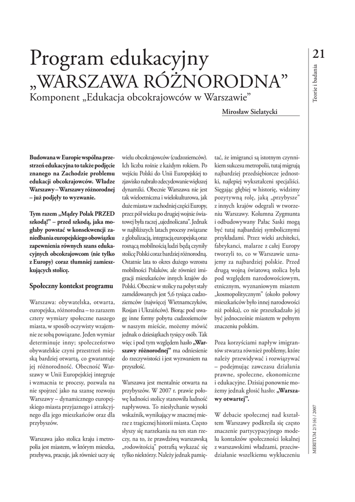 „WARSZAWA RÓŻNORODNA” Komponent „Edukacja obcokrajowców w Warszawie” Teorie i badania 21 Program edukacyjny Mirosław Sielatycki Tym razem „Mądry Polak PRZED szkodą!” – przed szkodą, jaka mogłaby powstać w konsekwencji zaniedbania europejskiego obowiązku zapewnienia równych szans edukacyjnych obcokrajowcom (nie tylko z Europy) coraz tłumniej zamieszkujących stolicę. Społeczny kontekst programu Warszawa: obywatelska, otwarta, europejska, różnorodna – to zarazem cztery wymiary społeczne naszego miasta, w sposób oczywisty wzajemnie ze sobą powiązane. Jeden wymiar determinuje inny; społeczeństwo obywatelskie czyni przestrzeń miejską bardziej otwartą, co gwarantuje jej różnorodność. Obecność Warszawy w Unii Europejskiej integruje i wzmacnia te procesy, pozwala na nie spojrzeć jako na szansę rozwoju Warszawy – dynamicznego europejskiego miasta przyjaznego i atrakcyjnego dla jego mieszkańców oraz dla przybyszów. Warszawa jako stolica kraju i metropolia jest miastem, w którym mieszka, przebywa, pracuje, jak również uczy się wielu obcokrajowców (cudzoziemców). Ich liczba rośnie z każdym rokiem. Po wejściu Polski do Unii Europejskiej to zjawisko nabrało zdecydowanie większej dynamiki. Obecnie Warszawa nie jest tak wieloetniczna i wielokulturowa, jak duże miasta w zachodniej części Europy, przez pół wieku po drugiej wojnie światowej była raczej „ujednolicana”. Jednak w najbliższych latach procesy związane z globalizacją, integracją europejską oraz rosnącą mobilnością ludzi będą czyniły stolicę Polski coraz bardziej różnorodną. Ostatnie lata to okres dużego wzrostu mobilności Polaków, ale również imigracji mieszkańców innych krajów do Polski. Obecnie w stolicy na pobyt stały zameldowanych jest 5,6 tysiąca cudzoziemców (najwięcej Wietnamczyków, Rosjan i Ukraińców). Biorąc pod uwagę inne formy pobytu cudzoziemców w naszym mieście, możemy mówić jednak o dziesiątkach tysięcy osób. Tak więc i pod tym względem hasło „Warszawy różnorodnej” ma odniesienie do rzeczywistości i jest wyzwaniem na przyszłość. Warszawa jest mentalnie otwarta na przybyszów. W 2007 r. prawie połowę ludności stolicy stanowiła ludność napływowa. To niesłychanie wysoki wskaźnik, wynikający w znacznej mierze z tragicznej historii miasta. Często słyszy się narzekania na ten stan rzeczy, na to, że prawdziwą warszawską „rodowitością” potrafią wykazać się tylko niektórzy. Należy jednak pamię- tać, że imigranci są istotnym czynnikiem sukcesu metropolii, tutaj migrują najbardziej przedsiębiorcze jednostki, najlepiej wykształceni specjaliści. Sięgając głębiej w historię, widzimy pozytywną rolę, jaką „przybysze” z innych krajów odegrali w tworzeniu Warszawy. Kolumna Zygmunta i odbudowywany Pałac Saski mogą być tutaj najbardziej symbolicznymi przykładami. Przez wieki architekci, fabrykanci, malarze z całej Europy tworzyli to, co w Warszawie uznajemy za najbardziej polskie. Przed drugą wojną światową stolica była pod względem narodowościowym, etnicznym, wyznaniowym miastem „kosmopolitycznym” (około połowy mieszkańców było innej narodowości niż polska), co nie przeszkadzało jej być jednocześnie miastem w pełnym znaczeniu polskim. Poza korzyściami napływ imigrantów stwarza również problemy, które należy przewidywać i rozwiązywać – podejmując zawczasu działania prawne, społeczne, ekonomiczne i edukacyjne. Dzisiaj ponownie możemy jednak głosić hasło: „Warszawy otwartej”. W debacie społecznej nad kształtem Warszawy podkreśla się często znaczenie partycypacyjnego modelu kontaktów społeczności lokalnej z warszawskimi władzami, przeciwdziałanie wszelkiemu wykluczeniu MERITUM 2/3 (6) / 2007 Budowana w Europie wspólna przestrzeń edukacyjna to także podjęcie znanego na Zachodzie problemu edukacji obcokrajowców. Władze Warszawy – Warszawy różnorodnej – już podjęły to wyzwanie. Teorie i badania 22 społecznemu, w tym wykluczeniu członków społeczności wywodzących się z innych narodowości, krajów i wyznań. Podkreśla się wagę aktywności obywatelskiej wszystkich grup mieszkańców stolicy (Warszawa ma rekordowe w skali kraju wskaźniki uczestnictwa mieszkańców w wyborach samorządowych, parlamentarnych i prezydenckich, jednak nadal niewiele przekraczają one 50%). Określanie naszego miasta mianem „Warszawy obywatelskiej” jest postulatem wymagającym ciągłej pracy, w tym w dużej mierze pracy edukacyjnej. Przystąpienie Polski do Unii Europejskiej w 2004 r. otworzyło nowy rozdział również w funkcjonowaniu Warszawy. Nasz kraj stał się częścią wielkiej wspólnej europejskiej przestrzeni ekonomicznej, społecznej, edukacyjnej. Uruchomione zostały nowe procesy, w tym migracyjne, z i do naszego miasta. Warszawiacy mogą coraz swobodniej podróżować, pracować i uczyć się na obszarze pozostałych państw członkowskich UE. Jednocześnie obywatele Unii Europejskiej stają się stopniowo równouprawnionymi członkami warszawskiej społeczności, również w zakresie zatrudnienia i uczenia się. Te zmiany zachodzą na naszych oczach, i mimo że nie zawsze łatwo je dostrzec, ich dalszy przebieg będzie umacniał obecność Warszawy w Europie, choćby poprzez takie wydarzenia, jak Euro 2012. Hasło „Warszawy europejskiej”, po wielu latach, w których mogło być jedynie marzeniem, staje się rzeczywistością. MERITUM 2/3 (6) / 2007 Edukacyjny kontekst programu Najważniejsze dokumenty i opracowania edukacyjne ostatnich lat wskazują na rolę edukacji dla wszystkich i uczenia się przez całe życie, w tym zwłaszcza osób o utrudnionym do niej dostępie. UNESCO definiuje podstawowe funkcje współczesnej szkoły w haśle „Uczyć się, aby wiedzieć, działać, być i żyć wspólnie”. To uczenie i uczenie się do „wspólnego życia” oznacza również troskę o edukację dziec