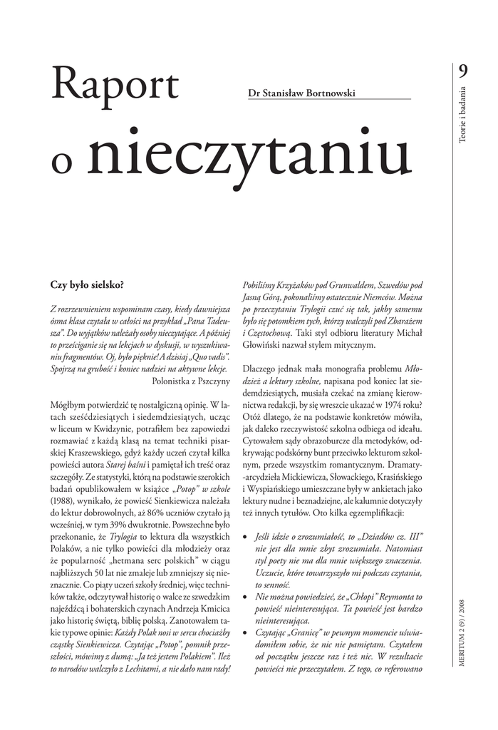 o nieczytaniu Czy było sielsko? Z rozrzewnieniem wspominam czasy, kiedy dawniejsza ósma klasa czytała w całości na przykład „Pana Tadeusza”. Do wyjątków należały osoby nieczytające. A później to prześciganie się na lekcjach w dyskusji, w wyszukiwaniu fragmentów. Oj, było pięknie! A dzisiaj „Quo vadis”. Spojrzą na grubość i koniec nadziei na aktywne lekcje. Polonistka z Pszczyny Mógłbym potwierdzić tę nostalgiczną opinię. W latach sześćdziesiątych i siedemdziesiątych, ucząc w liceum w Kwidzynie, potrafiłem bez zapowiedzi rozmawiać z każdą klasą na temat techniki pisarskiej Kraszewskiego, gdyż każdy uczeń czytał kilka powieści autora Starej baśni i pamiętał ich treść oraz szczegóły. Ze statystyki, którą na podstawie szerokich badań opublikowałem w książce „Potop” w szkole (1988), wynikało, że powieść Sienkiewicza należała do lektur dobrowolnych, aż 86% uczniów czytało ją wcześniej, w tym 39% dwukrotnie. Powszechne było przekonanie, że Trylogia to lektura dla wszystkich Polaków, a nie tylko powieści dla młodzieży oraz że popularność „hetmana serc polskich” w ciągu najbliższych 50 lat nie zmaleje lub zmniejszy się nieznacznie. Co piąty uczeń szkoły średniej, więc techników także, odczytywał historię o walce ze szwedzkim najeźdźcą i bohaterskich czynach Andrzeja Kmicica jako historię świętą, biblię polską. Zanotowałem takie typowe opinie: Każdy Polak nosi w sercu chociażby cząstkę Sienkiewicza. Czytając „Potop”, pomnik przeszłości, mówimy z dumą: „Ja też jestem Polakiem”. Ileż to narodów walczyło z Lechitami, a nie dało nam rady! Teorie i badania Dr Stanisław Bortnowski Pobiliśmy Krzyżaków pod Grunwaldem, Szwedów pod Jasną Górą, pokonaliśmy ostatecznie Niemców. Można po przeczytaniu Trylogii czuć się tak, jakby samemu było się potomkiem tych, którzy walczyli pod Zbarażem i Częstochową. Taki styl odbioru literatury Michał Głowiński nazwał stylem mitycznym. Dlaczego jednak mała monografia problemu Młodzież a lektury szkolne, napisana pod koniec lat siedemdziesiątych, musiała czekać na zmianę kierownictwa redakcji, by się wreszcie ukazać w 1974 roku? Otóż dlatego, że na podstawie konkretów mówiła, jak daleko rzeczywistość szkolna odbiega od ideału. Cytowałem sądy obrazoburcze dla metodyków, odkrywając podskórny bunt przeciwko lekturom szkolnym, przede wszystkim romantycznym. Dramaty-arcydzieła Mickiewicza, Słowackiego, Krasińskiego i Wyspiańskiego umieszczane były w ankietach jako lektury nudne i beznadziejne, ale kalumnie dotyczyły też innych tytułów. Oto kilka egzemplifikacji: • Jeśli idzie o zrozumiałość, to „Dziadów cz. III” nie jest dla mnie zbyt zrozumiała. Natomiast styl poety nie ma dla mnie większego znaczenia. Uczucie, które towarzyszyło mi podczas czytania, to senność. • Nie można powiedzieć, że „Chłopi” Reymonta to powieść nieinteresująca. Ta powieść jest bardzo nieinteresująca. • Czytając „Granicę” w pewnym momencie uświadomiłem sobie, że nic nie pamiętam. Czytałem od początku jeszcze raz i też nic. W rezultacie powieści nie przeczytałem. Z tego, co referowano MERITUM 2 (9) / 2008 Raport Teorie i badania 10 na lekcji, doszedłem do wniosku, że „Granica” nie wprowadza żadnych nowych zagadnień. Odkryłem i opisałem zjawisko prymitywizmu. Uczeń z dezaprobatą traktuje literaturę, nie rozumie dzieła, ale też nie próbuje wniknąć głębiej ani w jego poetykę, ani w problematykę. Ta niemoc nie oznacza jednak pokory wobec własnych możliwości poznawczych ani tym bardziej zaufania wobec autorytetów. Młody człowiek uważa, że wie lepiej, wygłasza autorytatywne opinie, drwi z pisarza, ośmiesza go, nawet obrzuca kalumniami. Irytacja łączy się z głoszeniem poglądów często naiwnych i poczciwych, czasami zaś bezczelnych. Mamy więc do czynienia albo z arogancją, albo z diagnozowaniem kogoś, kto jest pewien swoich racji, chociaż myli hierarchie spraw i sensy autorskiego przesłania. MERITUM 2 (9) / 2008 • Bierną postawą i intelektem wykazała się Antygona. Inna postać jak Mela z „Moralności pani Dulskiej” jest dziewczyną interesującą, spokojną, jednym słowem dziewczyną, która ma ocenę bohatera pozytywnego. • „Wesele” to zlepek kilku różnych myśli i wiadomości, ale niewyczerpanych i niedopowiedzianych do końca. Żadnych ciekawych wiarygodnych akcji. Takie wesela wiejskie to sprawa aż nadto dobrze znana. Słabo odtworzony folklor. Sprawy historyczne też potraktowane po macoszemu. Jakiś symbol, maleńka akcja i koniec wszystkich myśli. Mimo wielu bezradności, czasami zgodnych z normami czytania uczniów w tym wieku szkolnym, statystyki potwierdzały, że z czytaniem lektur nie było przed cywilizacyjnym przełomem tak źle. Na pytanie „Czy zawsze czytasz lekturę szkolną?”, 30% uczniów szkół średnich odpowiedziało, że zawsze, a na pytanie „Na dziesięć lektur, ile opuszczasz?”, 48% wyznało, że ani jednej, 39%, że jedną – dwie. Nic dziwnego, że kiedy byłem we Francji, mogłem memu koledze z dumą oświadczyć, że polscy uczniowie czytają grube książki. Podliczyłem wówczas strony Sienkiewicza, Prusa, Orzeszkowej, Reymonta, Żeromskiego, Dąbrowskiej, mając świadomość, że daleko nie odbiegam od prawdy. Była to bowiem w czytelnictwie szkolnym epoka na pewno nie sielanki, ale jednak kanon lektur obowiązkowych utrzymywał się bez terroru. Zrzędzenie i niechęć pojawiały się, bluźnierstwa skrzętnie ukrywano, nikt jednak nie ośmieliłby się odrzucić kochanego powszechnie Sienkiewicza, a nawet Pan Tadeusz, chociaż to poemat, w wielu klasach potrafił młodych zainteresować, zaś w moich statystykach czasami wyprzedzał powieściowych klasyków. Smutna dokumentacja Po ćwierćwieczu na polu lektur szkolnych – mówiąc metaforycznie – ugór. Gromadziłem 