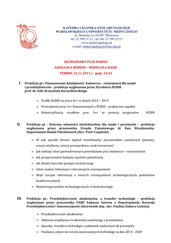 KATEDRA I KLINIKA OTOLARYNGOLOGII WARSZAWSKIEGO UNIWERSYTETU MEDYCZNEGO ul. Banacha 1a, 02-097 Warszawa tel. 22 599 25 21; tel./fax 22 599 25 23 www.otolaryngology.pl e-mail: [email protected] SZCZEGÓŁOWY PLAN PANELU NAUKA DLA BIZNESU – BIZNES DLA NAUKI TERMIN: 22.11.2013 r. godz. 13:45 I. Prelekcja pt.: Finansowanie działalności badawczo – rozwojowej dla nauki i przedsiębiorców - prelekcja wygłoszona przez Dyrektora NCBiR prof. dr. hab. Krzysztofa Kurzydłowskiego II. • Środki NCBiR na prace b+r w latach 2014 – 2019 • Prowadzenie prac b+r finansowanych z NCBiR – praktyczne aspekty • Komercjalizacja wyników prac b+r za pomocą programów NCBiR Prelekcja pt : Ochrona własności intelektualnej dla nauki i przemysłu – prelekcja wygłoszona przez pracownika Urzędu Patentowego dr Ewę WaszkowskąDepartament Badań Patentowych (Dyr. Piotr Czaplicki) • W jaki sposób chronić kapitał intelektualny pracowników naukowych (patenty, wzory użytkowe, wzory przemysłowe, znaki towarowe) • Jak uniknąć strat spowodowanych powielaniem prac badawczo – rozwojowych • Jak przeprowadzić badanie czystości patentowej • Jak śledzić kierunki postępu technicznego • Gdzie szukać informacji o chronionych rozwiązaniach • Skąd czerpać informacje o nowych rozwiązaniach technologicznych podmiotów konkurencyjnych • Monitoring trendów technologicznych w biotechnologii III. Prelekcja pt.: Przedsiębiorczość akademicka, a transfer technologii - prelekcja wygłoszona przez pracownika PARP Łukasza Szterna z Departamentu Rozwoju Przedsiębiorczości i Innowacyjności (kierownik dep.: dyr. Paulina Zadura-Lichota) • Przedsiębiorczość akademicka • Aktywna współpraca środowiska naukowego z przemysłem • Sposoby transferu technologii z jednostek naukowych do przemysłu • Fundusze unijne na rozwój innowacyjnych technologii na lata 2014 - 2020 IV. Prelekcja pt.: Finansowanie działalności badawczej - prelekcja wygłoszona przez członka Rady Naukowej NCN - prof. dr hab. Jakuba Gołąba (Warszawski Uniwersytet Medyczny) • Badania podstawowe – zdefiniowanie zakresu • Rola badań podstawowych w nauce • Środki na badania podstawowe • Możliwości prowadzenia badań podstawowych przez młodych naukowców V. Prelekcja pt.: Aspekty zarządzania nauką stymulujące rozwój innowacji oraz ich transfer do biznesu - prelekcja przygotowana przez Leszka Stypułkowskiego partnera zarządzającego Index Copernicus • Nowoczesne metody zarządzania nauką • Systemy informatyczne pozwalające na zarządzanie efektywnością • Zestawienia z ewaluacji jednostek naukowych w grupie nauk medycznych – w zakresie kryteriów wskazujących na innowacyjność i współpracę z biznesem. VI. Prelekcja pt.: „Neuro Device Group Sp. z o.o. - model dobrych praktyk” – prelekcja przygotowana przez Prezesa firmy Neuro Device Group Sp. z o.o. Pawła Solucha • Charakterystyka relacji nauki z biznesem w Polsce. • Trudności wejścia na rynek nauka-business. • Źródła finansowania przez przedsiębiorców działalności b+r • Rola przedsiębiorstwa w konsorcjum. • Działalność Spółki Neuro Device – model dobrych praktyk VII. Prelekcja pt.: Amerykański model finansowania nauki oraz małych i średnich przedsiębiorstw – prelekcja przygotowana przez Rafaela E. Delgado (Assoc. Prof), University of Miami & Intelligent Hearing Systems Incorp. , FL, USA • Finansowanie nauki przez National Institute sof Health • Amerykański model transferu najnowszych technologii do małych i średnich przedsiębiorstw • Zasady finansowania oraz wspierania małych i średnich przedsiębiorstw wdrażających innowacyjne technologie z laboratoriów uniwersyteckich