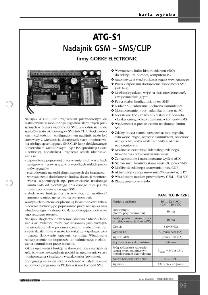 k karta wyrobu ATG-S1 Nadajnik GSM – SMS/CLIP firmy GORKE ELECTRONIC m m Nadajnik ATG-S1 jest urządzeniem przeznaczonym do zastosowania w monitoringu sygnałów alarmowych przesyłanych w postaci wiadomości SMS, a w odniesieniu do sygnałów testu okresowego – SMS lub CLIP. Dzięki szerokim możliwościom konfiguracyjnym nadajnik może być stosowany z większością dostępnych stacji monitorowania obsługujących sygnały SMS/CLIP lub z dedykowanym odbiornikiem wielotorowym, typ OSS (produkcji GORKE ELECTRONIC). Konstrukcja urządzenia została ukierunkowana na: – zapewnienie poprawnej pracy w zmiennych warunkach zasięgowych, a zwłaszcza w przypadkach niskich poziomów sygnałów, – rozbudowanie narzędzi diagnostycznych dla instalatora, – wprowadzenie dodatkowych kodów do stacji monitorowania, raportujących np. przekroczenie ustalonego limitu SMS od pierwszego dnia danego miesiąca czy restart po powrocie zasięgu GSM, – dodatkowe funkcje dla użytkownika, np. możliwość automatycznego generowania przypomnień. Ważnym elementem urządzenia są kilkustopniowe zabezpieczenia nadzorujące poprawność pracy nadajnika oraz wbudowanego modemu GSM, zapobiegające potrzebie jego ręcznego restartu. Nadajnik, dzięki wbudowanemu układowi nadzoru i ładowania akumulatora, może być stosowany jako rozwiązanie niezależne lub – po zamontowaniu w obudowie, np. z centralą alarmową – może korzystać ze wspólnego akumulatora (ładowanie zapewnia centrala). Wbudowane zabezpieczenie nie dopuszcza do nadmiernego rozładowania akumulatora przez nadajnik. Zakres uprawnień i funkcje realizowane przez nadajnik są zróżnicowane i uwzględniają podział na uprawnienia l stacji monitorowania l instalatora l użytkownika (prywatne). Konfiguracji ustawień można dokonać w całym zakresie za pomocą programu na PC lub zestawu komend SMS. v Wewnętrzny bufor historii zdarzeń (500) do odczytu za pomocą komputera PC v Automatyczna synchronizacja zegara wewnętrznego v Praca z raportami dostarczenia wiadomości SMS (lub bez) v Możliwość podziału wejść na dwie niezależne strefy z wejściami blokującymi v Pełna zdalna konfiguracja przez SMS v Nadzór AC, ładowanie i ochrona akumulatora v Monitorowanie pracy nadajnika on-line na PC v Niezależne kody zdarzeń o restarcie z powodu: braku zasięgu braku zasilania komendy SMS v Wiadomości o przekroczeniu ustalonego limitu SMS v Zdalny odczyt statusu urządzenia: moc sygnału, stan wejść i wyjść, napięcie akumulatora, obecność napięcia AC, liczba wysłanych SMS w okresie rozliczeniowym v Możliwość czasowego lub stałego zdalnego blokowania i odblokowywania wejść v Zabezpieczone i monitorowane wyjście AUX v Sterowanie i kontrola stanu wyjść OC przez SMS v Możliwość zdalnego testowania przez CLIP v Aktualizacja oprogramowania (firmware’u) z PC v Wbudowany modem przemysłowy GSM – SIM 300 v Złącze antenowe – SMA l l l DANE TECHNICZNE Napięcie zasilania 16 … 22 V AC / / 9,5 … 16 V DC Pobór prądu (średni przy nadawaniu) 80 mA Pobór prądu z akumulatora w trybie czuwania (bez AUX) 40 mA Wejścia 8 (NO/NC) Wyjścia OC 3 (maks. 500 mA) Wyjście AUX 1 (maks. 100 mA) Prąd ładowania akumulatora 250 mA Próg zadziałania zabezpieczenia przed nadmiernym rozładowaniem akumulatora Uaku = 9 V ±0,3 V Zakres temperatury pracy Wymiary 0 … 40°C 134 x 66 x 45 [mm] nr 2, MARZEC – KWIECIEŃ 2008 95