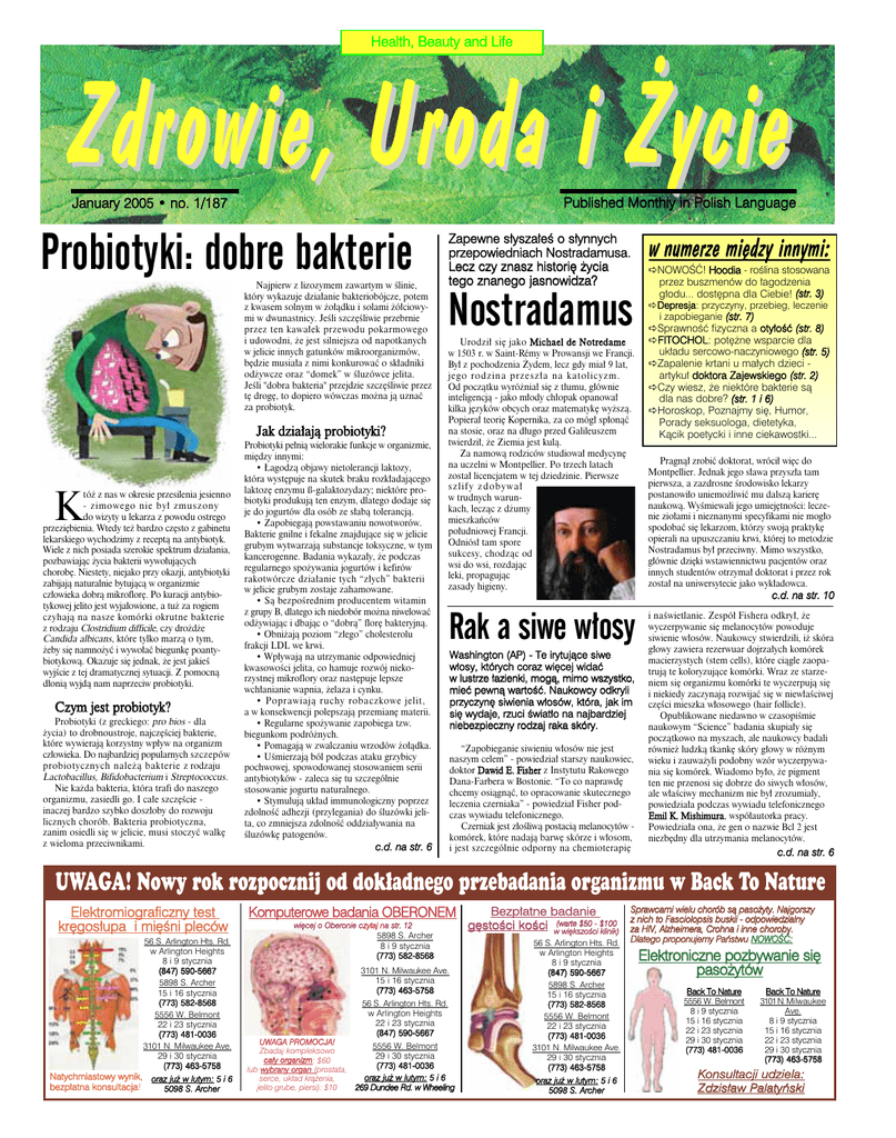 Health, Beauty and Life Zdrowie, Uroda i Życie Published Monthly in Polish Language January 2005 • no. 1/187 Probiotyki: dobre bakterie Najpierw z lizozymem zawartym w ślinie, który wykazuje działanie bakteriobójcze, potem z kwasem solnym w żołądku i solami żółciowymi w dwunastnicy. Jeśli szczęśliwie przebrnie przez ten kawałek przewodu pokarmowego i udowodni, że jest silniejsza od napotkanych w jelicie innych gatunków mikroorganizmów, będzie musiała z nimi konkurować o składniki odżywcze oraz “domek” w śluzówce jelita. Jeśli "dobra bakteria" przejdzie szczęśliwie przez tę drogę, to dopiero wówczas można ją uznać za probiotyk. Jak działają probiotyki? K tóż z nas w okresie przesilenia jesienno - zimowego nie był zmuszony do wizyty u lekarza z powodu ostrego przeziębienia. Wtedy też bardzo często z gabinetu lekarskiego wychodzimy z receptą na antybiotyk. Wiele z nich posiada szerokie spektrum działania, pozbawiając życia bakterii wywołujących chorobę. Niestety, niejako przy okazji, antybiotyki zabijają naturalnie bytującą w organizmie człowieka dobrą mikroflorę. Po kuracji antybiotykowej jelito jest wyjałowione, a tuż za rogiem czyhają na nasze komórki okrutne bakterie z rodzaju Clostridium difficile, czy drożdże Candida albicans, które tylko marzą o tym, żeby się namnożyć i wywołać biegunkę poantybiotykową. Okazuje się jednak, że jest jakieś wyjście z tej dramatycznej sytuacji. Z pomocną dłonią wyjdą nam naprzeciw probiotyki. Czym jest probiotyk? Probiotyki (z greckiego: pro bios - dla życia) to drobnoustroje, najczęściej bakterie, które wywierają korzystny wpływ na organizm człowieka. Do najbardziej popularnych szczepów probiotycznych należą bakterie z rodzaju Lactobacillus, Bifidobacterium i Streptococcus. Nie każda bakteria, która trafi do naszego organizmu, zasiedli go. I całe szczęście inaczej bardzo szybko doszłoby do rozwoju licznych chorób. Bakteria probiotyczna, zanim osiedli się w jelicie, musi stoczyć walkę z wieloma przeciwnikami. Probiotyki pełnią wielorakie funkcje w organizmie, między innymi: • Łagodzą objawy nietolerancji laktozy, która występuje na skutek braku rozkładającego laktozę enzymu ß-galaktozydazy; niektóre probiotyki produkują ten enzym, dlatego dodaje się je do jogurtów dla osób ze słabą tolerancją. • Zapobiegają powstawaniu nowotworów. Bakterie gnilne i fekalne znajdujące się w jelicie grubym wytwarzają substancje toksyczne, w tym kancerogenne. Badania wykazały, że podczas regularnego spożywania jogurtów i kefirów rakotwórcze działanie tych “złych” bakterii w jelicie grubym zostaje zahamowane. • Są bezpośrednim producentem witamin z grupy B, dlatego ich niedobór można niwelować odżywiając i dbając o “dobrą” florę bakteryjną. • Obniżają poziom “złego” cholesterolu frakcji LDL we krwi. • Wpływają na utrzymanie odpowiedniej kwasowości jelita, co hamuje rozwój niekorzystnej mikroflory oraz następuje lepsze wchłanianie wapnia, żelaza i cynku. • Poprawiają ruchy robaczkowe jelit, a w konsekwencji polepszają przemianę materii. • Regularne spożywanie zapobiega tzw. biegunkom podróżnych. • Pomagają w zwalczaniu wrzodów żołądka. • Uśmierzają ból podczas ataku grzybicy pochwowej, spowodowanej stosowaniem serii antybiotyków - zaleca się tu szczególnie stosowanie jogurtu naturalnego. • Stymulują układ immunologiczny poprzez zdolność adhezji (przylegania) do śluzówki jelita, co zmniejsza zdolność oddziaływania na śluzówkę patogenów. Zapewne słyszałeś o słynnych przepowiedniach Nostradamusa. Lecz czy znasz historię życia tego znanego jasnowidza? Nostradamus Urodził się jako M i c h a e l d e N o t r e d a m e w 1503 r. w Saint-Rémy w Prowansji we Francji. Był z pochodzenia Żydem, lecz gdy miał 9 lat, jego rodzina przeszła na katolicyzm. Od początku wyróżniał się z tłumu, głównie inteligencją - jako młody chłopak opanował kilka języków obcych oraz matematykę wyższą. Popierał teorię Kopernika, za co mógł spłonąć na stosie, oraz na długo przed Galileuszem twierdził, że Ziemia jest kulą. Za namową rodziców studiował medycynę na uczelni w Montpellier. Po trzech latach został licencjatem w tej dziedzinie. Pierwsze szlify zdobywał w trudnych warunkach, lecząc z dżumy mieszkańców południowej Francji. Odniósł tam spore sukcesy, chodząc od wsi do wsi, rozdając leki, propagując zasady higieny. Rak a siwe włosy c.d. na str. 6 Washington (AP) - Te irytujące siwe włosy, których coraz więcej widać w lustrze łazienki, mogą, mimo wszystko, mieć pewną wartość. Naukowcy odkryli przyczynę siwienia włosów, która, jak im się wydaje, rzuci światło na najbardziej niebezpieczny rodzaj raka skóry. “Zapobieganie siwieniu włosów nie jest naszym celem” - powiedział starszy naukowiec, doktor Dawid E. Fisher z Instytutu Rakowego Dana-Farbera w Bostonie. “To co naprawdę chcemy osiągnąć, to opracowanie skutecznego leczenia czerniaka” - powiedział Fisher podczas wywiadu telefonicznego. Czerniak jest złośliwą postacią melanocytów komórek, które nadają barwę skórze i włosom, i jest szczególnie odporny na chemioterapię w numerze między innymi: DNOWOŚĆ! Hoodia - roślina stosowana przez buszmenów do łagodzenia głodu... dostępna dla Ciebie! (str. 3) Depresja: przyczyny, przebieg, leczenie DD i zapobieganie (str. 7) DSprawność fizyczna a otyłość (str. 8) FITOCHOL: potężne wsparcie dla DF układu sercowo-naczyniowego (str. 5) DZapalenie krtani u małych dzieci artykuł doktora Zajewskiego (str. 2) DCzy wiesz, że niektóre bakterie są dla nas dobre? (str. 1 i 6) DHoroskop, Poznajmy się, Humor, Porady seksuologa, dietetyka, Kącik poetycki i inne ciekawostki... Pragnął zrobić doktorat, wrócił więc do Montpellier. Jednak jego sława przyszła tam pierwsza, a zazdrosne środo