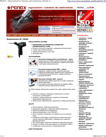RENEX :: Stacje lutownicze, lutownice, piece lutownicze, drukarki sz... 1z2 http://www.renex.com.pl/pokaz_produkt.php?id=106 Interface: ytkownik: [email protected] Centrum Szkoleniowe Produkty-Sklep Lutownice i stacje lutownicze Rozlutownica SC-7000Z ROZLUTOWNICA SC7000Z URZ DZENIE DO DEMONTA U ELEMENTÓW PRZEWLEKANYCH I SMD Por czne, przeno ne urz dzenie z wbudowanym kompresorem Trwa a, wytrzyma a konstrukcja Zasilanie bezpo rednio z sieci 230V Atrakcyjna cena ZASTOSOWANIE Demonta komponentów przewlekanych - dysze Rozlutownica SC-7000Z umo liwia demonta wszelkiego rodzaju elementów przewlekanych z p ytek drukowanych w tym tak e wielowarstwowych. Demonta komponentów SMD - zestaw Dodatkowy "Zestaw do SMD" umo liwia demonta wi kszo ci komponentów elektronicznych montowanych w technologii powierzchniowej - metod wydmuchu gor cego powietrza. Demonta uk adów SMD - g owice Demontowanie uk adów g owicami to szybki i bezpieczny sposób demonta u. W przypadku demonta u g owicami do ka dego uk adu dobieramy g owic odpowiedniej wielko ci. SC 7000Z znajduje zastosowanie wsz dzie tam, gdzie u ytkownikowi zale y na: mobilnym urz dzeniu znajduj cym zastosowanie w pracach serwisowych i produkcyjnych wydajnym i bardzo skutecznym urz dzeniu do demonta u komponentów elektronicznych niskim koszcie eksploatacji przy zapewnieniu wysokiej operatywno ci ZALETY ynna regulacja i stabilizacja temperatury Sygnalizacja osi gni cia i stabilizacji zadanej temperatury Obudowa zabezpieczona antystatycznie Zasilanie bezpo rednio z sieci 220/230 V Silnik i kompresor wbudowany w urz dzenie (nie ma osobnych stacji) Prze cznik umo liwiaj cy natychmiastow zmian trybu pracy (ssanie-nadmuch), jednocze nie z regulacj mocy nadmuchu gor cego powietrza Filtr umo liwiaj cy wielokrotne opró nianie nagromadzonej cyny Grzejnik z ceramiki warstwowej odporny do temperatury 1000°C Urz dzeniem mo na pracowa w ka dej p aszczy nie DANE TECHNICZNE Urz dzenia do cznego monta u i demonta u Urz dzenia do monta u i demonta u gor cym powietrzem Lutownice i klejarki gazowe Automatyczne i manualne systemy Pick&Place Piece rozp ywowe i komorowe Drukarki szablonowe Fale lutownicze i urz dzenia do lutowania selektywnego Spoiwa lutownicze Zaawansowane systemy naprawcze Topniki Bezkontaktowe systemy pomiarowe Preparaty chemiczne i akcesoria do czyszczenia Lupy pod wietlane i lampy do wietlania miejsc pracy Zabezpieczenia antystatyczne Mikroskopy i systemy wizyjne Narz dzia r czne Rentgeny do sprawdzania BGA po lutowaniu sety Systemy filtracji dymów i oparów Ramiona do systemów filtracji dymów i oparów Wkr taki Wkr taki elektryczne Meble produkcyjno serwisowe Podgrzewacze PCB 2008-06-20 17:06 RENEX :: Stacje lutownicze, lutownice, piece lutownicze, drukarki sz... 2z2 http://www.renex.com.pl/pokaz_produkt.php?id=106 Zasilanie: 220/230 V, 50 Hz Moc pobierana przez urz dzenie: 120 W Kompresor: pompka membranowa Moc pobierana przez silnik: 15 W Wytwarzane podci nienie: 600 mm Hg Czas osi gni cia max podci nienia: 0,2 s Wydajno kompresora: 15 l/min Moc grzejnika: 100 W System stabilizacji temperatury: pomiar rezystancji grzejnika Zakres temperatur: od 350-500°C Waga kompletnego urz dzenia: 420 g Przewód zasilaj cy trzy owy, silikonowy, odporny na wysokie temperatury Urz dzenia specjalistyczne Tygle lutownicze Podajniki drutu lutowniczego i dyspensery pasty/kleju Myjki ultrad wi kowe Ramy do monta u elementów przewlekanych Testery i urz dzenia kontrolno-pomiarowe Akcesoria Wyposa enie standardowe Rozlutownica Dysza do zassysania Filtr 2szt Wycior pojedy czy Wycior potrójny Wyposa enie opcjonalne Dysze owice Podstawka ST-800 Zestaw SMD Cz ci zamienne Preparaty chemiczne do czyszczenia Prenumerata biuletynu Adres e-mail Prenumeruj Katalog Renex 2007 Katalog i jego dystrybucja bezp atne - prosimy jedynie o wype nienie odpowiedniego formularza. Pobierz PDF Kontakt tel.: +48 54 231-10-05 +48 54 411-25-55 fax:.+48 54 411-25-56 email: [email protected] Al. Kazimierza Wielkiego 6E 87-800 W oc awek Polska Contact the Webmaster 2008-06-20 17:06
