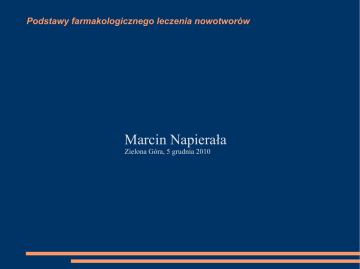 Podstawy farmakologicznego leczenia nowotworów Marcin Napierała Zielona Góra, 5 grudnia 2010 Podstawy farmakologicznego leczenia nowotworów ● Definicja nowotworu: – ● Nowotwór złośliwy – – – ● Nie kontrolowany przez organizm rozplem części dotychczas prawidłowych komórek, ich rozrost i zdolność dawania przerzutów Duże tempo wzrostu Naciekający i niszczący sąsiednie tkanki Dający przerzuty Nowotwór łagodny: – – – Wolne tempo wzrostu Nienaciekający (wzrost „rozpychający”) sąsiednich tkanek Niedający przerzutów Podstawy farmakologicznego leczenia nowotworów ● Rak (carcinoma) – nowotwór złośliwy wychodzący z tkanki nabłonkowej: – ● Mięsak (sarcoma) – nowotwór złośliwy pochodzenia nienabłonkowego: – ● Rak skóry, rak piersi, rak jelita grubego, itd. Mięśniakomięsak, tłuszczakomięsak, itd. Nowotwory łagodne wychodzące z tkanki nienabłonkowej: włókniaki, mięśniaki macicy, tłuszczaki, gruczolakowłókniaki piersi, naczyniaki, itd. Podstawy farmakologicznego leczenia nowotworów ● Patogeneza nowotworów: – Inicjacja – pojawienie się pojedynczej zmienionej komórki zdolnej do proliferacji – Promocja – rozmnażanie się zmienionych komórek oraz pojawiania się kolejnych zaburzeń i nieprawidłowości – Progresja – pojawienie się cech złośliwości, a więc zdolność do wzrostu inwazyjnego i nabycie zdolności do tworzenia przerzutów Podstawy farmakologicznego leczenia nowotworów ● Patogeneza nowotworów: – – – – Model doświadczalny: skóra myszy Czynnik inicjujący (karcynogen) – benzopiren Czynnik promocyjny – ester dwuterpenowy Przebieg doświadczenia: ● ● ● ● Wielokrotna ekspozycja na czynnik inicjujący Pojedyncza ekspozycja na czynnik inicjujący Wielokrotna ekspozycja na czynnik promocyjny Pojedyncza ekspozycja na czynnik inicjujący i następująca wielokrotna ekspozycja na czynnik promujący Podstawy farmakologicznego leczenia nowotworów ● Patogeneza nowotworów: – Wielokrotna ekspozycja na czynnik inicjujący ● – Pojedyncza ekspozycja na czynnik inicjujący ● – Brak guzów Wielokrotna ekspozycja na czynnik promocyjny ● – Duża częstość rozwoju guzów Brak guzów Pojedyncza ekspozycja na czynnik inicjujący i następująca wielokrotna ekspozycja na czynnik promujący ● Duża częstość rozwoju guzów Podstawy farmakologicznego leczenia nowotworów ● Porównanie procesów inicjacji i promocji: inicjacja promocja proces mutacja zmiana ekspresji genów odwracalność nieodwracalny odwracalny czas trwania krótki długi wartość progowa nie istnieje obecna dostrzegalność nie dający się zidentyfikować wyraźnie widoczny Podstawy farmakologicznego leczenia nowotworów ● Zjawisko progresji – Pojawienie się nowych cech w guzie ● ● ● ● – Zwiększenie tempa wzrostu Zwiększenie autonomii komórek Inwazyjność (naciek podścieliska) Zdolność do przerzutowania w/w towarzyszą mierzalne zmiany w kariotypie komórek nowotworowych ● ● Aktywacja protoonkogenów (na przykład w przewlekłej białaczce szpikowej obecna jest translokacja części chromosomu 9 do 22) Wyhamowanie genów supresorowych Podstawy farmakologicznego leczenia nowotworów ● Histoklinika nowotworów: – Inwazja ● ● ● – Wzmożona ruchliwość komórek nowotworowych Zdolność do proteolizy Utrata „zahamowania” kontaktowego Przerzutowanie ● ● ● ● ● Jedna lub więcej komórek nowotworowych rośnie w pewnej odległości od ogniska pierwotnego Drogą krwi Drogą limfatyczną 1 ognisko przerzutowe na 10 000 komórek wchodzących do krwiobiegu Szerzenie się przez ciągłość – – – – Jamy ciała – np. rak jajnika Naczynia krwionośne Nerwy Wzdłuż kanału operacyjnego - implantacja Podstawy farmakologicznego leczenia nowotworów ● Cykl komórkowy: Podstawy farmakologicznego leczenia nowotworów ● Cykl komórkowy: G0 – faza spoczynkowa, komórki nie dzielą się. Czym więcej komórek znajduje się w fazie G0 tym guz jest mniej podatny na chemioterapię G1 – faza przygotowania do replikacji genomu S – faza syntezy, replikacja genomu (zawartość DNA zwiększa się 2x G2 – faza przygotowująca do mitozy (krótkotrwała) M – faza mitozy (podział komórki na dwie potomne) Po podziale komórki – część z nich przechodzi do spoczynku (G0), część aktywnie się dzieli (G1) a część jest dojrzałą komórką nie ulegającą dalszym podziałom (np. przewlekła białaczka limfatyczna) Podstawy farmakologicznego leczenia nowotworów ● Cykl komórkowy: Komórki nowotworowe (w przeciwieństwie do prawidłowych komórek) ulegają niepohamowanym podziałom: przyrost liczby komórek jest większy niż utrata przez obumieranie. Dynamikę wzrostu określa: frakcja wzrostowa, czyli odsetek komórek znajdujących się w cyklu komórkowym długość cyklu komórkowego wskaźnik ubytku komórek (odsetek komórek ulegających utracie Podstawy farmakologicznego leczenia nowotworów ● Cykl komórkowy: Leki działające w fazie S: Doksorubicyna Fludarabina Fluorouracyl Gemcytabina Kapecytabina Metotreksat Prokarbazyna Leki działające w fazie M: Winkrystyna Winblastyna Etopozyd Paklitaksel Docetaksel Leki działające w fazie G2: Bleomycyna Irynotekan Mitoksantron Leki działające w fazie G1: Asparaginaza Glikokortykosterydy Podstawy farmakologicznego leczenia nowotworów ● Wrażliwość nowotworu na leczenie: – – – – – – Zależna od fazy cyklu komórkowego Zależna od odsetka komórek proliferujących (Ki-67) Heterogenność komórkowa guza (różna wrażliwość na różne substancje lecznicze) Masa guza Ukrwienie / utlenowanie guza Obecność receptorów – punktów „uchwytu” dla leków na powierzchni komórek nowotworowych ● ● Terapie hormonalne Terapie „celowane” – Tzw. terapie genowe – leczenie ukierunkowane na szlaki przekazywania informacji wewnątrz komórki (kinazy) Podstawy farmako