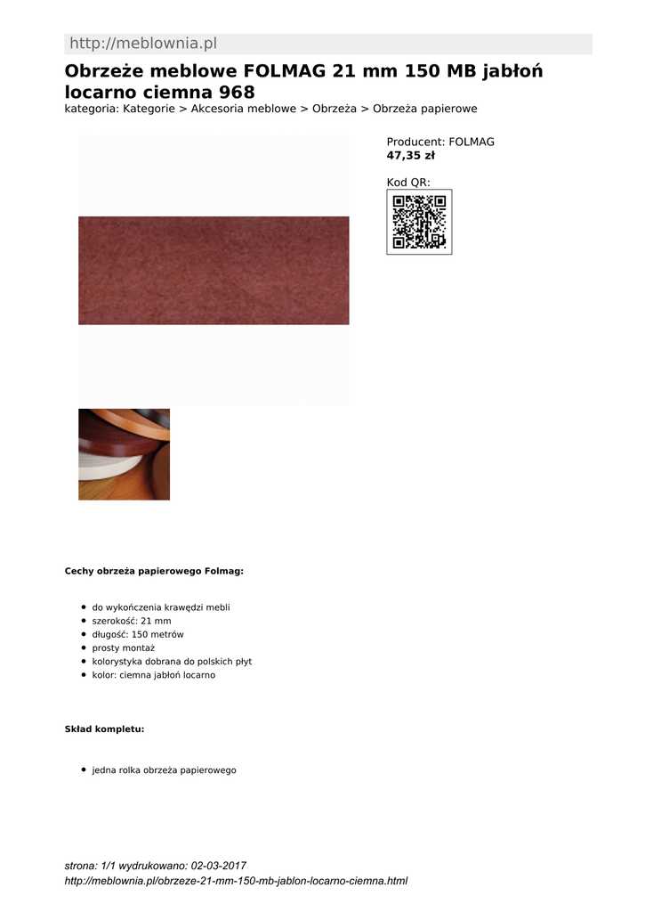 http://meblownia.pl Obrzeże meblowe FOLMAG 21 mm 150 MB jabłoń locarno ciemna 968 kategoria: Kategorie > Akcesoria meblowe > Obrzeża > Obrzeża papierowe Producent: FOLMAG 47,35 zł Kod QR: Cechy obrzeża papierowego Folmag: do wykończenia krawędzi mebli szerokość: 21 mm długość: 150 metrów prosty montaż kolorystyka dobrana do polskich płyt kolor: ciemna jabłoń locarno Skład kompletu: jedna rolka obrzeża papierowego strona: 1/1 wydrukowano: 02-03-2017 http://meblownia.pl/obrzeze-21-mm-150-mb-jablon-locarno-ciemna.html