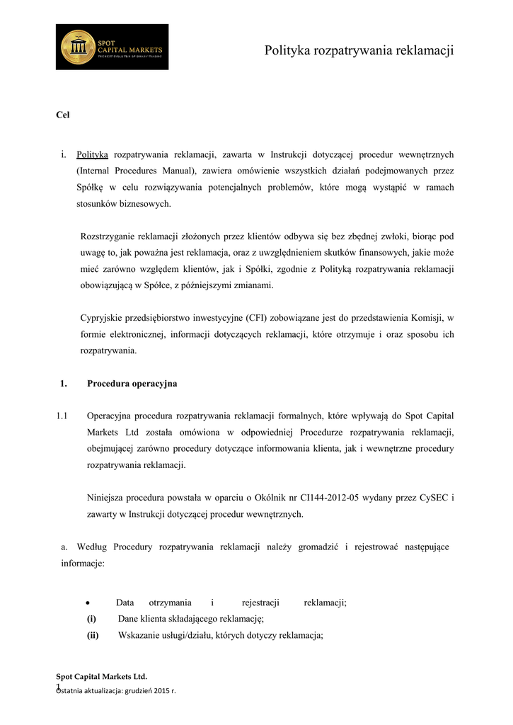 Polityka rozpatrywania reklamacji Cel i. Polityka rozpatrywania reklamacji, zawarta w Instrukcji dotyczącej procedur wewnętrznych (Internal Procedures Manual), zawiera omówienie wszystkich działań podejmowanych przez Spółkę w celu rozwiązywania potencjalnych problemów, które mogą wystąpić w ramach stosunków biznesowych. Rozstrzyganie reklamacji złożonych przez klientów odbywa się bez zbędnej zwłoki, biorąc pod uwagę to, jak poważna jest reklamacja, oraz z uwzględnieniem skutków finansowych, jakie może mieć zarówno względem klientów, jak i Spółki, zgodnie z Polityką rozpatrywania reklamacji obowiązującą w Spółce, z późniejszymi zmianami. Cypryjskie przedsiębiorstwo inwestycyjne (CFI) zobowiązane jest do przedstawienia Komisji, w formie elektronicznej, informacji dotyczących reklamacji, które otrzymuje i oraz sposobu ich rozpatrywania. 1. 1.1 Procedura operacyjna Operacyjna procedura rozpatrywania reklamacji formalnych, które wpływają do Spot Capital Markets Ltd została omówiona w odpowiedniej Procedurze rozpatrywania reklamacji, obejmującej zarówno procedury dotyczące informowania klienta, jak i wewnętrzne procedury rozpatrywania reklamacji. Niniejsza procedura powstała w oparciu o Okólnik nr CI144-2012-05 wydany przez CySEC i zawarty w Instrukcji dotyczącej procedur wewnętrznych. a. Według Procedury rozpatrywania reklamacji należy gromadzić i rejestrować następujące informacje: Data (i) Dane klienta składającego reklamację; (ii) Wskazanie usługi/działu, których dotyczy reklamacja; otrzymania Spot Capital Markets Ltd. 1Ostatnia aktualizacja: grudzień 2015 r. i rejestracji reklamacji; Polityka rozpatrywania reklamacji (iii) Dane pracownika Spółki odpowiedzialnego za usługę/usługi świadczone na rzecz klienta; Treść reklamacji; (iv) Wysokość szkód, które klient twierdzi, że poniósł lub które, w oparciu o treść reklamacji, można przypuszczać, że poniósł; 1.2 (v) Data odpowiedzi Spółki; (vi) Treść pisemnej odpowiedzi Spółki na złożoną reklamację; Informacje na temat jakiejkolwiek korespondencji pomiędzy Spółką a Klientem. Po wpłynięciu reklamacji na adres e-mail:[email protected] należy postępować zgodnie z Polityką rozpatrywania reklamacji i Procedurą rozpatrywania reklamacji. Po otrzymaniu takiej reklamacji przez Spółkę pisemne potwierdzenie odbioru będzie przesyłane do klienta przez Back Office lub Dyrektora ds. zgodności wraz z informacją, że reklamacja zostanie rozpatrzona, a rezultat zostanie przekazany klientowi w przewidywanym terminie. b. Spółka powiadamia klienta za pośrednictwem poczty elektronicznej o przyczynach problemu w ciągu trzech (3) dni roboczych od otrzymania reklamacji. Spółka powiadamia klienta za pośrednictwem poczty elektronicznej o ostatecznym rozwiązaniu w ciągu pięciu (5) dni roboczych od otrzymania reklamacji. 2. Złożenie reklamacji Klienci mogą składać reklamacje, przekazując je Spółce za pomocą Formularza reklamacyjnego (i) Klient jest proszony o należyte wypełnienie formularza reklamacyjnego poprzez wpisanie wszelkich wymaganych informacji oraz podpisanie i opieczętowanie go (jeśli dotyczy). (ii) Formularz reklamacyjny można przesłać Spółce Spot Capital Markets za pośrednictwem poczty elektronicznej na adres: [email protected], Spot Capital Markets Ltd. 2Ostatnia aktualizacja: grudzień 2015 r. Polityka rozpatrywania reklamacji faksem pod numer: + 357 25 377 117 lub listem poleconym przesłanym na adres: 319, 28th October Street, Kanika Business Center, 2nd floor, CY-3105, Limassol (Att [do rąk]: Head of Compliance [Dyrektor Działu Zgodności]). 3. Przyjmowanie reklamacji Po otrzymaniu reklamacji przez Spółkę klient otrzyma wiadomość e-mail z potwierdzeniem otrzymania i przewidywanym terminem przeprowadzenia procedury wyjaśniającej i rozwiązania problemu. W przypadku, gdy reklamacja lub skarga klienta jest uzasadniona, kierownictwo wraz z Dyrektorem Departamentu/Departamentów którego/których reklamacja dotyczy, podejmą wszelkie niezbędne kroki, aby określić i sprawdzić: przyczyny nieprawidłowości w ramach zrealizowanej procedury; słabe punkty mechanizmów kontroli wewnętrznej; Wdrożenie mechanizmów kontroli wewnętrznej, które zapobiegałyby reklamacjom lub skargom w przyszłości. Wszystkie sugerowane procedury powinny być zatwierdzone przez kierownictwo wyższego szczebla na spotkaniu następującym po przeprowadzeniu procedury wyjaśniającej i zostaną zawarte w formularzu dotyczącym rozpatrywania reklamacji. 4. Przegląd Polityki rozpatrywania reklamacji Niniejsza Polityka będzie poddawana przeglądowi i/lub zmianie co roku i/lub w momencie, gdy Zarząd, Dyrektor ds. zgodności uznają to za konieczne. W takim przypadku poprzednia wersja Polityki rozpatrywania reklamacji zostanie zastąpiona nową na stronie internetowej Spot Capital Markets Ltd. Spot Capital Markets Ltd. 3Ostatnia aktualizacja: grudzień 2015 r.