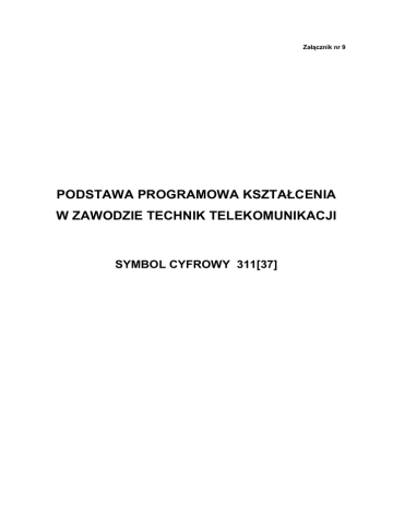 Załącznik nr 9 PODSTAWA PROGRAMOWA KSZTAŁCENIA W ZAWODZIE TECHNIK TELEKOMUNIKACJI SYMBOL CYFROWY 311[37] I. OPIS ZAWODU 1. W wyniku kształcenia w zawodzie absolwent powinien umieć: 1) posługiwać się terminologią stosowaną w telekomunikacji; 2) interpretować podstawowe zjawiska i prawa z zakresu elektrotechniki i elektroniki; 3) określać funkcje oraz określać parametry analogowych, cyfrowych i mikroprocesorowych układów elektronicznych; 4) stosować elementy oraz układy analogowe, cyfrowe i mikroprocesorowe; 5) stosować aparaturę pomiarową i diagnostyczną; 6) montować, uruchamiać i testować układy elektroniczne oraz urządzenia stosowane w telekomunikacji; 7) eksploatować urządzenia i systemy telekomunikacyjne; 8) przestrzegać norm z zakresu eksploatacji urządzeń i systemów telekomunikacyjnych; 9) stosować procedury zalecane przez dostawców urządzeń telekomunikacyjnych; 10) proponować klientom usługi telekomunikacyjne oraz wypełniać dokumenty związane z zawieraniem umów; 11) posługiwać się oprogramowaniem użytkowym w zakresie niezbędnym do wykonania zadań zawodowych; 12) posługiwać się instrukcjami dokumentacją obsługi techniczną oraz układów dokumentacją elektronicznych, serwisową urządzeń telekomunikacyjnych w języku polskim i obcym; 13) posługiwać się językiem obcym w zakresie niezbędnym do wykonywania zadań zawodowych; 14) stosować przepisy prawa dotyczące wykonywanych zadań zawodowych; 15) przestrzegać przepisów i zasad bezpieczeństwa i higieny pracy, przepisów ochrony przeciwpożarowej, ochrony środowiska oraz ochrony przed porażeniem prądem elektrycznym; 16) organizować stanowisko pracy zgodnie z wymaganiami ergonomii; 17) kierować zespołem pracowników; 18) stosować przepisy Kodeksu pracy dotyczące praw i obowiązków pracownika i pracodawcy; 19) udzielać pierwszej pomocy poszkodowanym w wypadkach przy pracy; 2 20) korzystać z różnych źródeł informacji oraz doradztwa specjalistycznego; 21) prowadzić działalność gospodarczą. Kształtowanie postaw przedsiębiorczych oraz przygotowanie do wejścia na rynek pracy powinno przebiegać zarówno w trakcie kształcenia zawodowego, jak i podczas realizacji zajęć edukacyjnych „Podstawy przedsiębiorczości”. 2. Absolwent szkoły kształcącej w zawodzie technik telekomunikacji powinien być przygotowany do wykonywania następujących zadań zawodowych: 1) montowanie, uruchamianie oraz diagnozowanie elementów, układów oraz urządzeń stosowanych w systemach telekomunikacyjnych; 2) wykonywanie napraw sprzętu telekomunikacyjnego; 3) prowadzenie sprzedaży sprzętu telekomunikacyjnego; 4) eksploatacja systemów komutacyjnych; 5) eksploatacja systemów teletransmisyjnych; 6) eksploatacja systemów radiokomunikacyjnych; 7) eksploatacja systemów teleinformatycznych; 8) promocja oraz sprzedaż urządzeń i usług telekomunikacyjnych; 9) realizacja strategii marketingowych. 3. Zawód technik telekomunikacji jest zawodem szerokoprofilowym, umożliwiającym specjalizację pod koniec okresu kształcenia. Szkoła określa umiejętności specjalistyczne biorąc pod uwagę potrzeby regionalnego rynku pracy i zainteresowania uczniów. Tematyka specjalizacji może dotyczyć: 1) komutacyjnych systemów cyfrowych; 2) transmisyjnych systemów cyfrowych; 3) radiokomunikacji; 4) systemów teleinformatycznych; 5) usług telekomunikacyjnych. II. BLOKI PROGRAMOWE Zakres umiejętności i treści kształcenia, wynikające z opisu zawodu, zawierają następujące bloki programowe: 1) podstawy układów i systemów telekomunikacyjnych; 2) eksploatacja telekomunikacyjna; 3) usługi telekomunikacyjne; 4) podstawy działalności zawodowej. 3 BLOK: PODSTAWY UKŁADÓW I SYSTEMÓW TELEKOMUNIKACYJNYCH 1. Cele kształcenia Uczeń (słuchacz) w wyniku kształcenia powinien umieć: 1) rozpoznawać symbole i oznaczenia elementów, podzespołów oraz modułów wchodzących w skład urządzeń i systemów telekomunikacyjnych; się 2) posługiwać dokumentacją techniczną, instrukcjami, schematami montażowymi i ideowymi; 3) wykonywać prace z zakresu obróbki ręcznej metali i tworzyw sztucznych; 4) montować elementy oraz podzespoły elektroniczne i mechaniczne w urządzeniach elektronicznych stosowanych w telekomunikacji; 5) projektować, montować i uruchamiać proste układy elektroniczne analogowe, cyfrowe i mikroprocesorowe; 6) sporządzać dokumentację wykonawczą układów i urządzeń telekomunikacyjnych; 7) wyjaśniać zjawiska zachodzące w polu elektrycznym, magnetycznym i elektromagnetycznym; 8) stosować prawa elektrotechniki; 9) szacować i obliczać wartości wielkości elektrycznych w obwodach prądu stałego i przemiennego; 10) wyjaśniać zasady budowy i użytkowania maszyn i urządzeń elektrycznych oraz instalacji elektrycznych jednofazowych i trójfazowych; 11) rozróżniać funkcje oraz charakteryzować parametry elementów i układów elektronicznych; 12) wyjaśniać działanie i zastosowanie podstawowych układów elektronicznych; 13) dobierać przyrządy, mierzyć parametry elementów i układów elektronicznych stosowanych w telekomunikacji oraz interpretować wyniki pomiarów; 14) wyjaśniać zasady modulacji i demodulacji sygnałów; 15) wyjaśniać zasady przetwarzania analogowo-cyfrowego i cyfrowo- -analogowego; 16) określać i interpretować parametry transmisyjne związane z przesyłaniem sygnałów analogowych i cyfrowych; 4 17) wyjaśniać rolę i działanie poszczególnych bloków systemu mikroprocesorowego; 18) pisać programy z wykorzystaniem listy rozkazów mikroprocesora; 19) programować układy współpracujące z mikroprocesorem; 20) instalować, konfigurować i diagnozować urządzenia techniki komputerowej; 21) oceniać jakość wykonywanej pracy; 22) korzystać z różnych źródeł informacji; 23) przestrzegać przepisów bezpieczeństwa i higieny pracy, ochrony przeciwpożarowej, ochrony od porażeń prądem elektrycznym oraz och