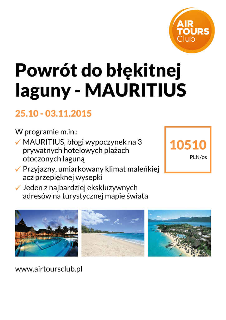 Powrót do błękitnej laguny - MAURITIUS 25.10 - 03.11.2015 W programie m.in.: MAURITIUS, błogi wypoczynek na 3 prywatnych hotelowych plażach otoczonych laguną Przyjazny, umiarkowany klimat maleńkiej acz przepięknej wysepki Jeden z najbardziej ekskluzywnych adresów na turystycznej mapie świata www.airtoursclub.pl 10510 PLN/os
