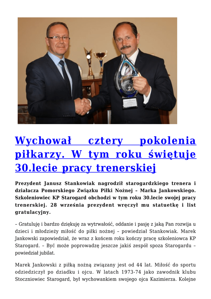 Wychował cztery pokolenia piłkarzy. W tym roku świętuje 30.lecie pracy trenerskiej Prezydent Janusz Stankowiak nagrodził starogardzkiego trenera i działacza Pomorskiego Związku Piłki Nożnej – Marka Jankowskiego. Szkoleniowiec KP Starogard obchodzi w tym roku 30.lecie swojej pracy trenerskiej. 28 września prezydent wręczył mu statuetkę i list gratulacyjny. – Gratuluję i bardzo dziękuję za wytrwałość, oddanie i pasję z jaką Pan rozwija u dzieci i młodzieży miłość do piłki nożnej – powiedział Stankowiak. Marek Jankowski zapowiedział, że wraz z końcem roku kończy pracę szkoleniowca KP Starogard. – Być może poprowadzę jeszcze jakiś zespół spoza Starogardu – powiedział jubilat. Marek Jankowski z piłką nożną związany jest od 44 lat. Miłość do sportu odziedziczył po dziadku i ojcu. W latach 1973-74 jako zawodnik klubu Stoczniowiec Starogard, był wychowankiem swojego ojca Kazimierza. Kolejne cztery sezony spędził w klubie Unii a kolejne osiem grał w Wierzycy Starogard z przerwami na grę w Wiśle Tczew (78-80 i 82-83). Swoją przygodę trenerską rozpoczął w 1986 roku jako instruktor. Rok później, kiedy ukończył słynną Akademię Trenerską przy PZPN w Warszawie, został trenerem II klasy. Zdarzyło mu się trenować seniorów z Unii Tczew i Wietcisy Skarszewy, z którymi awansował nawet do IV ligi w 1998 roku, ale praktycznie przez 30 lat był wierny tylko dwóm klubom – najpierw była to Wierzyca Starogard, a potem KP Starogard. Obecnie szkoli juniorów starszych w KP Starogard Gdański. Trener Marek Jankowski ze swoimi podopiecznymi – juniorzy starsi rocznik 1997/98 Zapytany o swój największy sukces odpowiedział – Sportowo moim największym sukcesem trenerskim jest Mistrzostwo Polski Juniorów o Puchar Michałowicza w 1997 roku. Razem z ojcem poprowadziliśmy do tego zwycięstwa Kadrą Województwa Pomorskiego – rocznik 82. Dwa lata wcześniej w 1995 roku z rocznikiem 81 zdobyliśmy srebrny medal w Pucharze Kuchara – wspomina i dodaje zaraz – Jednak nie to jest najważniejszym osiągnięciem w mojej karierze zawodowej. Przez 30 lat wychowałem cztery pokolenia starogardzkich piłkarzy – mówi trener KP Starogard. – Uczyłem ich nie tylko gry w piłkę nożną, ale też zasad gry fair play. Bywało, że niczym ojciec pomagałem rozwiązywać różne życiowe problemy. Łagodziłem konflikty i uczyłem współpracy w zespole. Dzisiaj wielu z nich już nie trenuje, pracują, pozakładali rodziny, wiem jednak na pewno, że wszyscy nadal kochają sport. Miłość, którą w nich zaszczepiłem, teraz przekazują swoim synom – to jest mój największy sukces – dodał. Spod jego ręki wyszli tacy zawodnicy jak A. Zając, W. Pielecki, S. Czerwiński, W.Kurkowski, P. Wiśniewski, M. Drews, M. Gutjar, A. Szopiński, M. Majewski, D.Neścior, A Wysiecki, i M. Kodrycki. Marek Jankowski od 1994 roku działa też w strukturach Pomorskiego Związku Piłki Nożnej. Przez osiem lat sprawował funkcje wiceprezesa ds. szkolenia, a od tego roku jest członkiem Zarządu Pomorskiego ZPN. Od dwóch kadencji jako radny Rady Miasta Starogard Gdański pełni funkcję Przewodniczącego Komisji Sportu, Rekreacji i Turystyki, wspierając władze miasta w rozwoju sportowej infrastruktury w Starogardzie Gdańskim. Zródło: Marek Gutjar http://kpstarogard.pl/ Encyklopedia Sportowców Kociewskich i