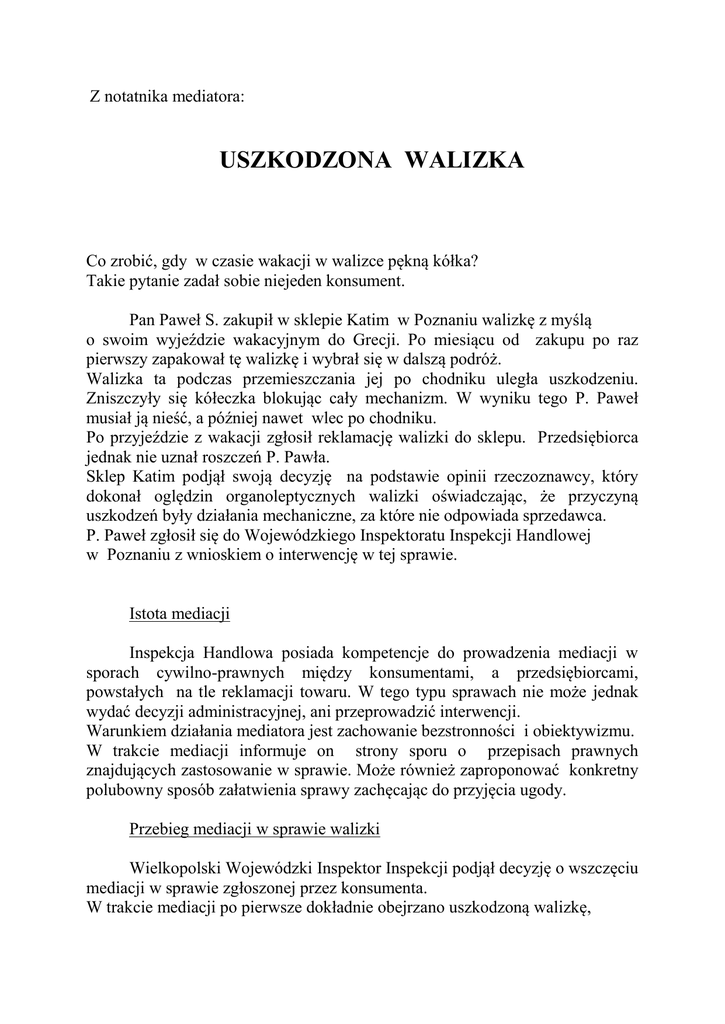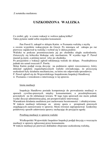 Z notatnika mediatora: USZKODZONA WALIZKA Co zrobić, gdy w czasie wakacji w walizce pękną kółka? Takie pytanie zadał sobie niejeden konsument. Pan Paweł S. zakupił w sklepie Katim w Poznaniu walizkę z myślą o swoim wyjeździe wakacyjnym do Grecji. Po miesiącu od zakupu po raz pierwszy zapakował tę walizkę i wybrał się w dalszą podróż. Walizka ta podczas przemieszczania jej po chodniku uległa uszkodzeniu. Zniszczyły się kółeczka blokując cały mechanizm. W wyniku tego P. Paweł musiał ją nieść, a później nawet wlec po chodniku. Po przyjeździe z wakacji zgłosił reklamację walizki do sklepu. Przedsiębiorca jednak nie uznał roszczeń P. Pawła. Sklep Katim podjął swoją decyzję na podstawie opinii rzeczoznawcy, który dokonał oględzin organoleptycznych walizki oświadczając, że przyczyną uszkodzeń były działania mechaniczne, za które nie odpowiada sprzedawca. P. Paweł zgłosił się do Wojewódzkiego Inspektoratu Inspekcji Handlowej w Poznaniu z wnioskiem o interwencję w tej sprawie. Istota mediacji Inspekcja Handlowa posiada kompetencje do prowadzenia mediacji w sporach cywilno-prawnych między konsumentami, a przedsiębiorcami, powstałych na tle reklamacji towaru. W tego typu sprawach nie może jednak wydać decyzji administracyjnej, ani przeprowadzić interwencji. Warunkiem działania mediatora jest zachowanie bezstronności i obiektywizmu. W trakcie mediacji informuje on strony sporu o przepisach prawnych znajdujących zastosowanie w sprawie. Może również zaproponować konkretny polubowny sposób załatwienia sprawy zachęcając do przyjęcia ugody. Przebieg mediacji w sprawie walizki Wielkopolski Wojewódzki Inspektor Inspekcji podjął decyzję o wszczęciu mediacji w sprawie zgłoszonej przez konsumenta. W trakcie mediacji po pierwsze dokładnie obejrzano uszkodzoną walizkę, w której z łatwością można było zauważyć znaczne starcie jednego z kółek walizki i okolicznych elementów. Kółko było zablokowane. Mediator zwrócił uwagę, że uzyskana przez sklep Katim opinia została wydana przez osobę posiadającą uprawnienia rzeczoznawcy w zakresie obuwia, wyrobów skórzanych i kaletnictwa, nie zaś walizek. Uszkodzenie dotyczyło elementów składających się z gumy i tworzywa sztucznego. Rzeczoznawca w swojej „opinii” nie wspomniał nawet o zablokowaniu się kółka. Mediator wskazał na przepisy art. 4 i 8 Ustawy z dnia 27 lipca 2002 r. o szczególnych warunkach sprzedaży konsumenckiej oraz o zmianie Kodeksu cywilnego /Dz. U. nr 141, poz. 1176, ze zm./. Wynika z nich, że skoro konsument zgłosił reklamację w terminie krótszym, niż 6 miesięcy, licząc od daty zakupu i wydania rzeczy, to przysługuje mu szczególna ochrona wynikająca z domniemania o istnieniu niezgodności towaru z umową w momencie sprzedaży walizki. Przedsiębiorca biorąc pod uwagę przekazane mu informacje, uwagi i wątpliwości przeanalizował dokładnie wszystkie okoliczności sprawy oraz ich znaczenie prawne, w wyniku czego podjął decyzję o wypłaceniu konsumentowi gotówki w wysokości kwoty zakupu walizki. O decyzji tej poinformowano konsumenta, który w takiej sytuacji nie musiał dochodzić swoich roszczeń na drodze sądowej. Jeszcze uwaga Dobrze jest sprawdzić świeżo zakupiony towar, jeżeli zamierzamy go wykorzystać po raz pierwszy w trakcie dalszego wyjazdu. Gdy jesteś na wakacjach, w czasie których popsuje się walizka, buty lub inny towar który jest tam niezbędny, lub nie masz nic innego w zastępstwie, trzeba telefonicznie zawiadomić sprzedawcę o ujawnionej usterce oraz ustalić dalszy sposób postępowania. W innym wypadku trudniej będzie dochodzić swoich praw, szczególnie gdy jesteś zmuszony do dalszego używania uszkodzonego towaru i jego całkowitego zniszczenia. Taka reklamacja zgłoszona później po przyjeździe może być odrzucona właśnie z powodu zniszczenia, gdyż w takiej sytuacji nie sposób ustalić przyczyny uszkodzenia.