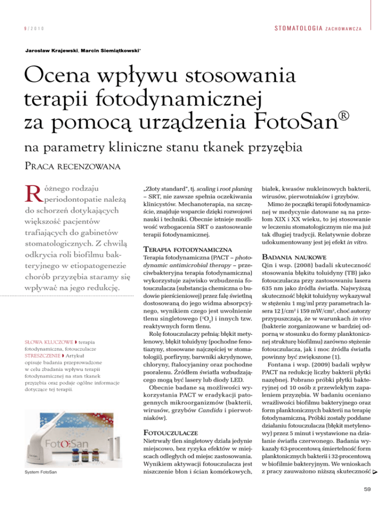S TOMATOLOGIA 9/2010 zachowawcza Jarosław Krajewski, Marcin Siemiątkowski* Ocena wpływu stosowania terapii fotodynamicznej za pomocą urządzenia FotoSan® na parametry kliniczne stanu tkanek przyzębia Praca recenzowana R óżnego rodzaju periodontopatie należą do schorzeń dotykających większość pacjentów trafiających do gabinetów stomatologicznych. Z chwilą odkrycia roli biofilmu bakteryjnego w etiopatogenezie chorób przyzębia staramy się wpływać na jego redukcję. Słowa kluczowe terapia fotodynamiczna, fotouczulacze Streszczenie Artykuł opisuje badania przeprowadzone w celu zbadania wpływu terapii fotodynamicznej na stan tkanek przyzębia oraz podaje ogólne informacje dotyczące tej terapii. „Złoty standard”, tj. scaling i root planing – SRT, nie zawsze spełnia oczekiwania klinicystów. Mechanoterapia, na szczęście, znajduje wsparcie dzięki rozwojowi nauki i techniki. Obecnie istnieje możliwość wzbogacenia SRT o zastosowanie terapii fotodynamicznej. Terapia fotodynamiczna Terapia fotodynamiczna (PACT – photodynamic antimicrobial therapy – przeciwbakteryjna terapia fotodynamiczna) wykorzystuje zajwisko wzbudzenia fotouczulacza (substancja chemiczna o budowie pierścieniowej) przez falę świetlną dostosowaną do jego widma absorpcyjnego, wynikiem czego jest uwolnienie tlenu singletowego (1O2) i innych tzw. reaktywnych form tlenu. Rolę fotouczulaczy pełnią: błękit metylenowy, błękit toluidyny (pochodne fenotiazyny, stosowane najczęściej w stomatologii), porfiryny, barwniki akrydynowe, chloryny, ftalocyjaniny oraz pochodne psoralenu. Źródłem światła wzbudzającego mogą być lasery lub diody LED. Obecnie badane są możliwości wykorzystania PACT w eradykacji patogennych mikroorganizmów (bakterii, wirusów, grzybów Candida i pierwotniaków). Fotouczulacze System FotoSan Nietrwały tlen singletowy działa jedynie miejscowo, bez ryzyka efektów w miejscach odległych od miejsc zastosowania. Wynikiem aktywacji fotouczulacza jest niszczenie błon i ścian komórkowych, białek, kwasów nukleinowych bakterii, wirusów, pierwotniaków i grzybów. Mimo że początki terapii fotodynamicznej w medycynie datowane są na przełom XIX i XX wieku, to jej stosowanie w leczeniu stomatologicznym nie ma już tak długiej tradycji. Relatywnie dobrze udokumentowany jest jej efekt in vitro. Badania naukowe Qin i wsp. (2008) badali skuteczność stosowania błękitu toluidyny (TB) jako fotouczulacza przy zastosowaniu lasera 635 nm jako źródła światła. Najwyższą skuteczność błękit toluidyny wykazywał w stężeniu 1 mg/ml przy parametrach lasera 12 J/cm2 i 159 mW/cm2, choć autorzy przypuszczają, że w warunkach in vivo (bakterie zorganizowane w bardziej odporną w stosunku do formy planktonicznej strukturę biofilmu) zarówno stężenie fotouczulacza, jak i moc źródła światła powinny być zwiększone (1). Fontana i wsp. (2009) badali wpływ PACT na redukcję liczby bakterii płytki nazębnej. Pobrano próbki płytki bakteryjnej od 10 osób z przewlekłym zapaleniem przyzębia. W badaniu oceniano wrażliwości biofilmu bakteryjnego oraz form planktonicznych bakterii na terapię fotodynamiczną. Próbki zostały poddane działaniu fotouczulacza (błękit metylenowy) przez 5 minut i wystawione na działanie światła czerwonego. Badania wykazały 63-procentową śmiertelność form planktonicznych bakterii i 32-procentową w biofilmie bakteryjnym. We wnioskach z pracy zauważono niższą skuteczność 59 S TOMATOLOGIA T zachowawcza terapii w odniesieniu do biofilmu bakteryjnego, jednocześnie podkreślając i tak o wiele większą skuteczność w porównaniu do tej, z jaką mamy do czynienia w przypadku zastosowania antybiotyków w podobnych warunkach. W badaniach in vitro oceniano też bezpieczeństwo zastosowania terapii fotodynamicznej dla tkanek gospodarza. Soukos i wsp. (1998) podali, że połączenie poli-L-lizyny i chlorinu-e6 (bakteriobójcze w stosunku do P. gingivalis i A. viscosus) nie działa cytotoksycznie na komórki błony śluzowej jamy ustnej (3). Kömerink i wsp. (2000) w badaniu zawiesiny lipopolisacharydów (LPS) bakterii E. coli i proteaz P. aeruginosa poddanych działaniu terapii fotodynamicznej dowiedli, że PACT ma zdolność do redukcji ich aktywności biologicznej (4). Wyniki badań in vitro znalazły potwierdzenie w badaniach in vivo na modelach zwierzęcych i w badaniach klinicznych u pacjentów. De Almeida (2008) na podstawie przeprowadzonych doświadczeń (oceniał histologicznie i radiologicznie wpływ terapii fotodynamicznej na parametry tkanek przyzębia szczurów) proponuje stosowanie terapii fotodynamicznej jako wspomagającego elementu tradycyjnej terapii chorób przyzębia (5). Qin i wsp. (2008) w swoim doświadczeniu porównali skuteczność terapii fotodynamicznej i tradycyjnej mechanoterapii. W ocenie uwzględniono całkowitą liczbę bakterii, jak też obraz histologiczny tkanek przyzębia (16). Pierwsza grupa została poddana jedynie działaniu błękitu toluidyny w stężeniu 1 mg/ml i lasera o świetle czerwonym o energii 12 J/cm2, w drugiej przeprowadzono tylko scaling i root planing. W obu grupach osiągnięto podobne rezultaty, tzn. Parametr PD śr. [mm] BOP [%] PI [%] Grupa N Średnia Badana 20 2,5 Kontrolna 20 Wizyta 1 MeSD diana 0,6 2,5 Efektywność FotoSan (CMS Dental®) – badanie kliniczne Materiał i metody W badaniu wzięło udział 40 pacjentów między 35. a 70. rokiem życia z rozpoznanym przewlekłym zapaleniem przyzębia, posiadających minimum 10 zębów własnych. Pacjenci zostali wyłonieni spośród osób leczonych w Zakładzie Chorób Błony Śluzowej i Przyzębia. Q1 Q3 2,3 2,7 20 3,9 1,7 0,4 r z e g l ą d S Zmiana pomiedzy W2 a W1 ŚredMeSD N Q1 Q3 nia diana p12 p badkont Q1 Q3 1,8 1,4 1,9 20 -0,8 0,5 -0,8 -1,0 -0,6 0,000 0,000 1,9 3,5 20 -0,2 0,3 -0,2 -0,4 0,0 0,008 2,9 1,1 2,8 2,2 20 2,7 1,0 2,8 20 46,3 17,6 43,6 36,7 57,0 20 23,8 11,1 23,4 15,0 32,4 20 -22,5 11,2 -1
