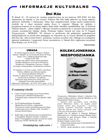 INFORMACJE KULTURALNE Dni Kóz W dniach 18 - 20 czerwca br. zostaną zorganizowane, po raz pierwszy DNI KÓZ. Już dziś zapraszamy do udziału w tym święcie. Podczas Dni Kóz będą odbywać się liczne imprezy sportowe, kulturalne i rekreacyjne. Sama idea zorganizowania święta naszej miejscowości zrodziła się z chęci promocji gminy Kozy w regionie. Dlatego też niektóre z przygotowywanych na tę okazję imprez będą miały charakter ponadlokalny (np. II Festiwal Orkiestr Dętych - „Złota Trąbka”). Obecnie czynione są starania by w naszych uroczystościach czynnie uczestniczyły lokalne media. Promocja imprez ruszyła już teraz na X Targach Turystycznych - BESKIDY ‘99. Otwiera to możliwości dla podmiotów gospodarczych funkcjonujących na terenie Kóz polegające na włączeniu się ze swymi ofertami do programu Dni Kóz (np. „Dni otwarte Firmy”, promocja, wystawa wyrobów itd.). Dlatego też oczekujemy zgłoszeń podmiotów i propozycji formy uczestnictwa w Dniach Kóz (zgłoszenia przyjmuje Dom Kultury, tel. 8174-232). Zapraszamy. UWAGA W ramach organizowanych „Wakacji z Domem Kultury” odbędzie się wycieczka dla dzieci do Pragi. Zapisy wraz z wpłatą przyjmowane będą od dnia 01.06.1999 (uwaga: przy zapisie należy okazać paszport). Ponadto odbędą się wycieczki do Wrocławia. Wambierzyc, Zakopanego, Pszczyny i Ochab (szczegóły zostaną podane w późniejszym terminie). KOLEKCJONERSKA NIESPODZIANKA W niedzielę 13 czerwca o godz. 16.00 w sali Domu Kultury odbędzie się cykliczna impreza pt: „Promocja Młodych Talentów”. Prosimy o zgłaszanie dzieci i młodzieży uzdolnionej artystycznie do udziału w tej imprezie. Zgłoszenia mogą dokonywać szkoły, placówki kulturalne oraz osoby indywidualne. Zgłoszenia i informacje - tel. 8174 -232 w godz. 13-18. Z ostatniej chwili: Grupa Teatralna działająca przy Domu Kultury uczestniczyła w Bielskich Spotkaniach Teatralnych gdzie zaprezentowała spektakl „Mały Książe”. Do III Ogólnopolskiego Przeglądu Młodzieżowych Filmów Amatorskich (Warszawia) zostały zakwalifikowane dwa filmy zrealizowane przez członków AKF „Kozfilm” z naszego Domu Kultury. Radek Zgut został uhonorowany wyróżnieniem na V Przeglądzie Młodych Talentów w Bielsku Białej. W przeglądzie tym także uczetniczył zespół muzyczny NIGHT PROWLER z Kóz. Gratulujemy sukcesów ! Towarzystwo Miłośników Historii i Zabytków Kóz wydało książkę autorstwa Andrzeja Blachury pt: Od Wapennika do Monte Cassino. "... Spośród wielu uczestników wojny wybrałem postać Władysława Żurka... nie mogłem jednak pominąć postaci jego przyjaciela i towarzysza wojennej wędrówki Franciszka Koziołka... Ich żołnierska tułaczka była częścią wojennych losów wielu naszych koziańskich rodaków." Książka jest do nabycia w Gminnej Bibliotece Publicznej oraz w Gminnym Zespole Obsługi Szkół i Przedszkola (u pani Krystyny Hałat) w budynku Domu Kultury. Cena: 10.- zł. Wydanie książki wsparły firmy: Zakład Elektroinstalacyjny ELEKTROINSTAL (Antoni Kruczalak) HAND - sprzęt ogrodniczy, leśny i komunalny.