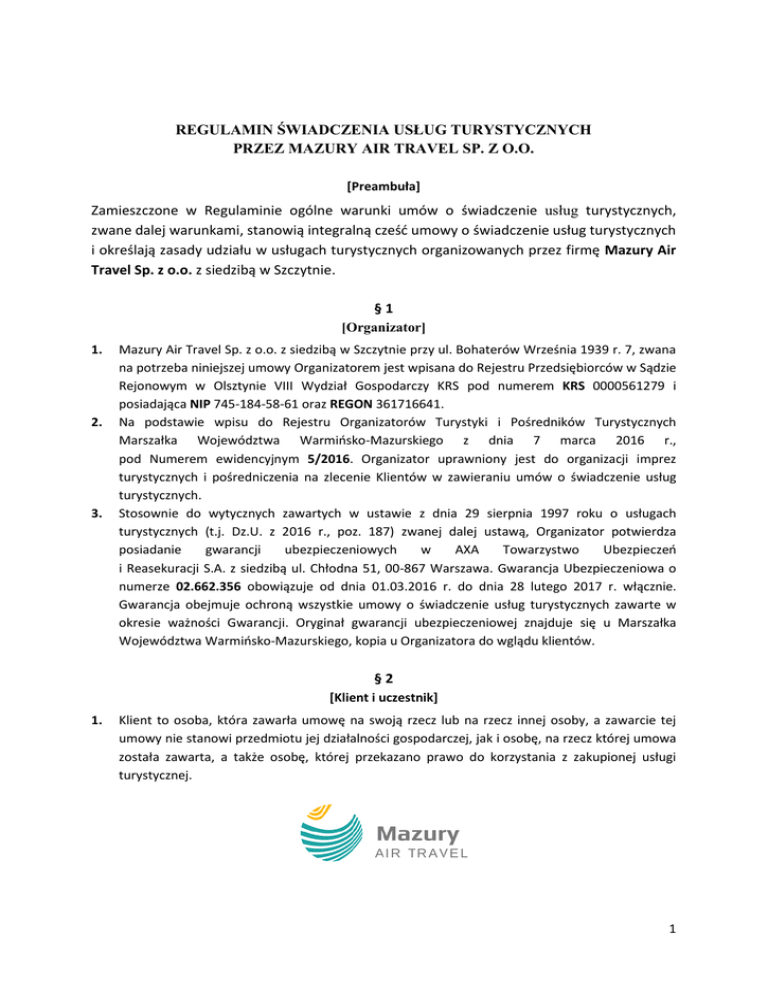 REGULAMIN ŚWIADCZENIA USŁUG TURYSTYCZNYCH PRZEZ MAZURY AIR TRAVEL SP. Z O.O. [Preambuła] Zamieszczone w Regulaminie ogólne warunki umów o świadczenie usług turystycznych, zwane dalej warunkami, stanowią integralną cześć umowy o świadczenie usług turystycznych i określają zasady udziału w usługach turystycznych organizowanych przez firmę Mazury Air Travel Sp. z o.o. z siedzibą w Szczytnie. §1 [Organizator] 1. 2. 3. Mazury Air Travel Sp. z o.o. z siedzibą w Szczytnie przy ul. Bohaterów Września 1939 r. 7, zwana na potrzeba niniejszej umowy Organizatorem jest wpisana do Rejestru Przedsiębiorców w Sądzie Rejonowym w Olsztynie VIII Wydział Gospodarczy KRS pod numerem KRS 0000561279 i posiadająca NIP 745-184-58-61 oraz REGON 361716641. Na podstawie wpisu do Rejestru Organizatorów Turystyki i Pośredników Turystycznych Marszałka Województwa Warmińsko-Mazurskiego z dnia 7 marca 2016 r., pod Numerem ewidencyjnym 5/2016. Organizator uprawniony jest do organizacji imprez turystycznych i pośredniczenia na zlecenie Klientów w zawieraniu umów o świadczenie usług turystycznych. Stosownie do wytycznych zawartych w ustawie z dnia 29 sierpnia 1997 roku o usługach turystycznych (t.j. Dz.U. z 2016 r., poz. 187) zwanej dalej ustawą, Organizator potwierdza posiadanie gwarancji ubezpieczeniowych w AXA Towarzystwo Ubezpieczeń i Reasekuracji S.A. z siedzibą ul. Chłodna 51, 00-867 Warszawa. Gwarancja Ubezpieczeniowa o numerze 02.662.356 obowiązuje od dnia 01.03.2016 r. do dnia 28 lutego 2017 r. włącznie. Gwarancja obejmuje ochroną wszystkie umowy o świadczenie usług turystycznych zawarte w okresie ważności Gwarancji. Oryginał gwarancji ubezpieczeniowej znajduje się u Marszałka Województwa Warmińsko-Mazurskiego, kopia u Organizatora do wglądu klientów. §2 [Klient i uczestnik] 1. Klient to osoba, która zawarła umowę na swoją rzecz lub na rzecz innej osoby, a zawarcie tej umowy nie stanowi przedmiotu jej działalności gospodarczej, jak i osobę, na rzecz której umowa została zawarta, a także osobę, której przekazano prawo do korzystania z zakupionej usługi turystycznej. 1 2. 3. Klient deklaruje, że stan jego zdrowia umożliwia mu udział w usłudze turystycznej będącej przedmiotem umowy. Uczestnik to osoba biorąca udział w realizowanej przez Organizatora usłudze turystycznej. §3 [Zawarcie umowy] 1. 2. 3. 4. 5. Akceptując ofertę zaprezentowaną przez upoważnionego przedstawiciela Organizatora, Klient występuje wiążąco o zawarcie umowy dotyczącej świadczenia usług turystycznych. Wpłata należności za usługę turystyczną jest równoznaczna z zawarciem umowy. Nierozłącznym elementem umowy jest przedstawiona oferta i niniejszy Regulamin zawierający ogólne warunki umów o świadczenie usług turystycznych. Wpłacając należność za usługę turystyczną Klient oświadcza, że zapoznał się z ofertą i warunkami świadczenia usługi turystycznej, a także wyraża zgodę na przetwarzanie i udostępnianie danych osobowych wyłącznie dla celów realizacji umowy. Wystawiony przez Organizatora paragon fiskalny lub faktura VAT stanowią jedyne potwierdzenie zawarcia umowy. §4 [Organizacja wycieczki] 1. 2. 3. 4. 5. 6. 7. 8. Usługi turystyczne wykonywane przez Organizatora polegają na organizacji wycieczek. Zakres i warunki świadczenia usług, terminy wyjazdu i powrotu oraz ustalenia szczegółowe są określone w ofercie przedstawianej przy jej prezentacji przez przedstawicieli Organizatora lub na stronie internetowej pod linkiem www.mazuryairtravel.pl/wycieczki-po-warmii-i-mazurach/. Organizator zobowiązuje się do należytego świadczenia usług zgodnie z warunkami określonymi w przedstawionej ofercie. Wycieczki rozpoczynają się w dniu i o godzinie podanej w ofercie, bez względu na osoby spóźnione. Godziny odjazdów z poszczególnych miejsc, etapów podawane są na bieżąco przez pilota lub przewodnika. Spóźnienie lub niestawienie się na wycieczkę lub etapy pośrednie w ustalonym terminie traktowane jest jak rezygnacja z imprezy, bez prawa do zwrotu należności. Godzina powrotu z wycieczki jest orientacyjna i może ulec zmianie z przyczyn niezależnych od Organizatora, za co nie ponosi on odpowiedzialności. Zmiany w zakresie i warunkach świadczenia usługi dokonywane ze strony Organizatora są dopuszczalne, o ile są niezbędne, nie są znaczące, a podstawowa forma usługi nie 2 9. zostaje zmieniona. W myśl tej zasady może więc ulec zmianie program i kolejność zwiedzania. Organizator zastrzega sobie również prawo dokonania istotnej zmiany programu wycieczki w sytuacji pogorszenia pogody w części programu od niej zależnej §5 [Odwołanie wycieczki] 1. 2. 3. 4. 5. Organizator zastrzega sobie możliwość odwołania wycieczki z powodów: 1) od siebie niezależnych, w szczególności siły wyższej, 2) zgłoszenia się mniejszej liczby uczestników niż liczba minimalna, tj. 18 osób. W przypadku określonym w ust. 1 pkt 1 Klient zostanie niezwłocznie zawiadomiony o fakcie odwołania wycieczki i jego przyczynach telefonicznie lub mailowo z adresu [email protected]. O odwołaniu wycieczki, z uwagi na zbyt małą liczbę uczestników Organizator zawiadomi Klientów, telefonicznie lub mailowo nie później niż na dwa dni przed planowanym terminem jej rozpoczęcia. W razie odwołania wycieczki, po okazaniu i zwrocie przez Klienta paragonu fiskalnego lub faktury VAT dokumentującej zawarcie umowy, Organizator zwraca w całości wniesioną opłatę. Brak zwrotu paragonu fiskalnego lub faktury VAT za zakupioną usługę, równoznaczny jest z odmową zwrotu uiszczonej należności za niezrealizowaną usługę. §6 [Warunki i koszt rezygnacji z wycieczki przez klienta] 1. 2. 3. Klient może zrezygnować z udziału w imprezie turystycznej, składając w tym zakresie oświadczenie w formie pisemnej. Z uwagi na poniesione koszty przy organizacji wycieczki Organizator ma prawo do dokonania potrąceń z uiszczonej pr