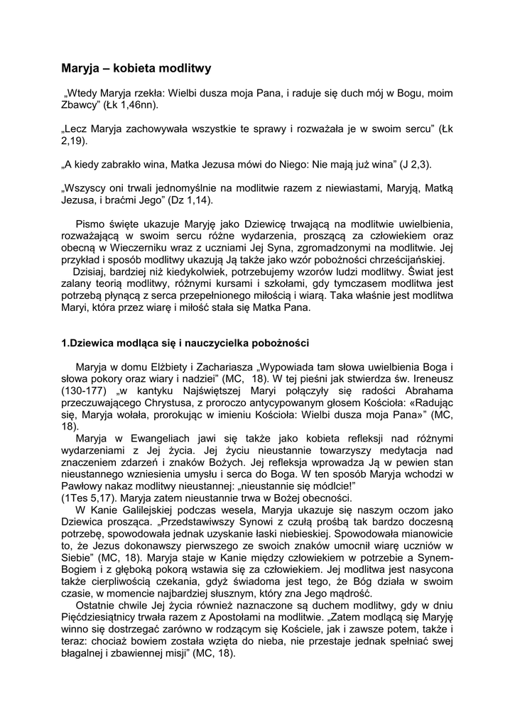 Maryja – kobieta modlitwy „Wtedy Maryja rzekła: Wielbi dusza moja Pana, i raduje się duch mój w Bogu, moim Zbawcy” (Łk 1,46nn). „Lecz Maryja zachowywała wszystkie te sprawy i rozważała je w swoim sercu” (Łk 2,19). „A kiedy zabrakło wina, Matka Jezusa mówi do Niego: Nie mają już wina” (J 2,3). „Wszyscy oni trwali jednomyślnie na modlitwie razem z niewiastami, Maryją, Matką Jezusa, i braćmi Jego” (Dz 1,14). Pismo święte ukazuje Maryję jako Dziewicę trwającą na modlitwie uwielbienia, rozważającą w swoim sercu różne wydarzenia, proszącą za człowiekiem oraz obecną w Wieczerniku wraz z uczniami Jej Syna, zgromadzonymi na modlitwie. Jej przykład i sposób modlitwy ukazują Ją także jako wzór pobożności chrześcijańskiej. Dzisiaj, bardziej niż kiedykolwiek, potrzebujemy wzorów ludzi modlitwy. Świat jest zalany teorią modlitwy, różnymi kursami i szkołami, gdy tymczasem modlitwa jest potrzebą płynącą z serca przepełnionego miłością i wiarą. Taka właśnie jest modlitwa Maryi, która przez wiarę i miłość stała się Matka Pana. 1.Dziewica modląca się i nauczycielka pobożności Maryja w domu Elżbiety i Zachariasza „Wypowiada tam słowa uwielbienia Boga i słowa pokory oraz wiary i nadziei” (MC, 18). W tej pieśni jak stwierdza św. Ireneusz (130-177) „w kantyku Najświętszej Maryi połączyły się radości Abrahama przeczuwającego Chrystusa, z proroczo antycypowanym głosem Kościoła: «Radując się, Maryja wołała, prorokując w imieniu Kościoła: Wielbi dusza moja Pana»” (MC, 18). Maryja w Ewangeliach jawi się także jako kobieta refleksji nad różnymi wydarzeniami z Jej życia. Jej życiu nieustannie towarzyszy medytacja nad znaczeniem zdarzeń i znaków Bożych. Jej refleksja wprowadza Ją w pewien stan nieustannego wzniesienia umysłu i serca do Boga. W ten sposób Maryja wchodzi w Pawłowy nakaz modlitwy nieustannej: „nieustannie się módlcie!” (1Tes 5,17). Maryja zatem nieustannie trwa w Bożej obecności. W Kanie Galilejskiej podczas wesela, Maryja ukazuje się naszym oczom jako Dziewica prosząca. „Przedstawiwszy Synowi z czułą prośbą tak bardzo doczesną potrzebę, spowodowała jednak uzyskanie łaski niebieskiej. Spowodowała mianowicie to, że Jezus dokonawszy pierwszego ze swoich znaków umocnił wiarę uczniów w Siebie” (MC, 18). Maryja staje w Kanie między człowiekiem w potrzebie a SynemBogiem i z głęboką pokorą wstawia się za człowiekiem. Jej modlitwa jest nasycona także cierpliwością czekania, gdyż świadoma jest tego, że Bóg działa w swoim czasie, w momencie najbardziej słusznym, który zna Jego mądrość. Ostatnie chwile Jej życia również naznaczone są duchem modlitwy, gdy w dniu Pięćdziesiątnicy trwała razem z Apostołami na modlitwie. „Zatem modlącą się Maryję winno się dostrzegać zarówno w rodzącym się Kościele, jak i zawsze potem, także i teraz: chociaż bowiem została wzięta do nieba, nie przestaje jednak spełniać swej błagalnej i zbawiennej misji” (MC, 18). Dla całego Kościoła i poszczególnych chrześcijan Maryja stała się wzorem, jak „ze swego własnego życia uczynić kult należny Bogu, a z samej czci zadanie swego życia” (MC, 21). Św. Ambroży 340-397) w swoim kazaniu wołał do wiernych już w IV w.: „Oby w każdym był duch Maryi, by uwielbiał Boga; oby w każdym był duch, by radował się w Bogu" (MC, 21). Maryja jest także w swojej modlitwie Służebnicą, która zgadza się na Boży plan w swoim życiu. W ten sposób niejako antycypuje słowa, których Chrystus uczył swoich uczniów: "«Bądź wola twoja». Zatem przyzwolenie Maryi jest dla wszystkich chrześcijan pouczeniem i przykładem, jak posłuszeństwo dla woli Ojca ma się stać drogą i pomocą do świętości każdego” (MC, 21). Maryja jest wymownym przykładem ducha ofiary, który staje do modlitwy w otwartości serca na wszystko, co Bóg daje, nie zakładając niejako z góry, jak Bóg ma działać. 2. Wzniesienie duszy do Boga Wielcy mistrzowie życia duchowego ukazują modlitwę jako wzniesienie duszy do Boga lub prośbę człowieka skierowaną do Stwórcy o stosowne dla niego dobra: „Modlitwa lub inaczej dialog z Bogiem jest dobrem najwyższym. Istotnie, jest ona intymną komunią z Bogiem. Tak jak oczy ciała widzą światło i są nim rozświetlone, tak samo dusza ukierunkowana na Boga zostaje oświecona niewyrażalnym światłem modlitwy. Musi to jednak być modlitwa wypływająca z serca, a nie jedynie z przyzwyczajenia” (św. Jan Chryzostom, 350-407). Z tej definicji wynikają dwie podstawowe prawdy: skończoność bytu ludzkiego, który musi wznieść się do Boga – człowiek jako stworzenie, nieustannie potrzebuje Boga, który daje mu oddech życia oraz wszystko, co jest mu konieczne do życia. Modlitwa jest działaniem Boga i człowieka przez Chrystusa w Duchu Świętym. Bóg nie potrzebuje naszej modlitwy – to człowiek potrzebuje Bożej pomocy. Stwórca zaś obdarza go różnymi dobrami, by z coraz większą ufnością zwracał się do Niego (por. KKK 2563, 2563-2564). prawdę o Bogu świętym i nieskończonym, Stwórcy człowieka i Jego Odkupicielu - Bóg od wieków wkracza w życie człowieka i zaprasza go do współdziałania ze swoją łaską. Wzniesienie duszy do Boga jest swego rodzaju stanem bycia wobec Stwórcy, wyrazem darmowości ludzkiego istnienia i poczucia grzeszności człowieka. Z drugiej strony przez wzniesienie swej duszy do Boga, człowiek doświadcza Jego wielkości i fascynującej doskonałości (por. KKK 2559). Podobne doświadczenie modlitwy ukazuje nam św. Jan Klimak (525-600), który nazywa modlitwę “dialogiem człowieka z Bogiem, zjednoczeniem mistycznym”. Człowiek potrzebuje Boga, nawet, gdy do końca sobie tego nie uświadamia lub zaprzecza temu faktowi. Modlitwa zatem jest swego rodzaju zanurzeniem się tego, co skończone, słabe i podlegające śmierci w Tym, który jest N