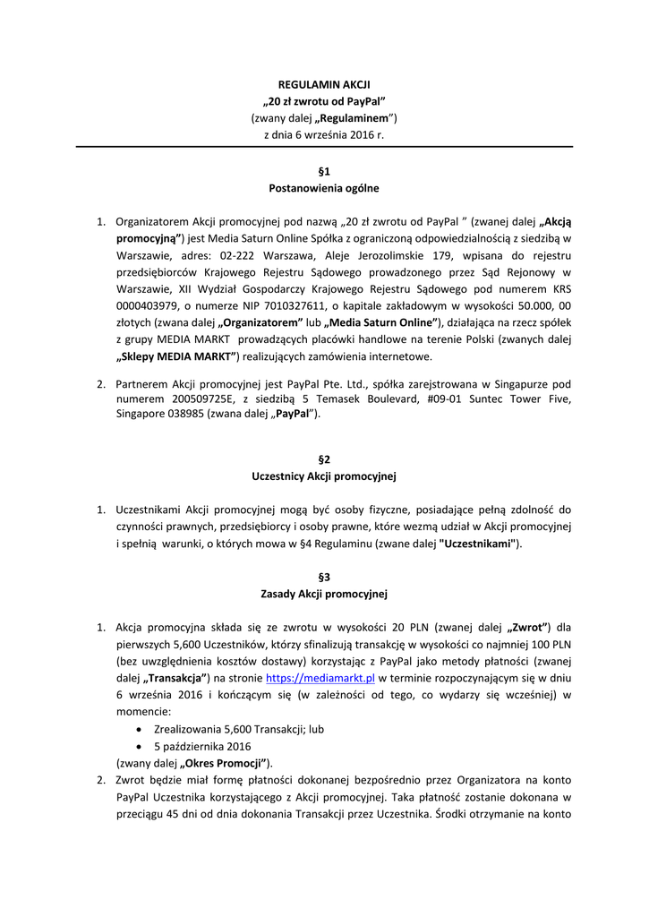 REGULAMIN AKCJI „ zł zwrotu od PayPal” (zwany dalej „Regula i e ” z dnia 6 wrześ ia 2016 r. § Posta owie ia ogól e 1. Organizatorem Akcji promocyjnej pod azwą „ zł zwrotu od PayPal ” zwa ej dalej „Akcją pro ocyj ą”) jest Media Saturn O li e Spółka z ogra i zo ą odpowiedzial oś ią z siedzi ą w Warszawie, adres: 02-222 Warszawa, Aleje Jerozolimskie 179, wpisana do rejestru przedsię ior ów Krajowego Rejestru Sądowego prowadzo ego przez Sąd Rejo owy w Warszawie, XII Wydział Gospodar zy Krajowego Rejestru Sądowego pod u ere KRS , o u erze NIP , o kapitale zakładowy w wysokoś i . , złoty h zwa a dalej „Orga izatore ” lub „Media Satur O li e”), działają a a rze z spółek z grupy MEDIA MARKT prowadzą y h pla ówki ha dlowe a terenie Polski (zwanych dalej „Sklepy MEDIA MARKT” realizują y h za ówie ia i ter etowe. 2. Partnerem Akcji promocyjnej jest PayPal Pte. Ltd., spółka zarejstrowa a w Si gapurze pod numerem 200509725E, z siedzi ą 5 Temasek Boulevard, #09-01 Suntec Tower Five, Singapore 038985 zwa a dalej „PayPal” . §2 Uczestnicy Akcji promocyjnej 1. U zest ika i Ak ji pro o yj ej ogą yć oso y fizy z e, posiadają e peł ą zdol ość do zy oś i praw y h, przedsię ior y i oso y praw e, które wez ą udział w Ak ji pro o yjnej i speł ią warunki, o których owa w § Regula i u zwa e dalej "Uczestnikami"). §3 Zasady Akcji promocyjnej 1. Ak ja pro o yj a składa się ze zwrotu w wysokoś i PLN zwanej dalej „Zwrot”) dla pierwszych 5,600 U zest ików, którzy sfi alizują tra sak ję w wysokoś i o aj iej PLN ez uwzględ ie ia kosztów dostawy korzystają z PayPal jako etody płat oś i (zwanej dalej „Tra sakcja”) na stronie https://mediamarkt.pl w termi ie rozpo zy ają y się w d iu 6 wrześ ia 2016 i koń zą y się w zależ oś i od tego, o wydarzy się w ześ iej) w momencie: Zrealizowania 5,600 Transakcji; lub paździer ika 2016 (zwany dalej „Okres Pro ocji”). 2. )wrot ędzie iał for ę płat oś i doko a ej ezpośred io przez Organizatora na konto PayPal Uczestnika korzystają ego z Ak ji pro o yj ej. Taka płat ość zostanie dokonana w prze iągu d i od dnia dokonania Transakcji przez Uczestnika. Środki otrzy a ie a ko to 3. 4. 5. 6. 7. 8. PayPal przez Uczestnika w ra a h Ak ji pro o yj ej ędą mogły zostać wykorzystane w dowol y sposó . Jeden u zest ik oże skorzystać z Ak ji pro o yj ej tylko raz. Jeśli u zest ik korzystają y z Ak ji pro o yj ej a uluje Tra sak ję, )wrot staje się auto aty z ie ieważ y i ie zostanie wypła ony uczestnikowi przez Organizatora. Uczestnik w ały Okresie Promocji oże jednorazowo skorzystać z zł zwrotu pie iędzy rabatu w wysokoś i zł (dwadzieś ia złoty h) (zwanego dalej „CashbackRabatem”) za na jed ą tra sak ję powyżej zł sto złoty h doty zą ą zakupów wyłą z ie w sklepie internetowym na stronie Aby uzyskać Rabat Cashback, Uczestnik w Okresie Promocji usi doko ać zakupu w sklepie internetowym na stronie https://mediamarkt.pl i opłacić taki zakup przy uży iu etody płat oś i PayPal. Orga izator zastrzega, że Ak ją pro o yj ą ie są o jęte usługi kwalifikowa e i niekwalifikowane (np.: Gwarancja Plus, Power Service, dostawa itp.), o oz a za że e a ty h usług ie jest wli za a do kwoty Transakcji, do której a zastosowa ie Zwrot. Akcja pro o yj a ie oże yć łą zo a z i y i akcjami promocyjnymi w tym z kodami z Konta Premium, ani produktami z Outletu. §4 Odpowiedzial ość 1. Odpowiedzial ość Orga izatora wobec Uczestnika ie ędą ego ko su e te w rozumieniu art. 221 kodeksu cywilnego z tytułu rosz zeń związa y h z upraw ie ia i przyz a y i U zest ikowi w Regulaminie ograniczona jest do e y produktu uwzględ iają ej Ra at tj. o owiązują ej w trak ie Akcji promocyjnej), którego to produktu roszczenie dotyczy, ponadto wobec Uczestnika nie ędą ego ko su e te w rozu ie iu art. 1 kodeksu cywilnego Organizator nie ponosi odpowiedzial oś i za utra o e korzyś i. 2. PayPal ie po osi odpowiedzial oś i za wykonanie lub niewykonanie przez strony trzecie jaki hkolwiek usług związa y h z Ak ją pro o yj ą a także jaki hkolwiek kosztów, szkód, wypadków, opóź ień, strat, wydatków lu iedogod oś i, jakie ogą arodzić się w wy iku otrzy a ia )wrotu pod waru kie , że ie doty zy to ś ier i lu uszkodzeń iała spowodowa y h przez jego zaniedbania. §5 Rekla acje i wy ia a towarów 1. Reklamacje doty zą e sposo u przeprowadze ia Ak ji pro o yj ej powinny yć zgłasza e w Okresie Promocji oraz przez 21 dwadzieś ia jede dni od jego zakoń ze ia: w Sklepie MEDIA MARKT lub pod adresem e-mail: [email protected], z te ate wiado oś i „Rekla a ja – zł zwrotu od PayPal” lub pod numerem Infolinii 799 35 35 35* w dniu powszednie w godzinach 9:00 - 21:00 (*opłata zgod ie z taryfą operatora . 2. Reklamacje doty zą e sposo u przeprowadzenia Akcji promocyjnej składa e w for ie pise ej w Sklepie MEDIA MARKT powi y zawierać dopisek „ zł zwrotu od PayPal” oraz powinny zawierać i ię i azwisko U zest ika, jego adres zamieszkania, adres e- ail jeżeli U zest ik posiada , kopię dowodu zakupu oraz dokład y opis sta u fakty z ego ędą ego przy zy ą złoże ia rekla a ji. 3. Postępowa ie rekla a yj e, o który owa w § ust. i Regula i u, trwa 14 zter aś ie d i od daty wpły ię ia reklamacji. Uczestnik zostanie powiadomiony o rozpatrzeniu reklamacji przez Organizatora listem pole o y wysła y a adres wskaza y przez U zest ika, drogą elektro i z ą e-mail) lub telefonicznie. Po wy zerpa iu postępowa ia rekla a yj ego U zest ik jest upraw io y do do hodze ia swoi h rosz zeń na drodze postępowa ia sądowego. 4. Orga izator ie po osi odpowiedzial oś i za z ia ę iejs a za ieszka ia lu z ia ę poda ego przez U zest ika adresu do korespo de ji, jak rów ież za z ia y i y h da y h u ie ożliwiają e prawidłowe zawiado ie ie Uczestnika. Uczestnicy, który h da e uległy z ia ie po poda iu i h do wiado oś i Orga izatora, są