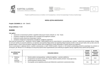 MODUŁ JĘZYKA ANGIESLKIEGO Projekt: CZŁOWIEK (JA - MY - ŚWIAT) Grupa wiekowa: 3-latki SŁOWNIK Cele ogólne: zapoznanie ze słownictwem polskim i angielskim dotyczącym tematu Człowiek: Ja – My – Świat; rozwijanie umiejętności dostrzegania różnic pomiędzy poszczególnymi osobami; budowanie zasobu słownictwa związanego z rodziną; rozwijanie umiejętności artykułowania samogłosek i spółgłosek angielskich. Bank słów jest zestawem kart - kwadratów, których wygląd i układ podobny jest do znanej dzieciom i nauczycielom gry „memory”, jednak karty pozostają odkryte. Dostęp do nich jest możliwy na poziomie platformy, po wybraniu wersji polskiej (flaga polska) lub angielskiej (flaga brytyjska). Grafiki w obu wersjach banku słów są takie same dla danego projektu, a ikony różnią się jedynie nagraniami słówek, które przygotowane zostały odpowiednio w języku polskim lub angielskim. Ikony są wzorowane w głównej mierze na grafice zastosowanej w części CASUM projektu. Zawarte w nich obrazki przedstawiają elementy pojawiające się zarówno w animacjach, jak i filmach A i B. Po kliknięciu na daną kartę słychać słowo wypowiedziane przez lektorkę po angielsku (wersja angielska) lub po polsku (wersja polska). CEL OPERACYJNY DZIECKO: Wybierze wersję językową naciskając na DZIAŁANIA DZIECKA Dziecko wybiera wersję językową – polską lub angielską – z poziomu platformy. Po pojawieniu się zestawu sześciu ikon, dziecko wybiera dowolny element i słyszy jego nazwę. Dziecko powtarza usłyszane słowo. W przypadku wersji angielskiej zalecane jest kilkukrotne wysłuchanie i powtarzanie słowa. SŁOWO POLSKIE – WERSJA POLSKA SŁOWO ANGIELSKIE – WERSJA ANGIELSKA mama mum tata dad odpowiednią ikonę. Naciśnie wybraną ikonę w zestawie 6 grafik. Odsłucha nazwy poszczególny ch elementów. Powtórzy nazwy polskie lub angielskie. Jeśli na podstawie materiału graficznego dziecko nie jest w stanie zrozumieć znaczenia angielskiego słowa, może cofnąć się do poziomu platformy i wybrać polską wersję językową, co ułatwi pełne zrozumienie znaczenia ikony. rodzina family babcia grandma dziadek grandpa siostra sister brat brother dziecko child włosy hair oczy eyes nos nose uszy ears ramiona arms ręce hands nogi legs WSKAZÓWKI DLA NAUCZYCIELA 1. Należy stworzyć dzieciom warunki, aby przysłuchiwały się nagraniom słów, zanim zaczną je powtarzać. 2. Dobrze jest zachęcić dzieci, aby angielskie słowa powtarzały grupowo oraz indywidualnie. 3. W przypadku, gdy zrozumienie znaczenia słowa angielskiego jest zbyt trudne dla dziecka, możliwe jest przejście do polskiej wersji słownika. Szczególnie w pierwszych fazach projektu nauczyciel powinien pomóc dzieciom cofnąć się do poziomu platformy i otworzyć bank polskich słów. 4. Jeśli zrozumienie wymowy poszczególnych słów w wersji angielskiej stwarza problemy dzieciom lub nauczycielowi, zalecane jest skorzystanie z dobrych słowników internetowych wszystkich głównych wydawców, w celu sprawdzenia znaczenia słowa lub jego wymowy. 5. Słowa i grafiki zamieszczone w słownikach pochodzą głównie z animacji, a zatem ich powtarzanie i osadzenie w kontekście przyrodniczym prowadzi do bardziej efektywnego zapamiętywania znaczeń. Dzieci mogą korzystać z banku słów zarówno w końcu 1 tygodnia projektu, jak i w drugim, trzecim i czwartym tygodniu. Częstotliwość powtórzeń sprzyja przyswajaniu języka obcego. GRA DRAG AND DROP Cele ogólne: rozwijanie zasobu słownictwa związanego z opisem wyglądu człowieka; rozwijanie umiejętności dostrzegania różnic pomiędzy cechami poszczególnych osób; rozwijanie umiejętności uzupełniania obrazu; rozwijanie umiejętności artykułowania głosek angielskich; Format gry Drag and drop (pol.: przeciągnij i upuść) Opis grafiki Grafika przedstawia niepełny rysunek popiersia człowieka. Po obu stronach obrazka umieszczone są różne elementy twarzy i głowy (włosy, brwi, oczy, nos usta, uszy). Zadanie dziecka polega na przeciągnięciu poszczególnych fragmentów w odpowiednie miejsca na rysunku. Dziecko tworzy własną wersję obrazka dopasowując części twarzy zgodnie z dokonanym wyborem. Każdy element z boku obrazka jest klikalny – po naciśnięciu słychać jego angielską nazwę. Przesunięcie któregokolwiek fragmentu rozpoczyna grę. Jeśli dana część twarzy nie zostanie umieszczona w poprawnym miejscu, słychać nagranie „Try again” (pol.: spróbuj ponownie). Po poprawnym przeciągnięciu elementu w odpowiednie miejsce dziecko słyszy nagranie „Correct!” (pol.: dobrze, prawidłowo). Gdy rysunek zostanie ukończony, uruchamia się nagranie „Congratulations” (pol.: gratulacje) oraz słychać oklaski. Dzieci mają możliwość ponownego przejścia gry z innym doborem elementów po naciśnięciu na ikonę w prawym dolnym rogu ekranu. CEL OPERACYJNY ZADANIA DO WYKONANIA SŁOWA ANGIELSKIE TŁUMACZENIE NA DZIECKO: WYKORZYSTANE W JĘZYK POLSKI GRZE Wybierze naciśnięcie ikony przedstawiającej dany fragment twarzy lub głowy; blue eyes oczy niebieskie dowolną ikonę powtórzenie usłyszanego słowa; przedstawiającą przesunięcie wybranej ikony na rysunek twarzy w środkowej części ekranu; brown eyes oczy brązowe element twarzy. w przypadku popełnienia błędu, przesunięcie ikony w odpowiednie green eyes oczy zielone Wysłucha i miejsce; powtórzy nazwę wybór kolejnej ikony; eyebrows brwi danego powtórzenie usłyszanego słowa; elementu. mouth usta umieszczenie wszystkich ikon przedstawiających elementy twarzy i głowy Przesunie w odpowiednich miejscach; ears uszy wybraną ikonę ponowne rozpoczęcie gry. w odpowiednie nose nos miejsce w centrum ekranu. curly hair włosy kręcone Dokona wyboru straight hair włosy proste kolejnych ikon. Uzupełni fair hair włosy jasne wszystkie dark hair włosy ciemne elementy twarzy. short hair włosy krótkie long hair WSKAZÓWKI DLA NAUCZYCIELA w