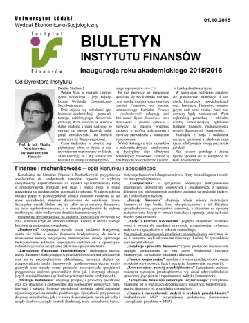 Uniwersytet Łódzki Wydział Ekonomiczno-Socjologiczny 01.10.2015 BIULETYN INSTYTUTU FINANSÓW Inauguracja roku akademickiego 2015/2016 Od Dyrektora Instytutu Prof. dr hab. Monika Marcinkowska, Dyrektor Instytutu Finansów Drodzy Studenci! Witam Was w murach Uniwersytetu Łódzkiego – jego największego Wydziału: EkonomicznoSocjologicznego. Dziś stajecie się członkami społeczności akademickiej – grona elitarnego, nobilitującego. Serdecznie gratuluję Wam sukcesu w walce o status studenta i mam nadzieję, że otwiera on pasmo licznych osiągnięć zawodowych... do których postaramy się Was przygotować. Czasy studenckie to zwykle najpiękniejszy okres w życiu, z rozrzewnieniem wspominany po latach. Mam nadzieję, że i Wy uznacie ten rozdział za udany i z dumą będzie- cie go wpisywać w swe CV. Po raz pierwszy na inauguracji spotykają się trzy kierunki, nad którymi opiekę merytoryczną sprawuje Instytut Finansów; do naszego sztandarowego kierunku Finanse i rachunkowość dołączają dziś dwa nowe: Rynek finansowy oraz Bankowość i finanse cyfrowe – pierwszy na naszym wydziale kierunek o profilu praktycznym i pierwszy prowadzony z partnerami biznesowymi. Wybór każdego z tych kierunków to znakomita decyzja – studiowanie tej dyscypliny daje olbrzymie perspektywy zawodowe. Finanse są dziś bowiem wszechobecne i ważne w każdej dziedzinie życia. W niniejszym biuletynie znajdziecie podstawowe informacje o studiach, kierunkach i specjalnościach oraz Instytucie Finansów, sprawującym nad nimi opiekę. Nasi pracownicy będą przekazywać Wam najbardziej potrzebną i aktualną wiedzę umożliwiającą zgłębianie tajników finansów, rachunkowości, rynków finansowych i bankowości. Studiujcie z pasją i oddaniem, czerpcie garściami z akademickiego życia, zdobywajcie swoją przyszłość już dziś! Raz jeszcze gratuluję i życzę, byśmy spotkali się w komplecie na Gali Absolwentów! Finanse i rachunkowość – opis kierunku i specjalności Kształcenie na kierunku Finanse i Rachunkowość przygotowuje absolwentów do konkretnych zawodów, zgodnie z wybraną specjalnością. Zapotrzebowanie na wysoko wykwalifikowaną kadrę o proponowanych profilach jest duże i będzie rosło w miarę umacniania się mechanizmów gospodarki rynkowej. W odpowiedzi na rosnący popyt w poszczególnych sferach finansów tworzone są też nowe specjalności, starannie dopasowane do oczekiwań rynku. Szczególny nacisk kładzie się nie tylko na przedmioty finansowe, ale także ogólnoekonomiczne, a w ramach przedmiotów do wyboru możliwe jest także studiowanie dziedzin humanistycznych. Przedmioty specjalnościowe na studiach licencjackich zaczynają się od 4. semestru (czyli od semestru letniego II roku); w ofercie naszego Instytutu są następujące specjalności: „Bankowość” obejmująca metody oceny zdolności kredytowej, oparte nie tylko o analizę finansową kredytobiorcy, ale także o nowoczesne metody statystyczno-matematyczne, zasady sprawnego funkcjonowania wkładów depozytowo-kredytowych i operacyjnorachunkowych oraz zarządzanie aktywami i pasywami banku. „Zarządzanie Finansami Przedsiębiorstw” obejmująca mechanizmy finansowe funkcjonujące w przedsiębiorstwach małych i dużych oraz na te przedsiębiorstwa oddziałujące, narzędzia służące do przeprowadzania analiz finansowych i podejmowania decyzji strategicznych oraz metody oceny projektów rozwojowych; specjalność przygotowuje zarówno pracowników firm, jak i instytucji obsługujących przedsiębiorstwa (np. bankowych inspektorów kredytowych). „Strategie Podatkowe” obejmują przepisy i procedury podatkowe oraz ich znaczenie i zastosowanie dla gospodarstw domowych, firm, instytucji i państwa. Program specjalności obejmuje całość zagadnień egzaminacyjnych na doradcę podatkowego. Specjalność przygotowuje do pracy samodzielnej, jak i w różnych instytucjach, takich jak: izby i urzędy skarbowe, urzędy kontroli skarbowej, biura rachunkowe, banki, instytucje finansowe i ubezpieczeniowe, firmy konsultingowe i wszelkie inne przedsiębiorstwa. „Ubezpieczenia” to specjalność obejmująca funkcjonowanie ubezpieczeń społecznych, osobowych i majątkowych, z uwzględnieniem ich wielostronnych aspektów zarówno na poziomie makro-, jak i mikroekonomicznym. „Decyzje finansowe” obejmują relacje między instytucjami finansowymi (np. banki, firmy ubezpieczeniowe) a ich klientami (przedsiębiorstwa, gospodarstwa domowe), z akcentem na sposoby podejmowania decyzji w ramach transakcji i operacji, jakie zachodzą między tymi stronami. „Audyt i kontrola wewnętrzna” pogłębia znajomość rachunkowości i wybranych zagadnień prawnych, przygotowując zwłaszcza audytorów i specjalistów w zakresie controllingu. Na studiach magisterskich przedmioty specjalnościowe zaczynają się od 3. semestru (czyli od semestru zimowego II roku). W tym zakresie nasz Instytut oferuje: „Instytucje i produkty finansowe” (rynek produktów finansowych, strategie konkurowania na nim, ocena działalności instytucji finansowych, zarządzanie relacjami z klientami), „Finanse korporacyjne” (analiza i wycena przedsiębiorstw, ocena projektów rozwojowych, fuzje i przejęcia, finansowanie korporacji), „Zrównoważony rozwój przedsiębiorstwa” (zarządzanie zrównoważonym rozwojem przedsiębiorstwa wg zasad odpowiedzialności społecznej, jego pomiar i raportowanie, polityka konsumencka), „Zarządzanie finansami samorządu terytorialnego” (zarządzanie finansami jst w warunkach decentralizacji, inwestycje, budżetowanie i analiza finansowa jst, gospodarka komunalna), „Finanse i rachunkowość małych i średnich przedsiębiorstw” (rachunkowość MSP, optymalizacja podatkowa, finansowanie i zarządzanie projektem w MSP). Bankowość i finanse cyfrowe – opis kierunku i specjalności Kierunek Bankowość i Finanse Cyfrowe powstał w odpowiedzi na zgłaszane przez pracodawców zapot