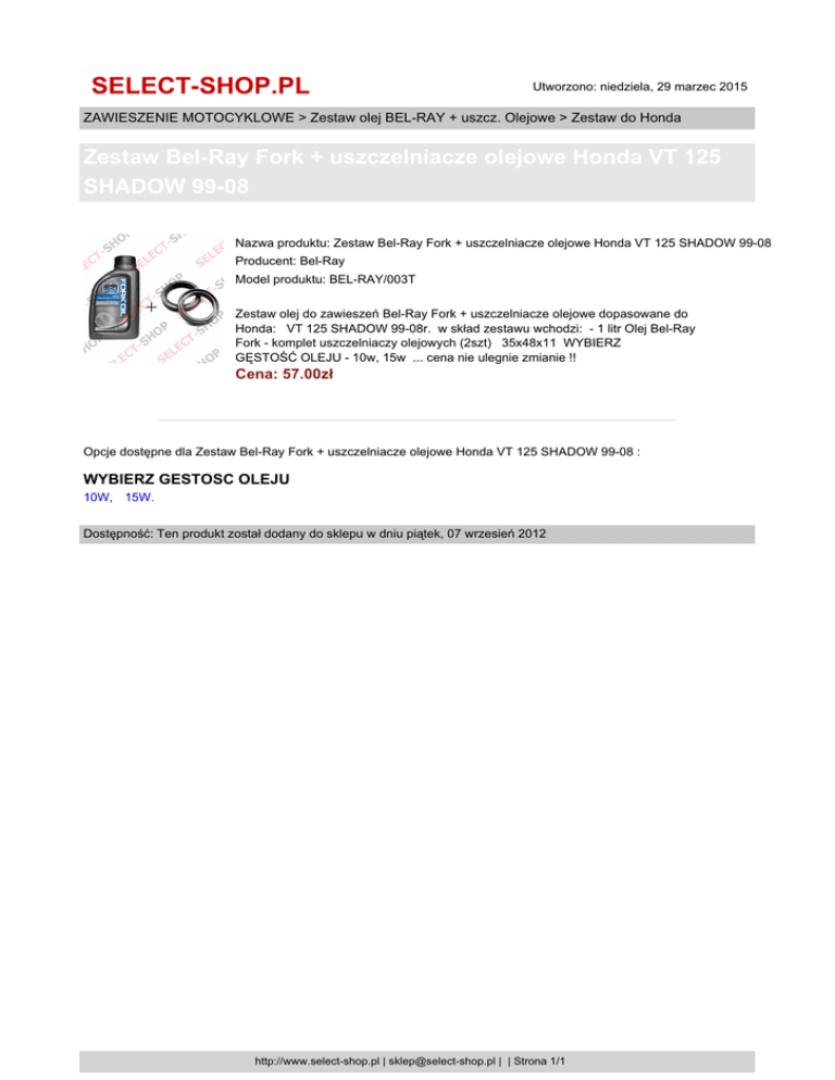 SELECT-SHOP.PL Utworzono: niedziela, 29 marzec 2015 ZAWIESZENIE MOTOCYKLOWE > Zestaw olej BEL-RAY + uszcz. Olejowe > Zestaw do Honda Zestaw Bel-Ray Fork + uszczelniacze olejowe Honda VT 125 SHADOW 99-08 Nazwa produktu: Zestaw Bel-Ray Fork + uszczelniacze olejowe Honda VT 125 SHADOW 99-08 Producent: Bel-Ray Model produktu: BEL-RAY/003T Zestaw olej do zawieszeń Bel-Ray Fork + uszczelniacze olejowe dopasowane do Honda: VT 125 SHADOW 99-08r. w skład zestawu wchodzi: - 1 litr Olej Bel-Ray Fork - komplet uszczelniaczy olejowych (2szt) 35x48x11 WYBIERZ GĘSTOŚĆ OLEJU - 10w, 15w ... cena nie ulegnie zmianie !! Cena: 57.00zł Opcje dostępne dla Zestaw Bel-Ray Fork + uszczelniacze olejowe Honda VT 125 SHADOW 99-08 : WYBIERZ GESTOSC OLEJU 10W, 15W. Dostępność: Ten produkt został dodany do sklepu w dniu piątek, 07 wrzesień 2012 http://www.select-shop.pl | [email protected] | | Strona 1/1