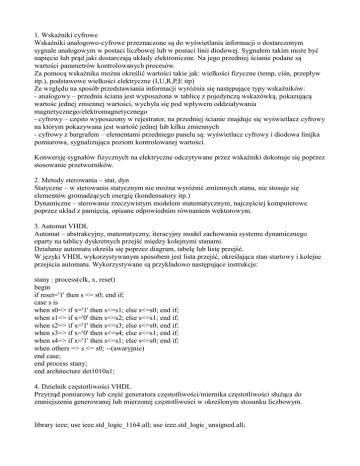 1. Wskaźniki cyfrowe Wskaźniki analogowo-cyfrowe przeznaczone są do wyświetlania informacji o dostarczonym sygnale analogowym w postaci liczbowej lub w postaci linii diodowej. Sygnałem takim może być napięcie lub prąd jaki dostarczają układy elektroniczne. Na jego przedniej ścianie podane są wartości parametrów kontrolowanych procesów. Za pomocą wskaźnika można określić wartości takie jak: wielkości fizyczne (temp, ciśn, przepływ itp.), podstawowe wielkości elektryczne (I,U,R,P,E itp) Ze względu na sposób przedstawiania informacji wyróżnia się następujące typy wskaźników: - analogowy – przednia ściana jest wyposażona w tablicę z pojedynczą wskazówką, pokazującą wartośc jednej zmiennej wartości, wychyla się pod wpływem oddziaływania magnetycznego/elektromagnetycznego - cyfrowy – często wyposazony w rejestrator, na przedniej ścianie znajduje się wyświetlacz cyfrowy na którym pokazywana jest wartość jednej lub kilku zmiennych - cyfrowy z bargrafem – elementami przedniego panelu są: wyświetlacz cyfrowy i diodowa linijka pomiarowa, sygnalizująca poziom kontrolowanej wartości. Konwersję sygnałów fizycznych na elektryczne odczytywane przez wskaźniki dokonuje się poprzez stosowanie przetworników. 2. Metody sterowania – stat, dyn Statyczne – w sterowaniu statycznym nie można wyróżnić zmiennych stanu, nie stosuje się elementów gromadzących energię (kondensatory itp.) Dynamiczne – sterowanie rzeczywistym modelem matematycznym, najczęściej komputerowe poprzez układ z pamięcią, opisane odpowiednim równaniem wektorowym. 3. Automat VHDL Automat – abstrakcyjny, matematyczny, iteracyjny model zachowania systemu dynamicznego oparty na tablicy dyskretnych przejść między kolejnymi stanami. Działanie automatu określa się poprzez diagram, tabelę lub listę przejść. W języki VHDL wykorzystywanym sposobem jest lista przejść, określająca stan startowy i kolejne przejścia automatu. Wykorzystywane są przykładowo następujące instrukcje: stany : process(clk, x, reset) begin if reset='1' then s <= s0; end if; case s is when s0=> if x='1' then s<=s1; else s<=s0; end if; when s1=> if x='0' then s<=s2; else s<=s1; end if; when s2=> if x='1' then s<=s3; else s<=s0; end if; when s3=> if x='0' then s<=s4; else s<=s1; end if; when s4=> if x='1' then s<=s1; else s<=s0; end if; when others => s <= s0; --(awaryjnie) end case; end process stany; end architecture det1010a1; 4. Dzielnik częstotliwości VHDL Przyrząd pomiarowy lub część generatora częstotliwości/miernika częstotliwości służąca do zmniejszenia generowanej lub mierzonej częstotliwości w określonym stosunku liczbowym. library ieee; use ieee.std_logic_1164.all; use ieee.std_logic_unsigned.all; entity clock_divider is port ( CLK_REF : in std_logic; CLK_OUT : out std_logic ); end entity; architecture RTL of clock_divider is begin process(CLK_REF) variable i : integer range 0 to 999999; begin if rising_edge(CLK_REF) then if i = 0 then CLK_OUT <= ‘1’; i := 999999; else CLK_OUT <= ‘0’; i := i – 1; end if; end if; end process; end architecture;