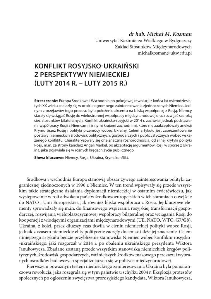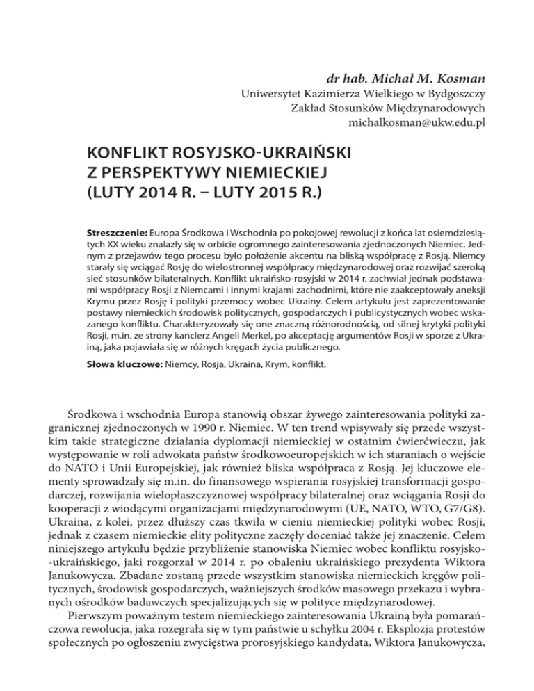 dr hab. Michał M. Kosman Uniwersytet Kazimierza Wielkiego w Bydgoszczy Zakład Stosunków Międzynarodowych [email protected] KONFLIKT ROSYJSKO-UKRAIŃSKI Z PERSPEKTYWY NIEMIECKIEJ (LUTY 2014 R. – LUTY 2015 R.) Streszczenie: Europa Środkowa i Wschodnia po pokojowej rewolucji z końca lat osiemdziesiątych XX wieku znalazły się w orbicie ogromnego zainteresowania zjednoczonych Niemiec. Jednym z przejawów tego procesu było położenie akcentu na bliską współpracę z Rosją. Niemcy starały się wciągać Rosję do wielostronnej współpracy międzynarodowej oraz rozwijać szeroką sieć stosunków bilateralnych. Konflikt ukraińsko-rosyjski w 2014 r. zachwiał jednak podstawami współpracy Rosji z Niemcami i innymi krajami zachodnimi, które nie zaakceptowały aneksji Krymu przez Rosję i polityki przemocy wobec Ukrainy. Celem artykułu jest zaprezentowanie postawy niemieckich środowisk politycznych, gospodarczych i publicystycznych wobec wskazanego konfliktu. Charakteryzowały się one znaczną różnorodnością, od silnej krytyki polityki Rosji, m.in. ze strony kanclerz Angeli Merkel, po akceptację argumentów Rosji w sporze z Ukrainą, jaka pojawiała się w różnych kręgach życia publicznego. Słowa kluczowe: Niemcy, Rosja, Ukraina, Krym, konflikt. Środkowa i wschodnia Europa stanowią obszar żywego zainteresowania polityki zagranicznej zjednoczonych w 1990 r. Niemiec. W ten trend wpisywały się przede wszystkim takie strategiczne działania dyplomacji niemieckiej w ostatnim ćwierćwieczu, jak występowanie w roli adwokata państw środkowoeuropejskich w ich staraniach o wejście do NATO i Unii Europejskiej, jak również bliska współpraca z Rosją. Jej kluczowe elementy sprowadzały się m.in. do finansowego wspierania rosyjskiej transformacji gospodarczej, rozwijania wielopłaszczyznowej współpracy bilateralnej oraz wciągania Rosji do kooperacji z wiodącymi organizacjami międzynarodowymi (UE, NATO, WTO, G7/G8). Ukraina, z kolei, przez dłuższy czas tkwiła w cieniu niemieckiej polityki wobec Rosji, jednak z czasem niemieckie elity polityczne zaczęły doceniać także jej znaczenie. Celem niniejszego artykułu będzie przybliżenie stanowiska Niemiec wobec konfliktu rosyjsko-ukraińskiego, jaki rozgorzał w 2014 r. po obaleniu ukraińskiego prezydenta Wiktora Janukowycza. Zbadane zostaną przede wszystkim stanowiska niemieckich kręgów politycznych, środowisk gospodarczych, ważniejszych środków masowego przekazu i wybranych ośrodków badawczych specjalizujących się w polityce międzynarodowej. Pierwszym poważnym testem niemieckiego zainteresowania Ukrainą była pomarańczowa rewolucja, jaka rozegrała się w tym państwie u schyłku 2004 r. Eksplozja protestów społecznych po ogłoszeniu zwycięstwa prorosyjskiego kandydata, Wiktora Janukowycza, 16 Rocznik Bezpieczeństwa Międzynarodowego 2015, vol. 9, nr 1 nad Wiktorem Juszczenką w wyniku – jak dowodzili protestujący – fałszerstw wyborczych, wywarła duże wrażenie w RFN. Wiodące niemieckie partie polityczne zgadzały się z głosem ukraińskiej ulicy, że najlepszym rozwiązaniem w tej sytuacji będzie powtórka wyborów. Ówczesny szef niemieckiego rządu, Gerhard Schröder, początkowo reagował dość powściągliwie na takie postulaty, jednak wkrótce zaczął otwarcie głosić pogląd, że państwa trzecie, w tym Rosja, powinny powstrzymać się od ingerencji w ukraińskie wybory. Prowadził jednocześnie żywą „dyplomację telefoniczną” z prezydentem Władimirem Putinem. Także Angela Merkel, jako przewodnicząca największej wówczas partii opozycyjnej, CDU, opowiadała się za powtórką ukraińskiej elekcji, podobnie jak czołowi reprezentanci FDP czy koalicyjnych Zielonych. Kulisy niemieckiego zainteresowania rozwiązaniem ukraińskiego kryzysu sprzed dekady przybliżył znawca problematyki rosyjskiej Heinz Timmermann. Jak podawał niemiecki badacz, ówczesny minister spraw zagranicznych, Joschka Fischer, miał wówczas zachęcać Wysokiego Przedstawiciela UE do Spraw Wspólnej Polityki Zagranicznej i Bezpieczeństwa, Javiera Solanę, do aktywniejszego zaangażowania się w rozwiązanie sporu i wsparcia działań mediacyjnych prezydenta Aleksandra Kwaśniewskiego. Natomiast rola Gerharda Schrödera miała sprowadzać się do wykorzystania swych dobrych kontaktów z Władimirem Putinem, aby przekonać go do scenariusza powtórki ukraińskich wyborów (Timmermann, 2007, s. 108). W konsekwencji powtórnej elekcji fotel prezydenta objął cieszący się ogromną popularnością były premier Wiktor Juszczenko. Pozytywnie postawę Schrödera i jego kooperację z polskimi władzami podczas pomarańczowej rewolucji ocenił także inny niemiecki badacz (uchodzący za bardzo prorosyjskiego), Alexander Rahr, kanclerz miał bowiem wziąć na swoje barki przekonanie Władimira Putina do kompromisu, zaś Aleksander Kwaśniewski skłonił strony ukraińskiego sporu do rozmów. Za swą prorosyjską postawę Schröder – zdaniem wspomnianego autora – zapłacił częściową izolacją w Niemczech i za granicą, jednak jego zaangażowanie przyniosło pozytywny efekt, ułatwiając rozwiązanie kryzysu (Rahr, 2005, s. 94). Następstwem pomarańczowej rewolucji stał się wzrost zainteresowania Ukrainą nad Łabą i Renem (szerzej zob. Koszel, 2008), tamtejsze elity polityczne dotąd zdawały się bowiem ją nieco marginalizować, a stosunki z Kijowem tkwiły w cieniu relacji z Moskwą. Ożywieniu uległa kwestia przyszłości stosunków Ukrainy z Unią Europejską. Na fali zwycięstwa Juszczenki, nastroje w Niemczech charakteryzowały się znacznym poziomem przychylności wobec Kijowa, aczkolwiek ewentualność pełnego członkostwa Ukrainy w UE nie cieszyła się w RFN wielkim powodzeniem. I tak np. socjaldemokrata, Gernot Erler, opowiadał się za obecnością Ukrainy w mechanizmach Europejskiej Polityki Sąsiedztwa UE, podobnie jak chadecki ekspert do spraw polityki międzynarodo