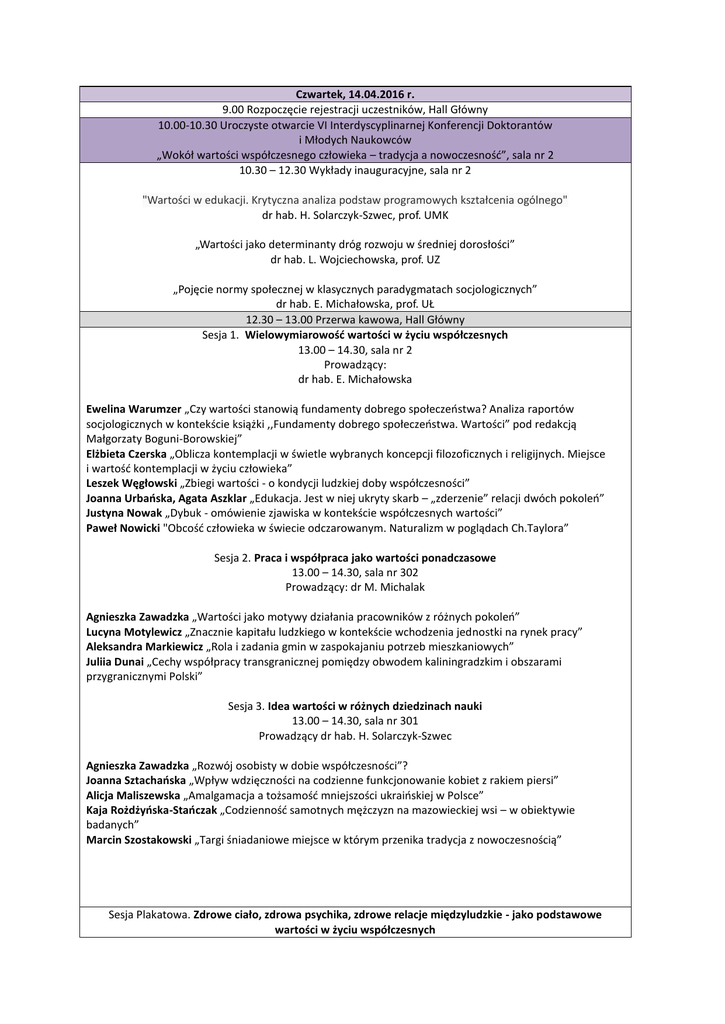 Czwartek, 14.04.2016 r. 9.00 Rozpoczęcie rejestracji uczestników, Hall Główny 10.00-10.30 Uroczyste otwarcie VI Interdyscyplinarnej Konferencji Doktorantów i Młodych Naukowców „Wokół wartości współczesnego człowieka – tradycja a nowoczesność”, sala nr 2 10.30 – 12.30 Wykłady inauguracyjne, sala nr 2 "Wartości w edukacji. Krytyczna analiza podstaw programowych kształcenia ogólnego" dr hab. H. Solarczyk-Szwec, prof. UMK „Wartości jako determinanty dróg rozwoju w średniej dorosłości” dr hab. L. Wojciechowska, prof. UZ „Pojęcie normy społecznej w klasycznych paradygmatach socjologicznych” dr hab. E. Michałowska, prof. UŁ 12.30 – 13.00 Przerwa kawowa, Hall Główny Sesja 1. Wielowymiarowość wartości w życiu współczesnych 13.00 – 14.30, sala nr 2 Prowadzący: dr hab. E. Michałowska Ewelina Warumzer „Czy wartości stanowią fundamenty dobrego społeczeństwa? Analiza raportów socjologicznych w kontekście książki ,,Fundamenty dobrego społeczeństwa. Wartości” pod redakcją Małgorzaty Boguni-Borowskiej” Elżbieta Czerska „Oblicza kontemplacji w świetle wybranych koncepcji filozoficznych i religijnych. Miejsce i wartość kontemplacji w życiu człowieka” Leszek Węgłowski „Zbiegi wartości - o kondycji ludzkiej doby współczesności” Joanna Urbańska, Agata Aszklar „Edukacja. Jest w niej ukryty skarb – „zderzenie” relacji dwóch pokoleń” Justyna Nowak „Dybuk - omówienie zjawiska w kontekście współczesnych wartości” Paweł Nowicki "Obcość człowieka w świecie odczarowanym. Naturalizm w poglądach Ch.Taylora” Sesja 2. Praca i współpraca jako wartości ponadczasowe 13.00 – 14.30, sala nr 302 Prowadzący: dr M. Michalak Agnieszka Zawadzka „Wartości jako motywy działania pracowników z różnych pokoleń” Lucyna Motylewicz „Znacznie kapitału ludzkiego w kontekście wchodzenia jednostki na rynek pracy” Aleksandra Markiewicz „Rola i zadania gmin w zaspokajaniu potrzeb mieszkaniowych” Juliia Dunai „Cechy współpracy transgranicznej pomiędzy obwodem kaliningradzkim i obszarami przygranicznymi Polski” Sesja 3. Idea wartości w różnych dziedzinach nauki 13.00 – 14.30, sala nr 301 Prowadzący dr hab. H. Solarczyk-Szwec Agnieszka Zawadzka „Rozwój osobisty w dobie współczesności”? Joanna Sztachańska „Wpływ wdzięczności na codzienne funkcjonowanie kobiet z rakiem piersi” Alicja Maliszewska „Amalgamacja a tożsamość mniejszości ukraińskiej w Polsce” Kaja Rożdżyńska-Stańczak „Codzienność samotnych mężczyzn na mazowieckiej wsi – w obiektywie badanych” Marcin Szostakowski „Targi śniadaniowe miejsce w którym przenika tradycja z nowoczesnością” Sesja Plakatowa. Zdrowe ciało, zdrowa psychika, zdrowe relacje międzyludzkie - jako podstawowe wartości w życiu współczesnych Prowadzenie: dr hab. L. Wojciechowska 14.30 – 15.30 Hall Główny Monika Deja, Martyna Janicka, Maria Sadowska, Aleksandra Wolska „Poczucie własnej skuteczności a style radzenia sobie ze stresem u studentów różnych kierunków studiów” Karolina Szatkowska „Różnicująca rola czynników społeczno-demograficznych dla poczucia koherencji, więzi z Bogiem i jakości życia osób chorych onkologicznie” Marta Monika Zawichrowska „Stymulacja poprzez zmysły w chorobie Parkinsona” Karolina Żbikowska, Karolina Stenka, Bożena Kawiecka-Dziembowska „Atrakcyjność fizyczna jako istotna wartość wśród pacjentów onkologicznych” Karolina Żbikowska, Paweł Izdebski „Represyjny styl radzenia sobie – czy osoby mające ten styl częściej chorują na raka? Przegląd badań” Malwina Tudorowska, Anita Markowska, Marcin Ziółkowski, Sławomir Tecław, „Różnice pokoleniowe w użytkowaniu facebooka i innych portali społecznościowych” Ewa Stępka-Tykwińska, Leszek Stępka „Poczucie bezpieczeństwa a dostęp do broni palnej wśród dorosłych Polaków” Natalia Pilarska, Hanna Liberska „Wartości młodych Katolików” Kinga Mickiewicz, Karolina Głogowska, Arleta Babska, Agnieszka Gunter-Jabłońska „Wypalenie zawodowe, wartości i funkcjonowanie społeczne asystentów rodziny” Dagmara Jankowska-Karpa „Centrum Edukacji Bezpieczeństwa Ruchu Drogowego (CEBR) – innowacyjne narzędzie edukacji uczestników ruchu” Martyna Janicka, Agnieszka Kruczek „Mieć czy być? Postawy egzystencjalne młodych dorosłych a ich satysfakcja z życia” Alicja Szmaus-Jackowska „Poziom umiejętności społecznych, satysfakcja z życia i aktywność fizyczna a agresja u młodych ludzi” Dorota Suwalska-Barancewicz „Znaczenie posiadania dzieci dla wybranych aspektów funkcjonowania jednostki w świetle niektórych wyników badań własnych” Joanna Jankowiak „Preferowane wartości a wykonywany zawód” Joanna Starostecka, Kristina Hryncewicz "Poczucie umiejscowienia kontroli u kobiet pracujących w korporacji, a nasilenie konfliktu rodzina - praca, praca - rodzina: prezentacja wyników badań własnych" 15.30 – 16.30 Obiad, sale 405, 406 Sesja 4. Wartości dzieci i młodzieży we współczesnym świecie 16.30 – 18.00, sala nr 2 Prowadzący: prof. dr hab. J. Trempała Anna Szymanik-Kostrzewska „Dziecko najważniejsze na świecie? O wartości dziecka w czasach współczesnych” Małgorzata Lewandowska „Strategie wywierania wpływu społecznego przez dzieci w wieku przedszkolnym i wczesnoszkolnym” Katarzyna Kowalik-Paluch „Tworzenie i rozumienie metafor jako przejaw poznawczej zdolności komunikacyjnej małego dziecka” Joanna Poziemska „Motywacja do nauki młodzieży szkół ponadgimnazjalnych” Agnieszka Kruczek „Czy niskie poczucie własnej wartości prowadzi u młodzieży do agresji? Poczucie własnej wartości a styl ekspresji gniewu” Sesja 5. Wartości dorastających i dorosłych we współczesnym świecie 16.30 – 18.00, sala nr 302 Prowadzący: prof. dr hab. R. Ossowski Paulina Peret-Drążewska „Ustalenie systemu wart
