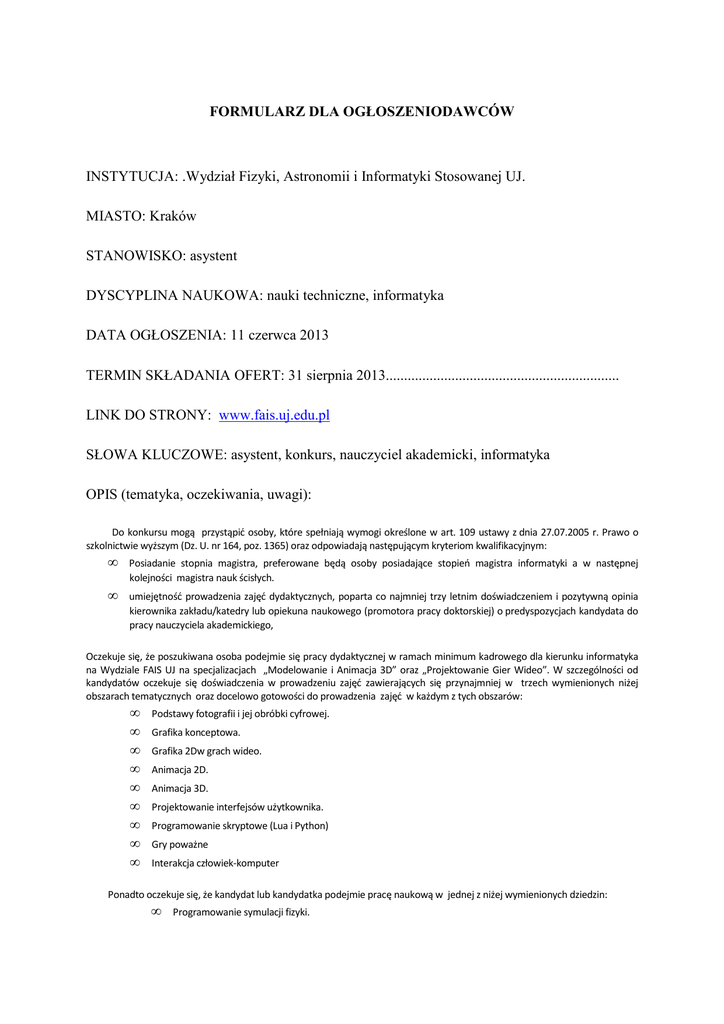 FORMULARZ DLA OGŁOSZENIODAWCÓW INSTYTUCJA: .Wydział Fizyki, Astronomii i Informatyki Stosowanej UJ. MIASTO: Kraków STANOWISKO: asystent DYSCYPLINA NAUKOWA: nauki techniczne, informatyka DATA OGŁOSZENIA: 11 czerwca 2013 TERMIN SKŁADANIA OFERT: 31 sierpnia 2013................................................................ LINK DO STRONY: www.fais.uj.edu.pl SŁOWA KLUCZOWE: asystent, konkurs, nauczyciel akademicki, informatyka OPIS (tematyka, oczekiwania, uwagi): Do konkursu mogą przystąpić osoby, które spełniają wymogi określone w art. 109 ustawy z dnia 27.07.2005 r. Prawo o szkolnictwie wyższym (Dz. U. nr 164, poz. 1365) oraz odpowiadają następującym kryteriom kwalifikacyjnym: • • Posiadanie stopnia magistra, preferowane będą osoby posiadające stopień magistra informatyki a w następnej kolejności magistra nauk ścisłych. umiejętność prowadzenia zajęć dydaktycznych, poparta co najmniej trzy letnim doświadczeniem i pozytywną opinia kierownika zakładu/katedry lub opiekuna naukowego (promotora pracy doktorskiej) o predyspozycjach kandydata do pracy nauczyciela akademickiego, Oczekuje się, że poszukiwana osoba podejmie się pracy dydaktycznej w ramach minimum kadrowego dla kierunku informatyka na Wydziale FAIS UJ na specjalizacjach „Modelowanie i Animacja 3D” oraz „Projektowanie Gier Wideo”. W szczególności od kandydatów oczekuje się doświadczenia w prowadzeniu zajęć zawierających się przynajmniej w trzech wymienionych niżej obszarach tematycznych oraz docelowo gotowości do prowadzenia zajęć w każdym z tych obszarów: • • • • • • • • • Podstawy fotografii i jej obróbki cyfrowej. Grafika konceptowa. Grafika 2Dw grach wideo. Animacja 2D. Animacja 3D. Projektowanie interfejsów użytkownika. Programowanie skryptowe (Lua i Python) Gry poważne Interakcja człowiek-komputer Ponadto oczekuje się, że kandydat lub kandydatka podejmie pracę naukową w jednej z niżej wymienionych dziedzin: • Programowanie symulacji fizyki. • • • • Interakcja człowiek-komputer. Programowanie Procesorów Graficznych. Gry poważne. Badanie struktur gier komputerowych. Mile widziane jest doświadczenie w pracy naukowej poparte publikacjami i/lub wystąpieniami na konferencjach naukowych. Zastrzega się, że preferowana będzie osoba, dla której Uniwersytet Jagielloński będzie jedynym miejscem pracy. Kandydaci przystępujący do konkursu winni złożyć w Dziekanacie Wydziału Fizyki, Astronomii i Informatyki Stosowanej UJ , 30-059 Kraków, ul. Reymonta 4, pokój 016a następujące dokumenty: 1. 2. 3. 4. 5. 6. 7. podanie/list motywacyjny, 8. oświadczenie o znajomości i akceptacji zasad dotyczących własności intelektualnej i ochrony prawnej dóbr intelektualnych. Curriculum Vitae, wykaz publikacji, kwestionariusz osobowy, oświadczenie stwierdzające, że UJ będzie podstawowym miejscem pracy w przypadku wygrania konkursu, oświadczenie w trybie art. 109 ust. 1 ustawy Prawo o szkolnictwie wyższym. oświadczenie o wyrażeniu zgody na zaliczenie do minimum kadrowego dla potrzeb ustalenia uprawnień do nadawania stopnia doktora i doktora habilitowanego i/lub dla potrzeb utworzenia/prowadzenia kierunku studiów wyższych, w przypadku wygrania konkursu. Termin składania zgłoszeń upływa z dniem 31 sierpnia 2013 r. Rozstrzygnięcie konkursu nastąpi do dnia 26 września 2013 r. Na podaniu należy dopisać: „Wyrażam zgodę na przetwarzanie moich danych osobowych zawartych w mojej ofercie pracy dla potrzeb niezbędnych do realizacji procesu rekrutacji” ( zgodnie z ustawą z dnia 29 sierpnia 1997 roku o ochronie danych osobowych, Dz. U. Nr 133, poz. 883 z późniejszymi zmianami).