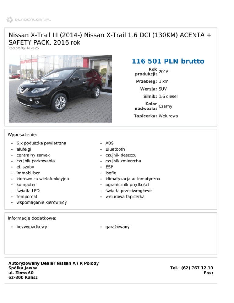 Nissan X-Trail III (2014-) Nissan X-Trail 1.6 DCI (130KM) ACENTA + SAFETY PACK, 2016 rok Kod oferty: NSK-25 116 501 PLN brutto Rok 2016 produkcji: Przebieg: 1 km Wersja: SUV Silnik: 1.6 diesel Kolor Czarny nadwozia: Tapicerka: Welurowa Wyposażenie: - 6 x poduszka powietrzna alufelgi centralny zamek czujnik parkowania el. szyby immobiliser kierownica wielofunkcyjna komputer światła LED tempomat wspomaganie kierownicy - ABS Bluetooth czujnik deszczu czujnik zmierzchu ESP Isofix klimatyzacja automatyczna ogranicznik prędkości światła przeciwmgłowe welurowa tapicerka Informacje dodatkowe: - bezwypadkowy Autoryzowany Dealer Nissan A i R Polody Spółka Jawna ul. Złota 60 62-800 Kalisz - garażowany Tel.: (62) 767 12 10 Fax: