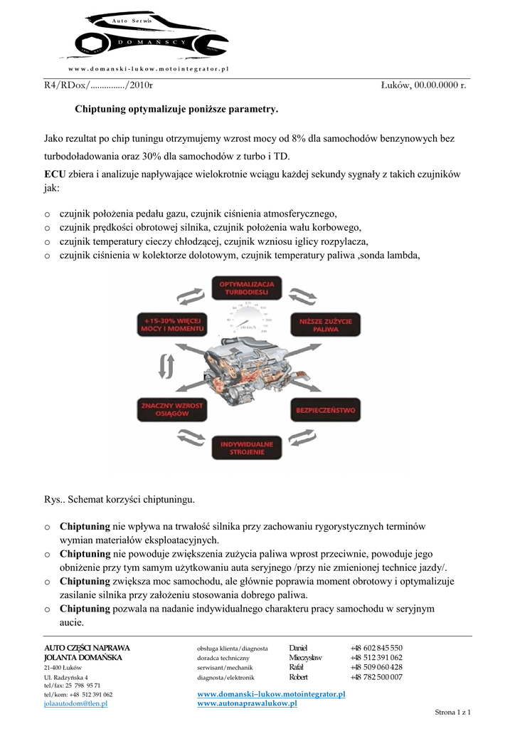 R4/RDox/.............../2010r Łuków, 00.00.0000 r. Chiptuning optymalizuje poniższe parametry. Jako rezultat po chip tuningu otrzymujemy wzrost mocy od 8% dla samochodów benzynowych bez turbodoładowania oraz 30% dla samochodów z turbo i TD. ECU zbiera i analizuje napływające wielokrotnie wciągu każdej sekundy sygnały z takich czujników jak: o o o o czujnik położenia pedału gazu, czujnik ciśnienia atmosferycznego, czujnik prędkości obrotowej silnika, czujnik położenia wału korbowego, czujnik temperatury cieczy chłodzącej, czujnik wzniosu iglicy rozpylacza, czujnik ciśnienia w kolektorze dolotowym, czujnik temperatury paliwa ,sonda lambda, Rys.. Schemat korzyści chiptuningu. o Chiptuning nie wpływa na trwałość silnika przy zachowaniu rygorystycznych terminów wymian materiałów eksploatacyjnych. o Chiptuning nie powoduje zwiększenia zużycia paliwa wprost przeciwnie, powoduje jego obniżenie przy tym samym użytkowaniu auta seryjnego /przy nie zmienionej technice jazdy/. o Chiptuning zwiększa moc samochodu, ale głównie poprawia moment obrotowy i optymalizuje zasilanie silnika przy założeniu stosowania dobrego paliwa. o Chiptuning pozwala na nadanie indywidualnego charakteru pracy samochodu w seryjnym aucie. AUTO CZĘŚCI NAPRAWA JOLANTA DOMAŃSKA obsługa klienta/diagnosta 21-400 Łuków serwisant/mechanik Ul. Radzyńska 4 tel/fax: 25 798 95 71 tel/kom: +48 512 391 062 diagnosta/elektronik [email protected] doradca techniczny Daniel Mieczysław Rafał Robert +48 +48 +48 +48 60 2 8 45 5 50 51 2 3 91 0 62 50 9 0 60 4 28 78 2 5 00 0 07 www.domanski–lukow.motointegrator.pl www.autonaprawalukow.pl Strona 1 z 1