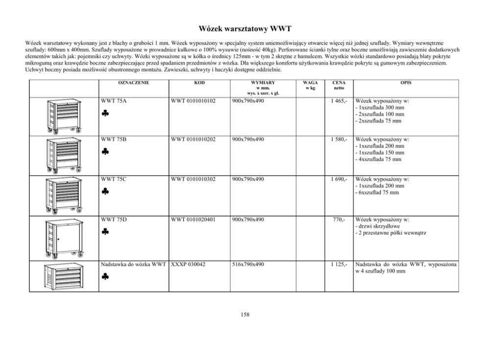 Wózek warsztatowy WWT Wózek warsztatowy wykonany jest z blachy o grubo ci 1 mm. Wózek wyposa ony w specjalny system uniemo liwiaj cy otwarcie wi cej ni jednej szuflady. Wymiary wewn trzne szuflady: 600mm x 400mm. Szuflady wyposa one w prowadnice kulkowe o 100% wysuwie (no no 40kg). Perforowane cianki tylne oraz boczne umo liwiaj zawieszenie dodatkowych elementów takich jak: pojemniki czy uchwyty. Wózki wyposa one s w kółka o rednicy 125mm - w tym 2 skr tne z hamulcem. Wszystkie wózki standardowo posiadaj blaty pokryte mikrogum oraz kraw dzie boczne zabezpieczaj ce przed spadaniem przedmiotów z wózka. Dla wi kszego komfortu u ytkowania kraw dzie pokryte s gumowym zabezpieczeniem. Uchwyt boczny posiada mo liwo obustronnego monta u. Zawieszki, uchwyty i haczyki dost pne oddzielnie. OZNACZENIE WWT 75A KOD WYMIARY w mm. wys. x szer. x gł. WAGA w kg CENA netto WWT 0101010102 900x790x490 1 465,- Wózek wyposa ony w: - 1xszuflada 300 mm - 2xszuflada 100 mm - 2xszuflada 75 mm WWT 0101010202 900x790x490 1 580,- Wózek wyposa ony w: - 1xszuflada 200 mm - 1xszuflada 150 mm - 4xszuflada 75 mm WWT 0101010302 900x790x490 1 690,- Wózek wyposa ony w: - 1xszuflada 200 mm - 6xszuflad 75 mm WWT 0101020401 900x790x490 770,- 516x790x490 1 125,- ♣ WWT 75B ♣ WWT 75C ♣ WWT 75D OPIS ♣ Nadstawka do wózka WWT XXXP 030042 ♣ 158 Wózek wyposa ony w: - drzwi skrzydłowe - 2 przestawne półki wewn trz Nadstawka do wózka WWT, wyposa ona w 4 szuflady 100 mm Rysunek Nazwa wyrobu Kod wyrobu cena netto Opis Wkład szuflady typ A70 XWWT 05060503 65,- Do szuflad o wysoko ci - 70 mm Ilo rz dów – 2 szerokie Wkład szuflady typ A95 XWWT 05060603 70,- Do szuflad o wysoko ci - 95 mm Ilo rz dów – 2 szerokie Wkład szuflady typ A145 XWWT 05060703 75,- Do szuflad o wysoko ci 145 mm Ilo rz dów – 2 szerokie Wkład szuflady typ B70 XWWT 05060504 80,- Do szuflad o wysoko ci - 70 mm Ilo rz dów – 4 w skie Wkład szuflady typ B95 XWWT 05060604 90,- Do szuflad o wysoko ci - 95 mm Ilo rz dów – 4 w skie Wkład szuflady typ B145 XWWT 05060704 95,- Do szuflad o wysoko ci 145 mm Ilo rz dów – 4 w skie Wkład szuflady typ C70 XWWT 05060505 75,- Do szuflad o wysoko ci - 70 mm Ilo rz dów – 2 w skie + 1 szeroki Wkład szuflady typ C95 XWWT 05060605 80,- Do szuflad o wysoko ci - 95 mm Ilo rz dów – 2 w skie + 1 szeroki Wkład szuflady typ C145 XWWT 05060705 85,- Do szuflad o wysoko ci 145 mm Ilo rz dów – 2 w skie + 1 szeroki 159 ! " # "$ % & ' " ((( !" + ! ! ! $%& # ' ' (() $* ' ) * ( # $%& # ' ' (() $* ' ) * ( # $%& # ' ' (() $* ' ) * ( # $%& # ' ' (() $* ' ) * ( # $%& # ' ' (() $* ' ) * ( # $%& # ' ' (() $* ' ) * ( # $%& # ' ' (() $* ' ) * ( # $%& # ' ' (() $* ' ) * ( # $%& # ' ' (() $* ' ) * ( # $%& # ' ' (() $* ' ) * ( " " ! " + ! ,- $% ,- $ & ,- ,- '( ,- ,- $) ,- +" $ ') ,- +" )) ,- " + '# + " !+ + ! # + # !. + " !- / + ! !! + " , + ! + #) ,- " + " 160 * +" ,-. 01 2345 $%& # 6 6 # 7 6 & " + " + + + 2 # 8$ / + // / " !" ! !+ , / + // / " ! ! !. /+ !" + /+ " $ ! / " ! " + / " ! / +-0 ( 6 9: * .- - / +123-. * 4/5 6 7 89 -5 7 ' + + #$ #% $%& # 6 # 6 ) %$ $%& # 6 # 6 &) '$ $%& # 6 # 6 ($ '& $%& # 6 # 6 # '& $%& # 6 # 6 $%& # 6 # 6 &) '$ + 161 / + !+ + / + !. / / , !+ !- + / + / , !. !! /" /" / / / !" ! !+ !, /" /" / / / ! ! !. !! " + " + + + + + # + )$ $%& # 6 # 6 & $%& # 6 # 6 #( $%& # 6 # 6 $%& # 6 # 6 $%& # 6 # 6 $%& # 6 # 6 % % + # 162