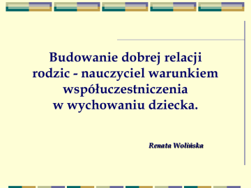 Budowanie dobrej relacji rodzic - nauczyciel warunkiem współuczestniczenia w wychowaniu dziecka. Renata Wolińska „Rodzice są jak ogrodnicy, którzy kupują nasiona. Tyle, że w przypadku dzieci nie ma takich ładnych torebeczek, gdzie widać, co z każdego nasionka wyrośnie i instrukcji, jak się o to nasionko troszczyć . Wszystko jest wymieszane, wsadza się rękę do worka i bierze co popadnie. Gdy rodzice zaczynają hodować swoje nasionko, to mogą mieć marzenie, by wyrósł z niego dąb. Ale może się okazać, że zasadzili bratek. I wtedy rodzic, który się uprze przy dębie, będzie próbował z bratka zrobić dąb. A w rezultacie nie będzie ani dębu, ani bratka. Wyhoduje coś bardzo nieszczęśliwego. I skrzywdzi to nasionko. Mądry rodzic w takiej sytuacji dowie się jak hodować bratki i zrobi wszystko, by jego bratek był jak najbardziej udany.” Wojciech Eichelberger Trójkąt relacji nie ma szans istnienia bez mądrości nauczyciela. Co sprawia, że relacje rodzic- nauczyciel nie zawsze są mocną stroną szkoły? świat, w którym żyjemy jest pełen czynników wywołujących frustrację i niekontrolowane zachowania; świat, w którym żyjemy promuje wszystko to, co idealne; niektórzy ludzie pracujący w szkole nie powinni się tam znaleźć; zbyt częste zmiany w systemie kształtują opinię, że ludzie zajmujący się edukacją nie wiedzą, co robią; rodzice mają problemy rodzinne, osobiste, emocjonalne, zawodowe; rodzice traktują szkołę, jako instytucję świadczącą usługi. TRZY GRUPY RODZICÓW: ZAWSZE „PRZECIW” OBOJĘTNI ZAWSZE „ZA” Materiały szkoleniowe Centrum Arrupe Gdynia Czego oczekują rodzice: silnego przywództwa; skutecznego nauczania; osiągnięć swoich dzieci; profesjonalnej komunikacji; bezpieczeństwa i dyscypliny; zaangażowania; kompetencji. MECHANIZMY OBRONNE o BUDZENIE SIĘ AGRESJI WOBEC DZIECKA I NAUCZYCIELA o ZAPRZECZANIE o ODRZUCANIE AUTORYTETU WYCHOWAWCY o ZWIĘKSZANIE SIĘ POCZUCIA BEZRADNOŚCI o PRZYPISYWANIE WINY CZYNNIKOM ZEWNĘTRZNYM Warunki konstruktywnej rozmowy z rodzicem. Zadbaj o dobry czas i miejsce na rozmowę. Ustal termin spotkania dogodny dla ciebie i drugiej strony. Stwórz atmosferę zaufania i bezpieczeństwa. Doceń fakt, że się spotkaliście. Ustal cel spotkania. Nazwij swoją pozytywną intencję, która motywuje Cię do udzielenia informacji. Wskaż pozytywne doświadczenia i osiągnięcia dziecka. Opisz konkretne obszary, które wymagają pracy. Mów o wynikach obserwacji, a nie o osobie – dokonuj opisu, a nie oceny. Skup się na swoich spostrzeżeniach, a nie na wnioskach. Dziel się pomysłami i informacjami, zamiast dawać dobre rady. Ogranicz się tylko do takiej liczby informacji, którą odbierająca osoba może przyjąć. Podziękuj za rozmowę i staraj się umówić na następny termin spotkania. Co jest problemem? Zdefiniuj go. Co chciałbyś osiągnąć, w jakim celu spotykasz się? Co dla Ciebie będzie w tej rozmowie najtrudniejsze, czego się obawiasz? Co będzie najtrudniejsze dla rodziców, czego się obawiają? Co cennego widzisz w uczniu i jego rodzicach? F Fakty U Ustosunkowanie O Oczekiwania Podawaj fakty - nie uogólniaj, nie oceniaj, nie wracaj do zamierzchłej przeszłości, koncentruj się na aktualnie rozpatrywanej sprawie. Krytykuj konstruktywnie. Konstruktywne krytykowanie: zasada wspólnoty wiedzy; kolejność przekazywanych krytycznych uwag: pozytywna – negatywna – pozytywna; ocena konkretnego zachowania, a nie osoby; określenie celu krytyki; spokojny ton. Przedstaw swoje osobiste ustosunkowanie do sytuacji w kontekście dziecka. Kiedy masz inny pogląd, wyraźnie powiedz, że różnicie się zdaniami. Nie podawaj gotowych rozwiązań, prowadź rozmowę w kierunku poszukiwania rozwiązań. Jednoznacznie określ swoje oczekiwania wobec siebie i rodzica. Pozwól rozmówcy wypowiedzieć swoją opinię. Okaż zrozumienie dla niepokoju, zmartwienia, bezradności rodzica. Rozmawiaj o tym, co należałoby zrobić, a nie ograniczaj się do wymieniania przewinień. Pamiętaj o komunikacji niewerbalnej. Sposoby radzenia sobie z krytyką rodzica: POTWIERDZENIE „Ma Pani rację, nie powinnam była tak postąpić.” „Rzeczywiście nie sprawdziłam jeszcze tych sprawdzianów, a powinnam to zrobić do tej pory.” ZAMGLENIE „Czasem rzeczywiście nie potrafię spokojnie reagować na jego zachowanie.” „Być może jest tak jak Pani twierdzi.” SONDOWANIE „A co złości Panią w tym, że...?” „ Co budzi Pani negatywne emocje w tej sprawie?” I. Dzierzgowska „Rodzice w szkole” J. Sakowska „Szkoła dla rodziców i wychowawców” Cindy J. Christopher „Nauczyciel – rodzic. Skuteczne porozumiewanie się” J. Miluska „Psychologia rozwiązywania problemów szkoły” Elaine K.McEwan „Jak sobie radzić z rodzicami, którzy są źli, zmęczeni, bezradni albo po prostu stuknięci” [email protected]