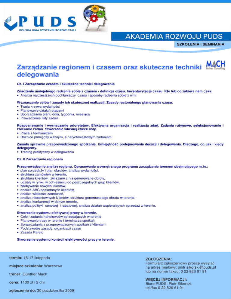 SZKOLENIA I SEMINARIA Zarządzanie regionem i czasem oraz skuteczne techniki delegowania Cz. I Zarządzanie czasem i skuteczne techniki delegowania Znaczenie umiejętnego radzenia sobie z czasem - definicja czasu. Inwentaryzacja czasu. Kto lub co zabiera nam czas. • Analiza najczęstszych pochłaniaczy czasu i sposoby radzenia sobie z nimi Wyznaczanie celów i zasady ich skutecznej realizacji. Zasady racjonalnego planowania czasu. • Twoja krzywa wydajności • Planowanie działań etapami • Sporządzaniu planu dnia, tygodnia, miesiąca • Prowadzenie listy zadań Rozpoznawanie i wyznaczanie priorytetów. Efektywna organizacja i realizacja zdań. Zadania rutynowe, selekcjonowanie i zbieranie zadań. Stworzenie własnej check listy. • Praca z terminarzem • Różnice pomiędzy ważnym, a natychmiastowym zadaniem Zasady sprawnie przeprowadzonego spotkania. Umiejętność podejmowania decyzji i delegowania. Dlaczego, co, jak i kiedy delegujemy. • Trening praktyczny w delegowaniu Cz. II Zarządzanie regionem Przeprowadzenie analizy regionu. Opracowanie wewnętrznego programu zarządzania terenem obejmującego m.in.: • plan sprzedaży i plan obrotów, analiza wydajności, • struktura zamówień w terenie, • struktura klientów i związane z nią generowane obroty, • udziały w rynku w odniesieniu do poszczególnych grup klientów, • zdobywanie nowych klientów, • analiza ABC posiadanych klientów, • analiza wielkości zamówień, • analiza nierentownych klientów, struktura generowanego obrotu w terenie, • analiza konkurencji w danym terenie, • analiza polityki cenowej i rabatowej, analiza działań wspierających sprzedaż w terenie. Stworzenie systemu efektywnej pracy w terenie. • Cele i zadania handlowców sprzedających w terenie • Planowanie trasy w terenie i terminarza spotkań • Sprawozdania z przeprowadzonych spotkań z klientami • Podstawowe zasady organizacji czasu • Zasada Pareto Stworzenie systemu kontroli efektywności pracy w terenie. termin: 16-17 listopada miejsce szkolenia: Warszawa trener: Günther Mach cena: 1130 zł / 2 dni zgłoszenia do: 30 października 2009 ZGŁOSZENIA: Formularz zgłoszeniowy proszę wysyłać na adres mailowy: [email protected] lub na numer faksu: 0 22 826 61 91 WIĘCEJ INFORMACJI: Biuro PUDS: Piotr Sikorski, tel./fax 0 22 826 61 91