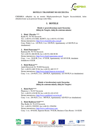 HOTELE I TRANSPORT DO SZCZECINA CHEMIKA odbędzie się na terenie Międzynarodowych Targów Szczecińskich, które zlokalizowane są na prawym brzegu rzeki Odra. I. HOTELE Hotele w prawobrzeżnej części Szczecina (bliżej do Targów, dalej do centrum miasta) 1. Hotel Zbyszko *** Rydla 92, 70-783 Szczecin Tel.: (+48-91) 4313460, 4629071; fax (+48-91) 4313461 Strona internetowa: http://www.hotelzbyszko.com.pl/ Ceny: Pokój 1-os.: 145 PLN, 2-os: 220 PLN, Apartamenty: of 260 PLN (ze śniadaniem) 2. Hotel Panorama*** Radosna 60, 70-752 Szczecin Tel: (+48-91) 466 88 88, fax (+48-91) 466 88 86 Strona internetowa: http://www.hotel-panorama.com.pl Ceny: 1-os.: 30 EUR, 2-os.: 47 EUR, Apartamenty: od 105 EUR, śniadanie dodatkowo 6 EUR 3. Hotel Bończa*** Anieli Krzywoń 18, 70-820 Szczecin Tel.: (+48-91) 469 35 04, fax (+48-91) 469 35 37 Strona internetowa: http://www.hotel-boncza.szczecin.pl/ Ceny: 1-os.: 210 PLN, 2-os.: 260 PLN, Apartamenty: od 350 PLN (ze śniadaniem) Hotele w lewobrzeżnej części Szczecina (bliżej do centrum miasta, dalej do Targów) 1. Hotel Park**** Plantowa 1, 70-527 Szczecin Tel.: (+48-91) 434 00 50, fax (+48-91) 434 45 03 Strona internetowa: http://www.parkhotel.szczecin.pl/ Ceny: 1-os.: 295 PLN, 2-os.: 380 PLN, Apartamenty: 620 PLN (ze śniadaniem) 2. Hotel Radisson SAS**** Plac Rodla 10, 70-419 Szczecin Tel.: (+48-91) 3595595, fax (+48-91) 3594594 Strona internetowa: http://www.radissonsas.com Ceny: 1-os.: 69 EUR, Superior Room: 79 EUR, Business Class Room: 114 EUR Projekt współfinansowany ze środków Europejskiego Funduszu Społecznego oraz środków budżetu państwa w ramach Zintegrowanego Programu Operacyjnego Rozwoju Regionalnego. 3. Atrium Hotel**** Wojska Polskiego 75, 70-481 Szczecin Tel.: (+48-91) 424-35-32, fax (+48-91) 422-10-96 Strona internetowa: http://www.hotel-atrium.pl/ Ceny: 1-os.: 260 PLN, 2-os.: 305 PLN, Apartament: 520 PLN 4. Neptun Orbis Hotel*** Jana Matejki 18, 70-530 Szczecin Telefon: (+48-91) 488 38 83, fax (+48-91) 488 41 17 Strona internetowa: http://www.orbis.pl Ceny: 1-os.: 275 PLN, 2-os.: 315 PLN, Apartament: 470 PLN (ze śniadaniem) Kompletną listę hoteli można znaleźć tutaj: a) http://www.hotels-in-poland.info/hotels-in-szczecin-1.html b) http://www.hoteleszczecin.com.pl/ II. PODRÓŻ Samolotem: Najlepiej do Szczecina dolecieć na jedno z dwóch lotnisk: a) Lotnisko Goleniów (ok. 30 km od Szczecina, przyloty/wyloty tylko z Dublina, Edinburgha, Londynu (Stansted), Oslo i Warszawy) b) Kompleks lotnisk w Berlinie (Tegel, Schonefeld, Tempelhof) (ok. 140 km od Szczecina, loty z całego świata). Z tych lotnisk można dostać się do Szczecina samochodem, busem lub pociągiem. Więcej informacji na temat transportu można znaleźć na stronach internetowych lotnisk: http://www.airport.com.pl (Goleniów) http://www.berlin-airport.de/EN/index.html (Berlin). Busem: Najlepszym sposobem dotarcia z Berlina jest bus. Rekomendujemy następującą firmę transportową: - Interglobus Tour: http://www.interglobus.pl/ - Berlinia: http://www.berlinia.eu - Eurobus24: http://eurobus24.pl/ Koszt podróży ok. 100 PLN Pociągiem: Najnowsze rozkłady jazdy PKP są dostępne pod adresem www.rozklad.pkp.pl Projekt współfinansowany ze środków Europejskiego Funduszu Społecznego oraz środków budżetu państwa w ramach Zintegrowanego Programu Operacyjnego Rozwoju Regionalnego. Międzynarodowe Targi Szczecińskie Ul. Struga 6-8. 70-777 Szczecin Tel. (+48-91) 464 44 01 fax: (+48-91) 464 44 02 www.mts.pl, [email protected] Pozycja GPS: 53°22'56.64" N 14°38'53.11" E Jeżeli chcą Państwo więcej informacji, prosimy o kontakt: Michał Olan ([email protected]) Paweł Żebrowski ([email protected]) Ośrodek Przekazu Innowacji IRC West Poland Szczecin Tel./fax.: (+48-91) 449 41 09 Projekt współfinansowany ze środków Europejskiego Funduszu Społecznego oraz środków budżetu państwa w ramach Zintegrowanego Programu Operacyjnego Rozwoju Regionalnego.
