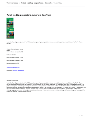 Turystyczne : ?wiat wed?ug reportera. Ameryka ?aci?ska ?wiat wed?ug reportera. Ameryka ?aci?ska ?wiat Wed?ug Reportera jest seri? ksi??ek z zapisem podró?y znanego dziennikarza, prowadz?cego i reportera Wiadomo?ci TVP1- Piotra Kra?ko. Ocena: Nie ma jeszcze oceny Cena Cena netto po rabacie: 3,14 € Cena po rabacie Cena sprzeda?y brutto: 3,42 € Cena sprzeda?y netto: 3,14 € Kwota podatku: 0,28 € Zadaj pytanie o produkt Producent: National Geographic Szczegó?y produktu ?wiat Wed?ug Reportera jest seri? ksi??ek z zapisem podró?y znanego dziennikarza, prowadz?cego i reportera Wiadomo?ci TVP1- Piotra Kra?ko. Eskimosi nauczyli mnie, jak przetrwa?, gdy mróz spada do -50 stopni, przekonali, ?e psie zaprz?gi s? wci?? lepsze od skuterów, a do po?owu wielorybów potrzebna jest trampolina. W moim ulubionym barze w Teksasie na suficie wisz? setki staników, a w?oska mafia znalaz?a na Brooklynie knajp? z najlepszym widokiem na Manhattan. Zdradz?, jak przetrwa? noc na cmentarzu w Tijuanie, pij?c tequil? z grabarzami, i co ukrywaj? tam kartele narkotykowe. A tak?e: co przez okno w swoim domu widzi Dalajlama, jak si? je?dzi na snowboardzie na Saharze i dlaczego gogle potrzebne s? do kolacji w czasie burzy piaskowej. Podam adres sklepu, w którym zakupy robi? zakonnice gotuj?ce dla papie?a i przepis na ulubione spaghetti Mela Gibsona 1 / 1 Powered by TCPDF (www.tcpdf.org)