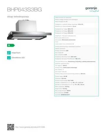 BHP643S3BG okap teleskopowy Okap kuchenny do zabudowy Praca w obiegu otwartym lub zamkniętym Klasa energetyczna: A Wydajność w systemie obiegu otwartego: 518 m³/h Średnica rury odprowadzającej: 15 cm Wydajność na 1 biegu: 260 m³/h Wydajność na 2 biegu: 365 m³/h Wydajność na 3 biegu: 518 m³/h AdaptTech: Tryb pracy automatycznej Sterowanie elektroniczne Sterowanie: Sterowanie sensorowe Timer Liczba stopni mocy wentylatora: 3 Funkcja automatyczngo odświeżania powietrza Miękkie zamykanie Rodzaj oświetlenia: LED AdaptTech Ilość świateł: 2 Moc oświetlenia: 6 W Oświetlenie LED Wydajność dla funkcji Turbo: 655 m3/h Wydajność dla funkcji PowerBoost2: 798 m³/h Filtr przeciwtłuszczowy: Aluminiowy zmywalny z pianką poliuretanową Wskaźnik zapełnienia filtra Filtr węglowy: 530121 Rodzaj silnika: silnik prądu zmiennego Ilość silników: 1 Ilość stopni Turbo: 2 Średnica klapy przeciw-powrotowej powietrza: 150 mm Poziom hałasu: 63 dB Wysokość: 310 mm Roczne zużycie energii: 54,7 kWh Wymiary urządzenia (sz x w x g): 60 × 31 × 31,5 cm Wymiary w opakowaniu (sz x w x g): 70 × 36 × 42 cm Masa urządzenia: 10,9 kg Waga brutto: 13,4 kg Moc przyłączeniowa: 256 W Kod urządzenia: 514465 Kod EAN: 3838942072277 http://www.gorenje.pl/product/514465