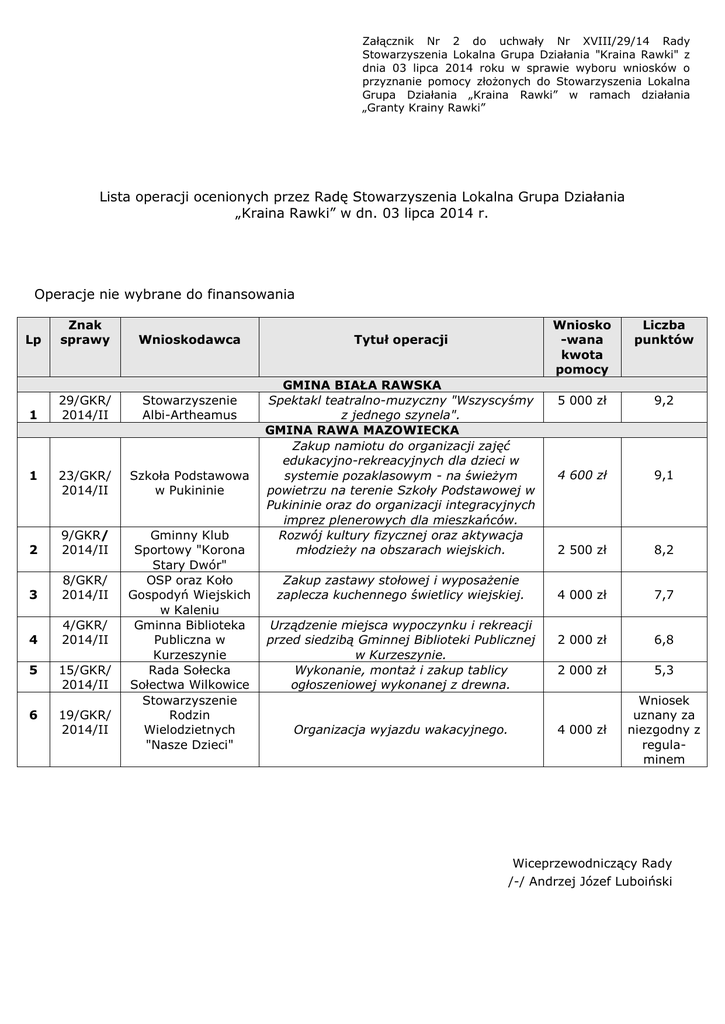 Załącznik Nr 2 do uchwały Nr XVIII/29/14 Rady Stowarzyszenia Lokalna Grupa Działania "Kraina Rawki" z dnia 03 lipca 2014 roku w sprawie wyboru wniosków o przyznanie pomocy złożonych do Stowarzyszenia Lokalna Grupa Działania „Kraina Rawki” w ramach działania „Granty Krainy Rawki” Lista operacji ocenionych przez Radę Stowarzyszenia Lokalna Grupa Działania „Kraina Rawki” w dn. 03 lipca 2014 r. Operacje nie wybrane do finansowania Lp Znak sprawy Wnioskodawca 1 29/GKR/ 2014/II Stowarzyszenie Albi-Artheamus 23/GKR/ 2014/II Szkoła Podstawowa w Pukininie 2 9/GKR/ 2014/II 3 8/GKR/ 2014/II 4 4/GKR/ 2014/II Gminny Klub Sportowy "Korona Stary Dwór" OSP oraz Koło Gospodyń Wiejskich w Kaleniu Gminna Biblioteka Publiczna w Kurzeszynie Rada Sołecka Sołectwa Wilkowice Stowarzyszenie Rodzin Wielodzietnych "Nasze Dzieci" 1 5 15/GKR/ 2014/II 6 19/GKR/ 2014/II Tytuł operacji GMINA BIAŁA RAWSKA Spektakl teatralno-muzyczny "Wszyscyśmy z jednego szynela". GMINA RAWA MAZOWIECKA Zakup namiotu do organizacji zajęć edukacyjno-rekreacyjnych dla dzieci w systemie pozaklasowym - na świeżym powietrzu na terenie Szkoły Podstawowej w Pukininie oraz do organizacji integracyjnych imprez plenerowych dla mieszkańców. Rozwój kultury fizycznej oraz aktywacja młodzieży na obszarach wiejskich. Zakup zastawy stołowej i wyposażenie zaplecza kuchennego świetlicy wiejskiej. Urządzenie miejsca wypoczynku i rekreacji przed siedzibą Gminnej Biblioteki Publicznej w Kurzeszynie. Wykonanie, montaż i zakup tablicy ogłoszeniowej wykonanej z drewna. Organizacja wyjazdu wakacyjnego. Wniosko -wana kwota pomocy Liczba punktów 5 000 zł 9,2 4 600 zł 9,1 2 500 zł 8,2 4 000 zł 7,7 2 000 zł 6,8 2 000 zł 5,3 4 000 zł Wniosek uznany za niezgodny z regulaminem Wiceprzewodniczący Rady /-/ Andrzej Józef Luboiński