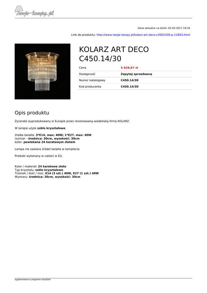 Dane aktualne na dzień: 02-03-2017 19:34 Link do produktu: http://www.twoje-lampy.pl/kolarz-art-deco-c4501430-p-11843.html KOLARZ ART DECO C450.14/30 Cena 5 629,67 zł Dostępność Zapytaj sprzedawcę Numer katalogowy C450.14/30 Kod producenta C450.14/30 Opis produktu Żyrandol wyprodukowany w Europie przez renomowaną wiedeńską firmę KOLARZ. W lampie użyte szkło kryształowe. źródła światła: 3*E14, max: 40W; 1*E27, max: 40W rozmiar - średnica: 30cm, wysokość: 30cm kolor: powlekane 24 karatowym złotem Lampa nie zawiera źródeł światła w komplecie. Produkt wykonany w całości w EU. Kolor / materiał: 24 karatowe złoto Typ kryształu: szkło kryształowe Trzonek / ilość / moc: E14 (3 szt.) 40W, E27 (1 szt.) 40W Wymiary: średnica: 30cm, wysokość: 30cm wygenerowano w programie shopGold Powered by TCPDF (www.tcpdf.org)