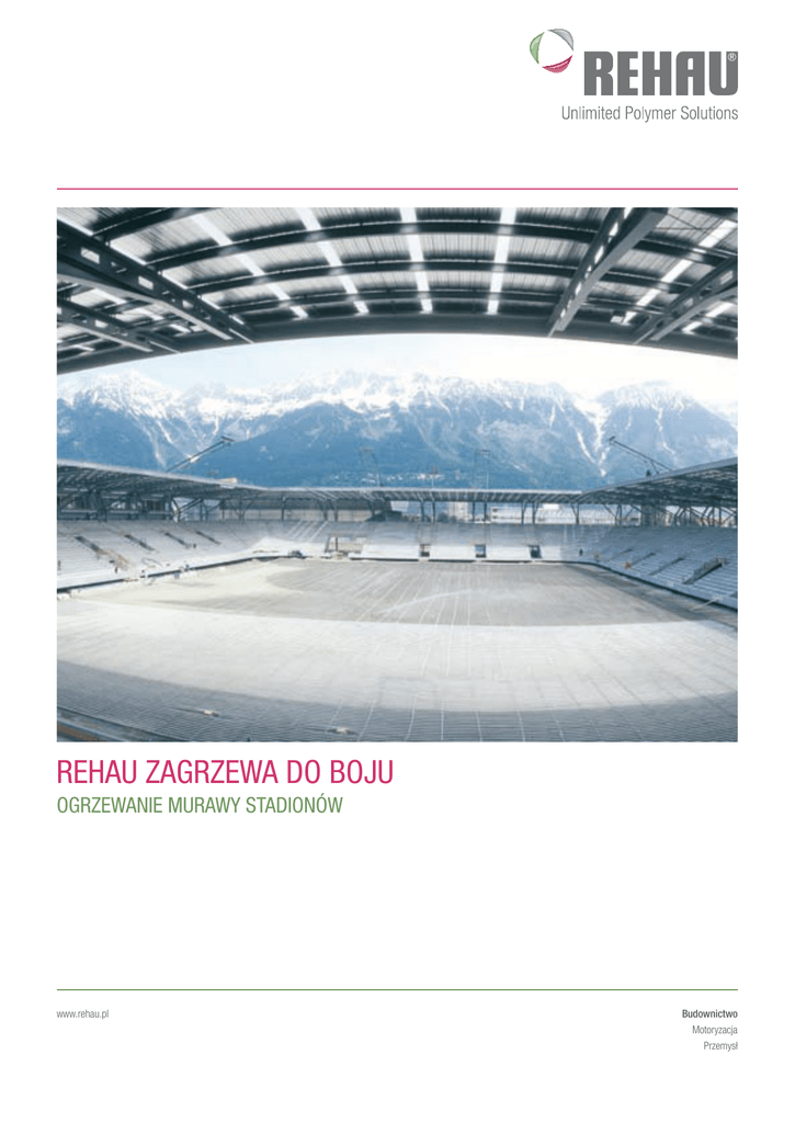 rehau zagrzewa do boju ogrzewanie murawy stadionów www.rehau.pl Budownictwo Motoryzacja Przemysł NAJWYŻSZA JAKOŚĆ DLA NAJLEPSZYCH WYNIKÓW TECHNOLOGIA OGRZEWANIA MURAWY BOISKA Coraz częściej polskie stadiony dorównują rozwiązaniami technologicznymi obiektom sportowym istniejącym na Zachodzie. Standardy europejskie i wymogi licencyjne PZPN sprawiły, iż począwszy od 2003 roku na stadionach klubów Ekstraklasy rozpoczęto prace nad instalacją ogrzewanej murawy. Po raz pierwszy w Polsce system ogrzewania murawy firmy REHAU zainstalowano na stadionie Wisły Kraków. Na krok ten zdecydowano się po gorzkich doświadczeniach z meczów w Pucharze UEFA, kiedy to z powodu zamarzniętej murawy nie doszło do terminowego rozegrania dwumeczu między Wisłą Kraków a Lazio Rzym. By wykluczyć takie przykre niespodzianki w przyszłości, w ciągu 14 dni usunięto starą nawierzchnię i od podstaw wykonano nową, w pełni profesjonalną płytę. 2 Technologia Aby ogrzać murawę, nie niszcząc przy tym trawy, należy zastosować system, który nie doprowadzi do przegrzania korzeni i jednocześnie zapewni odpowiednią temperaturę na powierzchni. Ogrzewanie murawy boiska w systemie REHAU wykorzystuje pętle grzewcze równoległe z jednym nawrotem, na zasadzie pojedynczego zasilania i powrotu. Rury grzewcze montowane na głębokości 25 - 30 cm w warstwie gruntu pospółki o odpowiedniej, laboratoryjnie dobranej granulacji zapewniają temperaturę w strefie korzennej nie przekraczającą 8º C, dzięki czemu nie dochodzi do „ugotowania” korzeni, a tym samym konieczności wymiany kosztownej trawy. Odporność Do pętli grzewczych o długości około 147 m stosuje się rury z najwyższej klasy polietylenu usieciowanego PE-Xa o średnicy 25 x 2,3 mm. Materiałem wejściowym do produkcji PE-Xa jest wysokomolekularny polietylen charakteryzujący się dużą gęstością i wytrzymałością. Dzięki temu już sam materiał podstawowy wyróżnia się szczególną odpornością na uderzenia i udarność. Stosowanie materiału o tak wysokich parametrach uwarunkowane jest trudnymi warunkami budowlanymi oraz naprężeniami, którym jest poddawany system. W tabeli zestawiono parametry dla rur PE-Xa 25 x 2,3 mm zgodnych z wymaganiami technicznymi COBRTI INSTAL i PN-EN ISO 15875-2:2004 (U) „Systemy przewodów rurowych z tworzyw sztucznych do instalacji ciepłej i zimnej wody. Polietylen sieciowany (PE-X). Część 2: Rury” oraz spełniających normy DIN 16892/3. Systemu jednak nie tworzą same rury. Istotnymi elementami mającymi wpływ na szczelność instalacji oraz jej bezawaryjność są odporne na korozję kształtki oraz technologia łączenia rur. W celu uzyskania maksimum szczelności i pewności poprawnego przeprowadzenia połączenia REHAU zastosowało do łączenia rur technikę tulei zaciskowej. Wykorzystuje ona właściwości rur PE-Xa, które po rozszerzeniu wracają do swojej dawnej postaci, ściskając wsuniętą w nie kształtkę. Dodatkowo tuleja zaciskowa nasunięta na połączenie daje mu maksimum szczelności. Prostota wykonania połączenia, możliwość stosowania go w każdych warunkach budowlanych oraz możliwość wzrokowej kontroli są istotnymi atutami tego systemu. Materiał PE-Xa Kolor powierzchni mlecznobiały Udarność przy 20°C bez złamania Udarność przy -20°C bez złamania Średni współczynnik wydłużalności liniowej 0,15 mm/(m K) Współczynnik przewodności cieplnej Szorstkość k • 0,35 W/(m K) • 0,007 mm Ciśnienie robocze (max.) 6 bar Dopuszczalna temperatura robocza (max.) 90 °C Krótkotrwała temperatura max. (awaria) 110 °C Stała materiałowa C 12 Klasa palności B2 Minimalny promień gięcia bez osprzętu 8 x d mm Doświadczenie Dziś już 18 polskich stadionów posiada system wodnego ogrzewania murawy firmy REHAU (stan na styczeń 2009). Należą do nich, obok wspomnianego obiektu Wisły Kraków: Dyskobolia Grodzisk Wielkopolski, Legia Warszawa, Cracovia, Kolporter Kielce, Polonia Warszawa, Stadion Miejski w Poznaniu, Pogoń Szczecin, GKS Bełchatów, Wisła Płock, Górnik Łęczna, Górnik Zabrze, Jagiellonia Białystok, Polonia Bytom, Stadion Śląski, WKS Śląsk Wrocław, Zagłębie Sosnowiec i Stadion Miejski w Bielsku Białej. Generalnymi wykonawcami były firmy Swietelsky GmbH, Zielona Architektura S.J. i Pagro Sp. z o.o., a zastosowane systemy są identyczne z tymi, które REHAU instaluje na najnowocześniejszych stadionach Europy, np. na Bayarenie w Leverkusen czy Stadionie Olimpijskim w Monachium. 3 ogrzewanie murawy stadionów wybrane referencje Stadion Jablonec Stadion Linz Pachtakorstadion Navruzstadion BayArena Boisko treningowe Bayer Leverkusen Bielefelder Alm Weserstadion Gottl.-Daimler-Stadion Westfalenstadion Boisko treningowe 1860 München Frankenstadion SIA Olimpiskais Stadion Boisko treningowe Cleveland Browns Stadium Paul Brown Stadium Boisko treningowe SSV Ulm Boisko treningowe FC Rotor Jugendleiterschule Ruit Boisko treningowe Tivoli Stadion Boisko treningowe SC Freiburg Stadion Kreuzeiche Gottl.-Daimler-Stadion (renowacja, II etap budowy) Boisko treningowe Albena Stadion am Sportpark Boisko treningowe nr 4 Tekmovali Stadion St. Jakobpark Stadion Boisko treningowe Möslestadion Stadion Sparta Praga Stadion Narodowy Hans-Braun-Platz Stadion Teplice Stadion Liberec Stadion Strahov Praga Olympiastadion Boisko treningowe Herta BSC, sztuczna trawa Boisko treningowe 1. FCK Volkswagen Arena Boisko treningowe Torwart Boisko treningowe Stadion Witcovice Stadion Pilsen Boisko treningowe, sztuczna trawa Stadion Wisła Kraków Boisko treningowe, sztuczna trawa Boisko treningowe, sztuczna trawa Stadion Groclin Arena Mönchengladbach Boisko treningowe Mönchengladbach EasyCredit Stadion Commerzbank Stadion Badenova Arena Stadion Erzgebirge Aue AWD Arena Hannover Wedau Stadion Tivoli Stadion Wankdorf Stadion Stadion Legia Warszawa Stadion FC Rubin Stadion Lia Manuliu Allianz Arena 4 Gablonz Linz Taschkent Andizan Leverkusen L