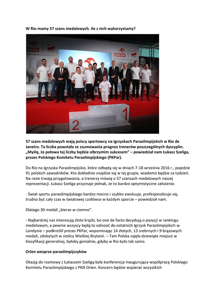 W Rio mamy 57 szans medalowych. Ile z nich wykorzystamy? 57 szans medalowych mają polscy sportowcy na Igrzyskach Paraolimpijskich w Rio de Janeiro. Ta liczba powstała ze zsumowania prognoz trenerów poszczególnych dyscyplin. „Myślę, że połowa tej liczby będzie olbrzymim sukcesem” – powiedział nam Łukasz Szeliga, prezes Polskiego Komitetu Paraolimpijskiego (PKPar). Do Rio na Igrzyska Paraolimpijskie, które odbędą się w dniach 7-18 września 2016 r., pojedzie 91 polskich zawodników. Kto dokładnie znajdzie się w tej grupie, wiadomo będzie za tydzień. Na razie trwają przygotowania, a trenerzy mówią o 57 szansach medalowych naszej reprezentacji. Łukasz Szeliga przyznaje jednak, że to bardzo optymistyczne założenie. - Świat sportu paraolimpijskiego bardzo mocno i szybko ewoluuje, profesjonalizuje się, trudno być cały czas w światowej czołówce w każdym sporcie – powiedział nam. Dlatego 30 medali „bierze w ciemno”. - Najbardziej nas interesują złote krążki, bo one de facto decydują o pozycji w rankingu medalowym, a pewnie wszyscy będą to odnosić do ostatnich Igrzysk Paraolimpijskich w Londynie – podkreślił prezes PKPar, wspominając 14 złotych, 13 srebrnych i 9 brązowych medali, zdobytych w stolicy Wielkiej Brytanii. – Tam Polska zajęła dziewiąte miejsce w klasyfikacji generalnej, byłoby genialnie, gdyby w Rio było tak samo. Orlen wesprze paraolimpijczyków Okazją do rozmowy z Łukaszem Szeligą była konferencja inaugurująca współpracę Polskiego Komitetu Paraolimpijskiego z PKN Orlen. Koncern będzie wspierać wszystkich paraolimpijczyków startujących w Rio, a umowa z PKPar podpisana została na razie do października 2017 r. - Od czterech lat, od Igrzysk Paraolimpijskich w Londynie, aktywnie wspieramy najbardziej utalentowanych niepełnosprawnych lekkoatletów, aż sześciu złotych medalistów jest stypendystami naszego programu „Na Podium” – powiedział Rafał Pasieka, dyrektor wykonawczy ds. marketingu PKN Orlen. – W tym roku zdecydowaliśmy się rozszerzyć naszą działalność sponsoringową i rozpocząć współpracę z Polskim Komitetem Paraolimpijskim. Pragniemy wspierać wszystkich paraolimpijczyków na najbliższych igrzyskach w Rio, a także być aktywnym partnerem Polskiego Komitetu Paraolimpijskiego. Koncern od lat jest sponsorem najlepszych polskich lekkoatletów pełnosprawnych, m.in. kulomiota Tomasza Majewskiego, młociarza Pawła Fajdka czy średniodystansowca Adama Kszczota. Wszyscy oni zaszczycili swoją obecnością konferencję inaugurującą współpracę Orlenu z PKPar. Zawodnicy o swoich szansach Podczas konferencji, 20 lipca 2016 r. w Centrum Olimpijskim w Warszawie, obecni byli także oczywiście paraolimpijczycy, których zapytaliśmy o ich szanse na medale w Rio. - Czołówka urosła w siłę, my się też nie poddajemy – podkreśliła sztangistka Justyna Kozdryk, wicemistrzyni paraolimpijska z Pekinu (2008) w kat. 44 kg. – W sporcie jest naprawdę różnie. Czasami jest tak, że to 100 procent może przyjść za wcześnie, może przyjść trochę później, więc czasami jest ciężko się wstrzelić, ale dążymy ku dobremu i mam nadzieję, że będzie dobrze. - Dla mnie najbardziej satysfakcjonujący byłby wynik poniżej 10,72 sek., dlatego że jest to w dalszym ciągu rekord świata w mojej grupie startowej – powiedział sprinter Michał Derus, dwukrotny mistrz świata na dystansie 100 m. – Nigdy nic nie wiadomo, ale taki wynik jakiś medal powinien dawać. Wiele razy biegałem szybciej, jednak było to na zawodach dla pełnosprawnych, dlatego te wyniki nie mogły być uznawane jako oficjalny rekord świata. - Robię wszystko, żeby w Rio było dobrze, jesteśmy teraz na ostatnim etapie szkoleniowym – zaznaczył skoczek wzwyż Maciej Lepiato, mistrz Igrzysk Paraolimpijskich w Londynie (2012) i trzykrotny mistrz świata. – Myślę, że jestem w dobrym miejscu, bo dwa tygodnie temu na mistrzostwach Polski w bardzo ładnym stylu wyrównałem rekord świata, 218 cm. Jest to obecnie najlepszy wynik na świecie. W rankingu światowym drugi zawodnik ma 207 cm. Ten start w mistrzostwach Polski pokazuje, że spokojnie jestem gotowy na skakanie w granicach ponad 220 cm, dlatego myślę, że na igrzyskach stać mnie na pobicie rekordu świata. Myślę, że będę jednym z głównych faworytów do złotego medalu, jest to oczywiście ogromna presja, ale nieraz pokazałem, że im więcej takich czynników, tym dla mnie lepiej, bo wtedy motywacja jest jeszcze większa. - Już w tym roku pchałem pod 14 metrów, a wydaje mi się, że nie ma za bardzo szans, żeby ktokolwiek był w stanie przebić taki wynik – powiedział z kolei kulomiot Bartosz Tyszkowski, dwukrotny mistrz świata i Europy. – Nigdy nie wiadomo, bo to jest paraolimpiada, zawsze ma swój urok. Tak jak w Londynie nagle pojawił się zawodnik z Chin i zdominował rywalizację, bijąc trzy rekordy świata w pchnięciu kulą, rzucie dyskiem i rzucie oszczepem. Ale dla mnie najważniejsze jest wygrać i znowu pobić rekord świata. - Poprzeczka jest bardzo wysoko postawiona, ponieważ pojawiają się młode zawodniczki, a ja już też młodsza nie jestem – przyznała pływaczka Joanna Mendak, sześciokrotna medalistka paraolimpijska na igrzyskach w Atenach, Pekinie i Londynie. – Co mnie satysfakcjonuje? Trudno powiedzieć. Wydaje mi się, że jako sportowiec mogę świadomie powiedzieć, że czuję się spełniona, ale nie pogardziłabym kolejnym medalem. Bez walki na pewno niczego nie oddam, ale zdaję sobie sprawę, że ranking światowy jest chwilowo dla mnie mniej przychylny. Jednak igrzyska rządzą się swoimi prawami i tego będę się trzymała. Autor: Tomasz Przybyszewski Link do strony: http://niepelnosprawni.pl/ledge/x/335775