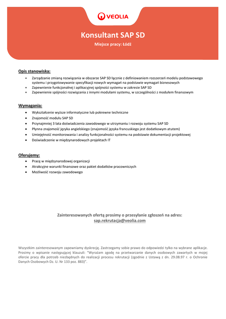 Konsultant SAP SD Miejsce pracy: Łódź Opis stanowiska: Zarządzanie zmianą rozwiązania w obszarze SAP SD łącznie z definiowaniem rozszerzeń modelu podstawowego systemu i przygotowywanie specyfikacji nowych wymagań na podstawie wymagań biznesowych Zapewnienie funkcjonalnej i aplikacyjnej spójności systemu w zakresie SAP SD Zapewnienie spójności rozwiązania z innymi modułami systemu, w szczególności z modułem finansowym Wymagania: Wykształcenie wyższe informatyczne lub pokrewne techniczne Znajomość modułu SAP SD Przynajmniej 3 lata doświadczenia zawodowego w utrzymaniu i rozwoju systemu SAP SD Płynna znajomość języka angielskiego (znajomość języka francuskiego jest dodatkowym atutem) Umiejętność monitorowania i analizy funkcjonalności systemu na podstawie dokumentacji projektowej Doświadczenie w międzynarodowych projektach IT Oferujemy: Pracę w międzynarodowej organizacji Atrakcyjne warunki finansowe oraz pakiet dodatków pracowniczych Możliwość rozwoju zawodowego Zainteresowanych ofertą prosimy o przesyłanie zgłoszeń na adres: [email protected] Wszystkim zainteresowanym zapewniamy dyskrecję. Zastrzegamy sobie prawo do odpowiedzi tylko na wybrane aplikacje. Prosimy o wpisanie następującej klauzuli: “Wyrażam zgodę na przetwarzanie danych osobowych zawartych w mojej ofercie pracy dla potrzeb niezbędnych do realizacji procesu rekrutacji (zgodnie z Ustawą z dn. 29.08.97 r. o Ochronie Danych Osobowych Dz. U. Nr 133 poz. 883)”.