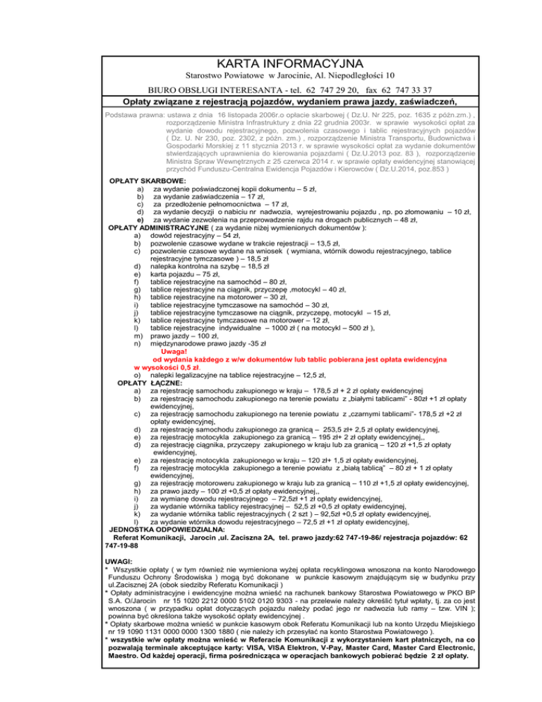 KARTA INFORMACYJNA Starostwo Powiatowe w Jarocinie, Al. Niepodległości 10 BIURO OBSŁUGI INTERESANTA - tel. 62 747 29 20, fax 62 747 33 37 Opłaty związane z rejestracją pojazdów, wydaniem prawa jazdy, zaświadczeń, Podstawa prawna: ustawa z dnia 16 listopada 2006r.o opłacie skarbowej ( Dz.U. Nr 225, poz. 1635 z późn.zm.) , rozporządzenie Ministra Infrastruktury z dnia 22 grudnia 2003r. w sprawie wysokości opłat za wydanie dowodu rejestracyjnego, pozwolenia czasowego i tablic rejestracyjnych pojazdów ( Dz. U. Nr 230, poz. 2302, z późn. zm.) , rozporządzenie Ministra Transportu, Budownictwa i Gospodarki Morskiej z 11 stycznia 2013 r. w sprawie wysokości opłat za wydanie dokumentów stwierdzających uprawnienia do kierowania pojazdami ( Dz.U.2013 poz. 83 ), rozporządzenie Ministra Spraw Wewnętrznych z 25 czerwca 2014 r. w sprawie opłaty ewidencyjnej stanowiącej przychód Funduszu-Centralna Ewidencja Pojazdów i Kierowców ( Dz.U.2014, poz.853 ) OPŁATY SKARBOWE: a) za wydanie poświadczonej kopii dokumentu – 5 zł, b) za wydanie zaświadczenia – 17 zł, c) za przedłożenie pełnomocnictwa – 17 zł, d) za wydanie decyzji o nabiciu nr nadwozia, wyrejestrowaniu pojazdu , np. po złomowaniu – 10 zł, e) za wydanie zezwolenia na przeprowadzenie rajdu na drogach publicznych – 48 zł, OPŁATY ADMINISTRACYJNE ( za wydanie niżej wymienionych dokumentów ): a) dowód rejestracyjny – 54 zł, b) pozwolenie czasowe wydane w trakcie rejestracji – 13,5 zł, c) pozwolenie czasowe wydane na wniosek ( wymiana, wtórnik dowodu rejestracyjnego, tablice rejestracyjne tymczasowe ) – 18,5 zł d) nalepka kontrolna na szybę – 18,5 zł e) karta pojazdu – 75 zł, f) tablice rejestracyjne na samochód – 80 zł, g) tablice rejestracyjne na ciągnik, przyczepę ,motocykl – 40 zł, h) tablice rejestracyjne na motorower – 30 zł, i) tablice rejestracyjne tymczasowe na samochód – 30 zł, j) tablice rejestracyjne tymczasowe na ciągnik, przyczepę, motocykl – 15 zł, k) tablice rejestracyjne tymczasowe na motorower – 12 zł, l) tablice rejestracyjne indywidualne – 1000 zł ( na motocykl – 500 zł ), m) prawo jazdy – 100 zł, n) międzynarodowe prawo jazdy -35 zł Uwaga! od wydania każdego z w/w dokumentów lub tablic pobierana jest opłata ewidencyjna w wysokości 0,5 zł. o) nalepki legalizacyjne na tablice rejestracyjne – 12,5 zł, OPŁATY ŁĄCZNE: a) za rejestrację samochodu zakupionego w kraju – 178,5 zł + 2 zł opłaty ewidencyjnej b) za rejestrację samochodu zakupionego na terenie powiatu z „białymi tablicami” - 80zł +1 zł opłaty ewidencyjnej, c) za rejestrację samochodu zakupionego na terenie powiatu z „czarnymi tablicami”- 178,5 zł +2 zł opłaty ewidencyjnej, d) za rejestrację samochodu zakupionego za granicą – 253,5 zł+ 2,5 zł opłaty ewidencyjnej, e) za rejestrację motocykla zakupionego za granicą – 195 zł+ 2 zł opłaty ewidencyjnej,, d) za rejestrację ciągnika, przyczepy zakupionego w kraju lub za granicą – 120 zł +1,5 zł opłaty ewidencyjnej, e) za rejestrację motocykla zakupionego w kraju – 120 zł+ 1,5 zł opłaty ewidencyjnej, f) za rejestrację motocykla zakupionego a terenie powiatu z „białą tablicą” – 80 zł + 1 zł opłaty ewidencyjnej, g) za rejestrację motoroweru zakupionego w kraju lub za granicą – 110 zł +1,5 zł opłaty ewidencyjnej, h) za prawo jazdy – 100 zł +0,5 zł opłaty ewidencyjnej,, i) za wymianę dowodu rejestracyjnego – 72,5zł +1 zł opłaty ewidencyjnej, j) za wydanie wtórnika tablicy rejestracyjnej – 52,5 zł +0,5 zł opłaty ewidencyjnej, k) za wydanie wtórnika tablic rejestracyjnych ( 2 szt ) – 92,5zł +0,5 zł opłaty ewidencyjnej, l) za wydanie wtórnika dowodu rejestracyjnego – 72,5 zł +1 zł opłaty ewidencyjnej, JEDNOSTKA ODPOWIEDZIALNA: Referat Komunikacji, Jarocin ,ul. Zaciszna 2A, tel. prawo jazdy:62 747-19-86/ rejestracja pojazdów: 62 747-19-88 UWAGI: * Wszystkie opłaty ( w tym również nie wymieniona wyżej opłata recyklingowa wnoszona na konto Narodowego Funduszu Ochrony Środowiska ) mogą być dokonane w punkcie kasowym znajdującym się w budynku przy ul.Zacisznej 2A (obok siedziby Referatu Komunikacji ) * Opłaty administracyjne i ewidencyjne można wnieść na rachunek bankowy Starostwa Powiatowego w PKO BP S.A. O/Jarocin nr 15 1020 2212 0000 5102 0120 9303 - na przelewie należy określić tytuł wpłaty, tj. za co jest wnoszona ( w przypadku opłat dotyczących pojazdu należy podać jego nr nadwozia lub ramy – tzw. VIN ); powinna być określona także wysokość opłaty ewidencyjnej . * Opłaty skarbowe można wnieść w punkcie kasowym obok Referatu Komunikacji lub na konto Urzędu Miejskiego nr 19 1090 1131 0000 0000 1300 1880 ( nie należy ich przesyłać na konto Starostwa Powiatowego ). * wszystkie w/w opłaty można wnieść w Referacie Komunikacji z wykorzystaniem kart płatniczych, na co pozwalają terminale akceptujące karty: VISA, VISA Elektron, V-Pay, Master Card, Master Card Electronic, Maestro. Od każdej operacji, firma pośrednicząca w operacjach bankowych pobierać będzie 2 zł opłaty.