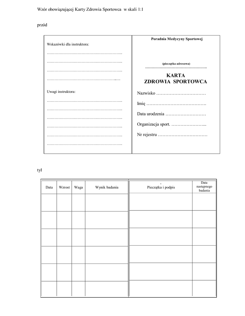Wzór obowiązującej Karty Zdrowia Sportowca w skali 1:1 przód Poradnia Medycyny Sportowej Wskazówki dla instruktora: ………………………………………………….. ………………………………………………….. (pieczątka adresowa) …………………………………………………….. ………………………………………………….. ………………………………………………….. KARTA ZDROWIA SPORTOWCA Uwagi instruktora: Nazwisko …………………………… ………………………………………………….. Imię …………………………………. ………………………………………………….. Data urodzenia ……………………… ………………………………………………….. Organizacja sport. …………………... ………………………………………………….. Nr rejestru …………………………… ………………………………………………….. ………………………………………………….. tył Data Wzrost Waga Wynik badania . Pieczątka i podpis Data następnego badania Badania lekarskie dla sportowców Obowiązujące zalecenia, dotyczące kwalifikacji do sportu oraz kontroli stanu zdrowia osób uprawiających sport: Kwalifikacja dzieci i młodzieży do ukończenia 21 roku życia, ubiegających się o przyznanie licencji na amatorskie uprawianie określonej dyscypliny sportu, jest w gestii lekarza specjalisty w dziedzinie medycyny sportowej. W przypadku braku lekarza specjalisty w dziedzinie medycyny sportowej na danym terenie badania lekarskie przeprowadzają i zaświadczenia wydają lekarze posiadający certyfikat wydany przez Polskie Towarzystwo Medycyny Sportowej (rozp.z 18.07.2003r. Dz.U. 03141 1379). Koszt badań sportowo-lekarskich u zawodników powyżej 21 roku życia uprawiających sport amatorsko oraz profesjonalistów pokrywa klub lub zainteresowany zawodnik. Profilaktyczne badania lekarskie w zakresie kwalifikacji do zajęć wychowania fizycznego i sportu szkolnego wykonuje właściwy dla ucznia lekarz podstawowej opieki zdrowotnej ( rozp MZ i MENiS z 25.06.2003r.)