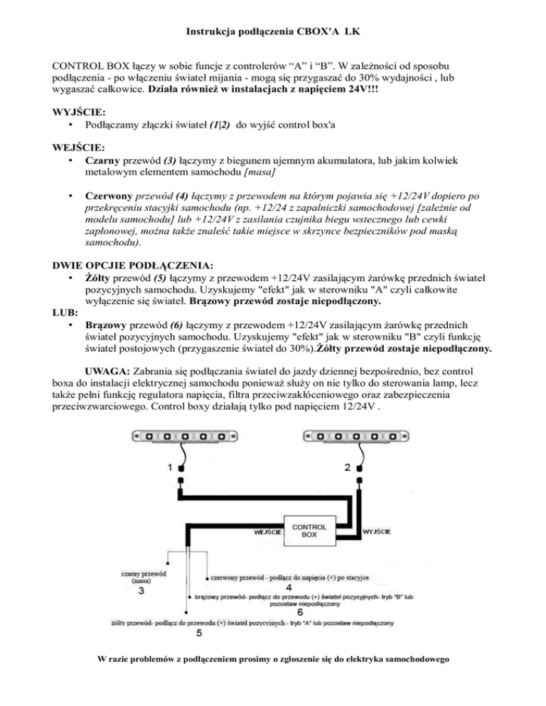 Instrukcja podłączenia CBOX'A LK CONTROL BOX łączy w sobie funcje z controlerów “A” i “B”. W zależności od sposobu podłączenia - po włączeniu świateł mijania - mogą się przygaszać do 30% wydajności , lub wygaszać całkowice. Działa również w instalacjach z napięciem 24V!!! WYJŚCIE: • Podłączamy złączki świateł (1|2) do wyjść control box'a WEJŚCIE: • Czarny przewód (3) łączymy z biegunem ujemnym akumulatora, lub jakim kolwiek metalowym elementem samochodu [masa] • Czerwony przewód (4) łączymy z przewodem na którym pojawia się +12/24V dopiero po przekręceniu stacyjki samochodu (np. +12/24 z zapalniczki samochodowej [zależnie od modelu samochodu] lub +12/24V z zasilania czujnika biegu wstecznego lub cewki zapłonowej, można także znaleść takie miejsce w skrzynce bezpieczników pod maską samochodu). DWIE OPCJIE PODŁĄCZENIA: • Żółty przewód (5) łączymy z przewodem +12/24V zasilającym żarówkę przednich świateł pozycyjnych samochodu. Uzyskujemy "efekt" jak w sterowniku "A" czyli całkowite wyłączenie się świateł. Brązowy przewód zostaje niepodłączony. LUB: • Brązowy przewód (6) łączymy z przewodem +12/24V zasilającym żarówkę przednich świateł pozycyjnych samochodu. Uzyskujemy "efekt" jak w sterowniku "B" czyli funkcję świateł postojowych (przygaszenie świateł do 30%).Żółty przewód zostaje niepodłączony. UWAGA: Zabrania się podłączania świateł do jazdy dziennej bezpośrednio, bez control boxa do instalacji elektrycznej samochodu ponieważ służy on nie tylko do sterowania lamp, lecz także pełni funkcję regulatora napięcia, filtra przeciwzakłóceniowego oraz zabezpieczenia przeciwzwarciowego. Control boxy działają tylko pod napięciem 12/24V . W razie problemów z podłączeniem prosimy o zgłoszenie się do elektryka samochodowego DRL NSSC® Installation Guide CONTROL BOX LK combines friendly features of "A" and "B"other Cboxes. Depending on how you connect - when you turn on low beam - dim to 30% yield, or completely off the lights . It also works in systems with 24V! OUTPUT: • Connect the lights‘ connectors (1|2) to the control box’s output. INPUT: • Black wire (3) connect to a negative battery cable or any other metal element is a car [ground]. • Red wire (4) connect to the wire on which +12/24V appears after turning the ignition switch (for example: +12/24V from car lighter [depend on car] or +12/24V from gearbox reverse sensor or ignition coil. You can also find such place in a fuse box under the hood). TWO METHOD OF CONNECTING: • Yellow wire (5) connect to +12/24V power cable of front position lights. We obtain the effect as in the model "A"- that is completely off the lights. The brown wire is not connected. OR • Brown wire (6) connect to +12/24V power cable of front position lights.We obtain the effect as in the model "B"- light dim to 30%. The yellow wire is not connected. NOTE: Do not connect DRL lights without the control box directly to car‘s electrial system. The control box does not only control lights, but also acts as a voltage regulator, interference eliminator and short circuit protection device. Control boxes operate only voltage of 12/24V.