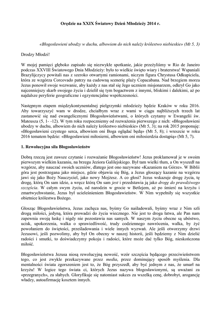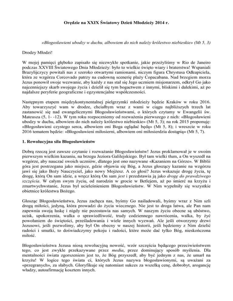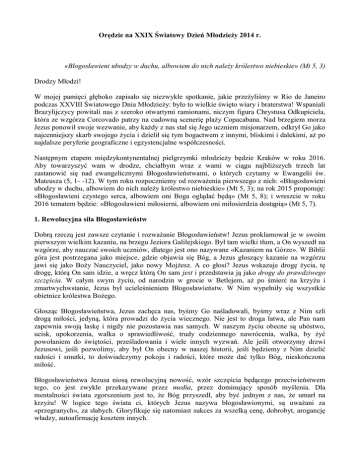 Orędzie na XXIX wiatowy Dzień Młodzieży 2014 r. «Błogosławieni ubodzy w duchu, albowiem do nich należy królestwo niebieskie» (Mt 5, 3) Drodzy Młodzi! W mojej pamięci głęboko zapisało się niezwykłe spotkanie, jakie prze yli my w Rio de Janeiro podczas XXVIII wiatowego Dnia Młodzie yŚ było to wielkie więto wiary i braterstwa! Wspaniali Brazylijczycy powitali nas z szeroko otwartymi ramionami, niczym figura Chrystusa Odkupiciela, która ze wzgórza Corcovado patrzy na cudowną scenerię pla y Copacabana. Nad brzegiem morza Jezus ponowił swoje wezwanie, aby ka dy z nas stał się Jego uczniem misjonarzem, odkrył żo jako najcenniejszy skarb swojego ycia i dzielił się tym bogactwem z innymi, bliskimi i dalekimi, a po najdalsze peryferie geograficzne i egzystencjalne współczesno ci. Następnym etapem międzykontynentalnej pielgrzymki młodzie y będzie Kraków w roku 2016. Aby towarzyszyć wam w drodze, chciałbym wraz z wami w ciągu najbli szych trzech lat zastanowić się nad ewangelicznymi Błogosławieństwami, o których czytamy w źwangelii w. Mateusza (5, 1- -12). W tym roku rozpoczniemy od rozwa enia pierwszego z nichŚ «Błogosławieni ubodzy w duchu, albowiem do nich nale y królestwo niebieskie» (Mt 5, 3)ś na rok 2015 proponujęŚ «Błogosławieni czystego serca, albowiem oni Boga oglądać będą» (Mt 5, 8)ś i wreszcie w roku 2016 tematem będzieŚ «Błogosławieni miłosierni, albowiem oni miłosierdzia dostąpią» (Mt 5, 7). 1. Rewolucyjna siła Błogosławieństw Dobrą rzeczą jest zawsze czytanie i rozwa anie Błogosławieństw! Jezus proklamował je w swoim pierwszym wielkim kazaniu, na brzegu Jeziora żalilejskiego. Był tam wielki tłum, a On wyszedł na wzgórze, aby nauczać swoich uczniów, dlatego jest ono nazywane «Kazaniem na żórze». W Biblii góra jest postrzegana jako miejsce, gdzie objawia się Bóg, a Jezus głoszący kazanie na wzgórzu jawi się jako Bo y Nauczyciel, jako nowy Moj esz. A co głosi? Jezus wskazuje drogę ycia, tę drogę, którą On sam idzie, a wręcz którą On sam jest i przedstawia ją jako drogę do prawdziwego szczęścia. W całym swym yciu, od narodzin w grocie w Betlejem, a po mierć na krzy u i zmartwychwstanie, Jezus był uciele nieniem Błogosławieństw. W Nim wypełniły się wszystkie obietnice królestwa Bo ego. żłosząc Błogosławieństwa, Jezus zachęca nas, by my żo na ladowali, by my wraz z Nim szli drogą miło ci, jedyną, która prowadzi do ycia wiecznego. Nie jest to droga łatwa, ale Pan nam zapewnia swoją łaskę i nigdy nie pozostawia nas samych. W naszym yciu obecne są ubóstwo, ucisk, upokorzenia, walka o sprawiedliwo ć, trudy codziennego nawrócenia, walka, by yć powołaniem do więto ci, prze ladowania i wiele innych wyzwań. Ale je li otworzymy drzwi Jezusowi, je li pozwolimy, aby był On obecny w naszej historii, je li będziemy z Nim dzielić rado ci i smutki, to do wiadczymy pokoju i rado ci, które mo e dać tylko Bóg, nieskończona miło ć. Błogosławieństwa Jezusa niosą rewolucyjną nowo ć, wzór szczę cia będącego przeciwieństwem tego, co jest zwykle przekazywane przez media, przez dominujący sposób my lenia. Dla mentalno ci wiata zgorszeniem jest to, e Bóg przyszedł, aby być jednym z nas, e umarł na krzy u! W logice tego wiata ci, których Jezus nazywa błogosławionymi, są uwa ani za «przegranych», za słabych. żloryfikuje się natomiast sukces za wszelką cenę, dobrobyt, arogancję władzy, autoafirmację kosztem innych. Drodzy młodzi, Jezus wzywa nas, aby my odpowiedzieli na Jego propozycję ycia, aby my zdecydowali, jaką drogą chcemy i ć, eby osiągnąć prawdziwą rado ć. Jest to wielkie wyzwanie wiary. Jezus nie bał się zapytać swoich uczniów, czy chcą rzeczywi cie pój ć za Nim, czy te raczej odej ć i chodzić innymi drogami (por. J 6, 67). A Szymon zwany Piotrem miał odwagę powiedziećŚ «Panie, do kogó pójdziemy? Ty masz słowa ycia wiecznego» (J 6, 68). Je li i wy będziecie umieli powiedzieć Jezusowi «tak», to wasze młode ycie wypełni się znaczeniem i tym samym będzie owocne. 2. Odwaga szczę cia Ale co to znaczy «błogosławieni» (po grecku makarioi)? Błogosławiony znaczy szczę liwy. Powiedzcie miŚ czy naprawdę pragniecie szczę cia? W epoce, w której jeste my pociągani przez liczne iluzje szczę cia, grozi nam, e zadowolimy się byle czym, e nasza wizja ycia będzie mało ambitna. Dą cie natomiast do tego, co wielkie! Poszerzcie wasze serca! Jak mówił bł. Piergiorgio ŻrassatiŚ « ycie bez wiary, bez dziedzictwa, którego się broni, bez podtrzymywania prawdy w nieustannej walce, to jest nie ycie, lecz wegetacja. My nigdy nie powinni my wegetować, zawsze powinni my yć» (List do I. Bonini, 27 lutego 1925 r.). W dniu beatyfikacji Piergiorgia Frassatiego, 20 maja 1990r., papie Jan Paweł II nazwał go «człowiekiem błogosławieństw» (Homilia podczas Mszy w.Ś AAS 82 [ 1990], 1518). Je li naprawdę pozwolicie, by ujawniły się najgłębsze oczekiwania waszego serca, to zdacie sobie sprawę, e jest w was niegasnące pragnienie szczę cia, a to pozwoli wam zdemaskować i odrzucić wiele «tanich» ofert, jakie znajdujecie wokół siebie. Kiedy poszukujemy sukcesu, przyjemno ci, egoistycznego posiadania i czynimy z tego bo ki, mo emy nawet doznawać chwilowego upojenia, fałszywego poczucia zaspokojenia, ale w końcu stajemy się niewolnikami, nigdy nie jeste my zadowoleni, jeste my pobudzani, by szukać coraz więcej. Bardzo smutno widzieć młodzie «sytą», ale słabą. w. Jan pisząc do młodych mówiłŚ «Jeste cie mocni i nauka Bo a trwa w was, i zwycię yli cie Złego» (1 J 2, 14). Ludzie młodzi, którzy wybierają Chrystusa, są silni, karmią się Jego Słowem i nie «opychają się» innymi rzeczami! Miejcie odwagę i ć pod prąd. Miejcie odwagę prawdziwego szczę cia! Powiedzcie «nie» kulturze tymczasowo ci, powierzchowno ci i odrzucenia, która nie wierzy, e potrafici