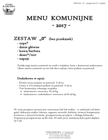 ZESTAW „0” - przyjęcie do 2,5- 3 godzin MENU KOMUNIJNE - 2017 ZESTAW „0” (bez przekąsek) - zupa* - danie główne - kawa/herbata - deser*/tort - napoje *każdą zupę można zamienić na rosół z wiejskiej kury z domowym makaronem *deser można zamienić na tort lub dwa rodzaje ciasta podane na paterach Dodatkowo w opcji: - Świeże owoce podane na paterach 5 zł/os. - Ciasta w 2-3 smakach podane na paterach 8 zł/os. - Tort komunijny własnego wypieku: śmietanowo- owocowy 55 zł/kg śmietanowo- czekoladowo- owocowy od 55 zł/kg W cenie przyjęcia zawarte jest: rezerwacja Sali lub stołów - w zależności od ilości gości, dekoracja stołów (obrusy, organza, serwetki, kielichy, świece), kompozycja kwiatowa z żywych kwiatów, przygotowanie przyjęcia i obsługa kelnerska. Propozycje przygotowane są dla min. 15 osób, przy mniejszej ilości gości dopłata (2-7 zł). STARA KARCZMA ul. Traugutta 48 tel. (55) 235-05-05, kom. 668-504-999 www.starakarczma.elblag.pl biuro@ starakarczma.elblag.pl ZESTAW „0” - przyjęcie do 2,5- 3 godzin I. Propozycja menu na Komunię Zupa: Rosół z wiejskiej kury z domowym makaronem Danie główne: Kieszonki ze schabu nadziewane pieczarkami z cebulką w sosie śmietanowopieczarkowym lub Roladka drobiowa faszerowana warzywami (proszę wybrać) Młode ziemniaki, gotowane, oprószone świeżym koperkiem Duet surówek: biała kapusta + marchewka z jabłkiem Deser: Torcik wiśniowy z bitą śmietaną na musie z malin Napoje: Kawa / Herbata Sok jabłkowy + Woda mineralna z cytryną (0,5 lit. /os.) Koszt na osobę: 70 zł II. Propozycja menu na Komunię Zupa*: Krem z pomidorów z domowymi kluseczkami Danie główne: Polędwiczka wieprzowa przyrządzona metodą sous-vide podana na sosie kurkowo- pieczarkowym Opiekane młode ziemniaki Duet surówek: wiosenna + marchewka z jabłkiem Deser: Szarlotka na ciepło z lodami waniliowymi i bitą śmietaną Napoje: Kawa / Herbata Sok jabłkowy + Woda mineralna z cytryną (0,5 lit./os.) Koszt na osobę: 78 zł STARA KARCZMA ul. Traugutta 48 tel. (55) 235-05-05, kom. 668-504-999 www.starakarczma.elblag.pl biuro@ starakarczma.elblag.pl ZESTAW „0” - przyjęcie do 2,5- 3 godzin III. Propozycja menu na Komunię (3 rodz. mięs na półmiskach) - 1.5 porcji/ osobę - Zupa*: Krem z białych warzyw z chipsem z boczku Danie główne: Kieszonki ze schabu nadziewane pieczarkami z cebulką w sosie śmietanowopieczarkowym Zraziki wieprzowe z farszem staropolskim w sosie pieczeniowym Kotlet drobiowy w chrupiącej panierce Ziemniaki oprószone świeżym koperkiem Opiekane ziemniaki Zestaw surówek: biała kapusta + marchewka z jabłkiem + buraczki Deser: Włoskie Tiramisu na bazie naturalnego biszkoptu i mascarpone Napoje: Kawa / Herbata Sok jabłkowy + Woda mineralna z cytryną (0,5 lit./os.) Koszt na osobę: 85 zł IV. Propozycja menu na Komunię (3 rodz. mięs na półmiskach) - 1.5 porcji/ osobę - Przystawka: Mix sałat z pomidorkami, sosem winegret i prażonym słonecznikiem Zupa: Rosół z wiejskiej kury z domowym makaronem Danie główne: Polędwiczki wieprzowe przyrządzone metodą sous-vide w sosie kurkowopieczarkowym Roladka drobiowa nadziewana warzywami podana na aromatycznym sosie śmietanowo-porowym Tradycyjny kotlet ze schabu Ziemniaki oprószone świeżym koperkiem Opiekane ziemniaki Zestaw surówek: wiosenna + marchewka z jabłkiem + buraczki STARA KARCZMA ul. Traugutta 48 tel. (55) 235-05-05, kom. 668-504-999 www.starakarczma.elblag.pl biuro@ starakarczma.elblag.pl ZESTAW „0” - przyjęcie do 2,5- 3 godzin Deser: Szarlotka na ciepło z lodami waniliowymi i bitą śmietaną Owoce: Świeże owoce podane na paterach Napoje: Kawa / Herbata Sok jabłkowy, pomarańczowy + Woda mineralna z cytryną (0,5 lit./os.) Koszt na osobę: 95 zł STARA KARCZMA ul. Traugutta 48 tel. (55) 235-05-05, kom. 668-504-999 www.starakarczma.elblag.pl biuro@ starakarczma.elblag.pl