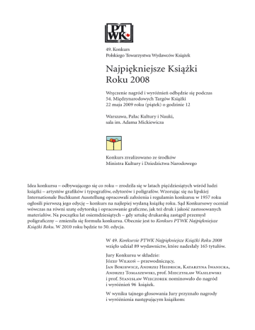 49. Konkurs Polskiego Towarzystwa Wydawców Ksià˝ek Najpi´kniejsze Ksià˝ki Roku 2008 Wr´czenie nagród i wyró˝nieƒ odb´dzie si´ podczas 54. Mi´dzynarodowych Targów Ksià˝ki 22 maja 2009 roku (piàtek) o godzinie 12 Warszawa, Pa∏ac Kultury i Nauki, sala im. Adama Mickiewicza Konkurs zrealizowano ze Êrodków Ministra Kultury i Dziedzictwa Narodowego Idea konkursu – odbywajàcego si´ co roku – zrodzi∏a si´ w latach pi´çdziesiàtych wÊród ludzi ksià˝ki – artystów grafików i typografów, edytorów i poligrafów. Wzorujàc si´ na lipskiej Internationale Buchkunst Ausstellung opracowali za∏o˝enia i regulamin konkursu w 1957 roku og∏osili pierwszà jego edycj´ – konkurs na najlepiej wydanà ksià˝k´ roku. Sàd Konkursowy ocenia∏ wówczas na równi szat´ edytorskà i opracowanie graficzne, jak te˝ druk i jakoÊç zastosowanych materia∏ów. Na poczàtku lat osiemdziesiàtych – gdy sztuk´ drukarskà zastàpi∏ przemys∏ poligraficzny – zmieni∏a si´ formu∏a konkursu. Obecnie jest to Konkurs PTWK Najpi´kniejsze Ksià˝ki Roku. W 2010 roku b´dzie to 50. edycja. W 49. Konkursie PTWK Najpi´kniejsze Ksià˝ki Roku 2008 wzi´∏o udzia∏ 89 wydawnictw, które nades∏a∏y 165 tytu∏ów. Jury Konkursu w sk∏adzie: Józef Wilkoƒ – przewodniczàcy, Jan Bokiewicz, Andrzej Heidrich, Katarzyna Iwanicka, Andrzej Tomaszewski, prof. Mieczys∏aw Wasilewski i prof. Stanis∏aw Wieczorek nominowa∏o do nagród i wyró˝nieƒ 96 ksià˝ek. W wyniku tajnego g∏osowania Jury przyzna∏o nagrody i wyró˝nienia nast´pujàcym ksià˝kom: Dzia∏ I – Literatura pi´kna NAGRODY nie przyznano WYRÓ˚NIENIA Bliskie wody – Julien Gracq projekt ok∏adki i rysunki: Magdalena Koziak wydawca: Wydawnictwo AUSTERIA druk i oprawa: Drukarnia Narodowa S.A. w Krakowie Poezje zebrane – Bruno Jasieƒski projekt typograficzny i projekt ok∏adki: Stanis∏aw Salij wydawca: Wydawnictwo S¸OWO/OBRAZ TERYTORIA sk∏ad: Grzegorz Zazulak i Maciej Goldfarth druk i oprawa: OZGraf Olsztyƒskie Zak∏ady Graficzne S.A. Nike, która si´ waha – Zbigniew Herbert projekt graficzny: Ryszard Szczawiƒski wydawca: Wydawnictwo CZYSTY WARSZTAT i Biblioteka Narodowa druk i oprawa: GRAFIX Centrum Poligrafii w Gdaƒsku NOMINACJE Dwie strony medalu – Tadeusz Ró˝ewicz opracowanie graficzne: Piotr Gidlewski wydawca: Paƒstwowy Instytut Wydawniczy druk i oprawa: Drukarnia Naukowo-Techniczna Oddzia∏ PAP S.A. w Warszawie Paryski splin – Charles Baudelaire projekt graficzny i typograficzny: Stanis∏aw Salij wydawca: Wydawnictwo S¸OWO/OBRAZ TERYTORIA t∏oczenie i druk: Drukarnia MIREX s.c. Leszek Chmielewski w Mirotkach Listy mi∏osne – Flawiusz Filostratos projekt ok∏adki i opracowanie graficzne: Tomasz Jaroszewski wydawca: Wydawnictwo Naukowe Uniwersytetu Miko∏aja Kopernika w Toruniu druk i oprawa: Drukarnia EXPOL P. Rybiƒski, J. Dàbek Spó∏ka Jawna we W∏oc∏awku Most przez Styks. Opowiadania wybrane – Zygmunt Krzy˝anowski opracowanie graficzne: Zygmunt Januszewski opracowanie typograficzne: Wiktor J´drzejec wydawca: Paƒstwowy Instytut Wydawniczy sk∏ad i ∏amanie: Pracownia Poligraficzno-Wydawnicza ANTER w Warszawie druk i oprawa: Drukarnia Wydawnicza im.W. L. Anczyca S.A. w Krakowie Ciotka Julia i skryba – Mario Vargas Llosa projekt ok∏adki: Katarzyna Borkowska, opracowanie typograficzne: Daniel Malak wydawca: Spo∏eczny Instytut Wydawniczy ZNAK druk i oprawa: Rzeszowskie Zak∏ady Graficzne SA Seria Poetycka: Europejski poeta wolnoÊci. Nominacje projekt graficzny: Janusz Górski wydawca: Wydawnictwo CZYSTY WARSZTAT pude∏ko: PRACOWNIA Sp. z o.o. w Gdaƒsku druk i oprawa: GRAFIX Centrum Poligrafii w Gdaƒsku Wiersze Êródziemnomorskie. Ciemne Êwiat∏o – Aleksander Wat projekt graficzny i typograficzny: Janusz Górski wydawca: Wydawnictwo CZYSTY WARSZTAT druk i oprawa: Zak∏ad Poligraficzno-Wydawniczy POZKAL w Inowroc∏awiu Go∏´bica w rozpadlinach skalnych – Danuta Micha∏owska projekt graficzny: W∏adys∏aw Pluta wydawca: Oficyna Wydawnicza KWADRAT przygotowanie do druku: Us∏ugi Poligraficzne SKONTO Zbigniew Su∏kowski w Krakowie druk i oprawa: Drukarnia SKLENIARZ w Krakowie Casa di Stasys. Szkicownik – Stasys Eidrigevičius projekt graficzny: Andrzej Stroka wydawca: Paƒstwowy Instytut Wydawniczy przygotowanie do druku: Studio Grafiki Komputerowej ARTPRESS w Inowroc∏awiu druk i oprawa: Zak∏ad Poligraficzno-Wydawniczy POZKAL w Inowroc∏awiu Dzia∏ II – Ksià˝ki naukowe, popularnonaukowe (humanistyka) NAGRODY Miejsce malarstwa. Wydzia∏ Malarstwa Akademii Sztuk Pi´knych w Warszawie 1948-2008 – Wojciech W∏odarczyk projekt graficzny: Pawe∏ Osial wydawca: Akademia Sztuk Pi´knych w Warszawie druk i oprawa: Drukarnia KNOW-HOW w Krakowie 200 dni Napoleona. Od Pu∏tuska do Tyl˝y 1806-1807 – Andrzej Nieuwa˝ny, Krzysztof Ostrowski, Tomasz St´pieƒ koncepcja i opracowanie graficzne: Lech Majewski wydawca: Przedsi´biorstwo Wydawnicze RZECZPOSPOLITA i Akademia Humanistyczna im. Aleksandra Gieysztora w Pu∏tusku druk i oprawa: OZGraf Olsztyƒskie Zak∏ady Graficzne S.A. WYRÓ˚NIENIA LeÊmian, LeÊmian... – Adam Wies∏aw Kulik projekt graficzny i typograficzny: Stanis∏aw Salij i Joanna Kwiatkowska wydawca: Wydawnictwo S¸OWO/OBRAZ TERYTORIA sk∏ad: Maciej Goldfarth druk i oprawa: ¸ódzka Drukarnia Dzie∏owa S.A. Utopia nad Wis∏à. Historia Peerelu – Antoni Dudek, Zdzis∏aw Zblewski projekt typograficzny i projekt ok∏adki: Witold Siemaszkiewicz wydawca: Redakcja Wydawnictwa Szkolnego PWN w Bielsku-Bia∏ej sk∏ad: Ryszard Bryzek i El˝bieta Wiencek druk i oprawa: Drukarnia Wydawnicza im. W. L. Anczyca S.A. w Krakowie ArtyÊci sceny polskiej w ZASP 1918-2008 – praca zbiorowa pod redakcjà Andrzeja Rozhina opracowanie graficzne: Justyna Czerniakowska wspó∏praca: ¸ukasz Sawicki i Eugeniusz D. ¸ukasiak, wydawca: Zwiàzek Artystów Scen Polskich druk i oprawa: Przedsi´biorstwo Us∏ugowoHa